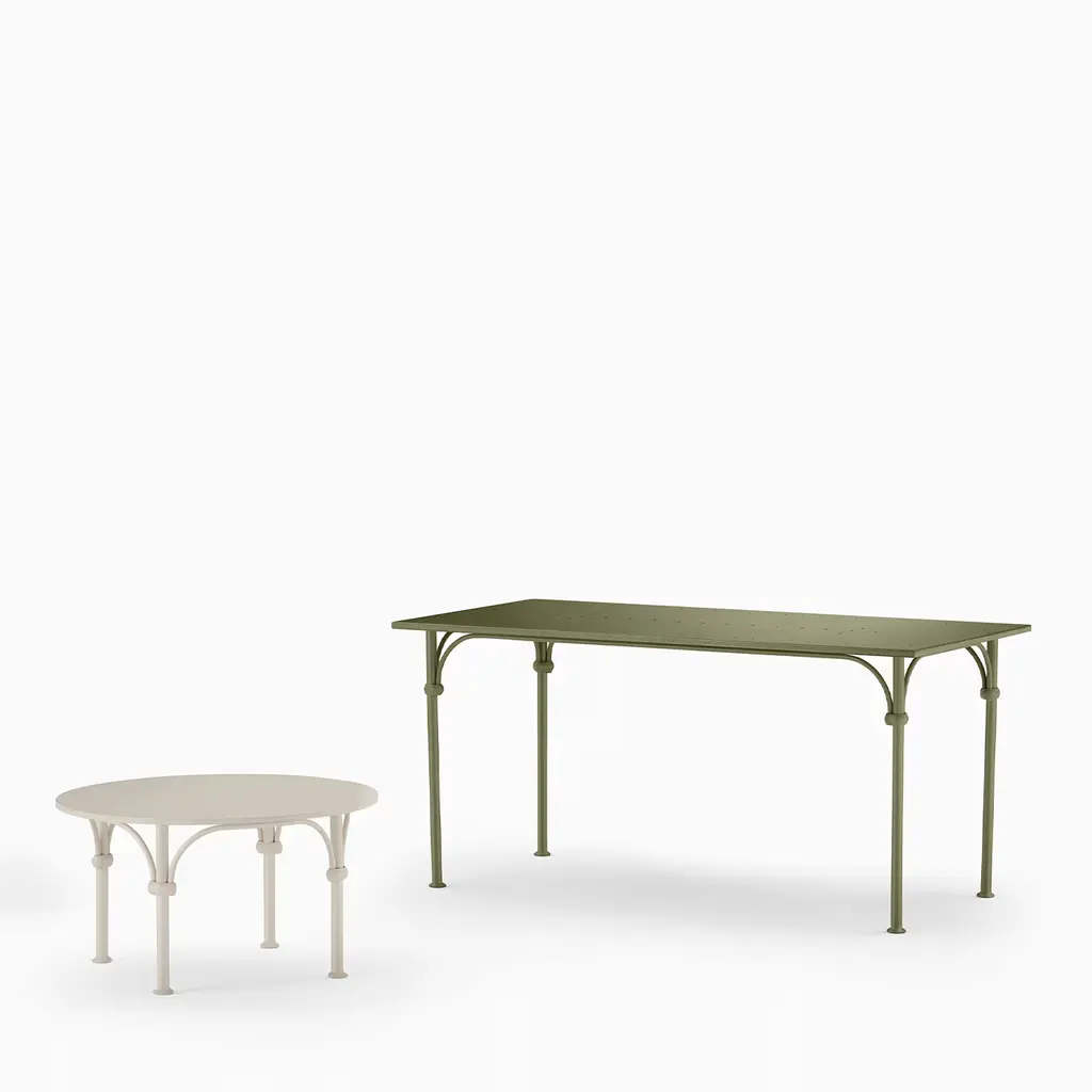 Harmonious proportions and elegant curved accents lend this rectangular table its distinctive graceful look. Powder-coated in a fresh and refined sage-green tone, the galvanized metal structure ensures exceptional weatherability and indeed suggests its safe positioning in sophisticated patios or terraces. Please explore the thirteen available matte color variants by contacting the Concierge.