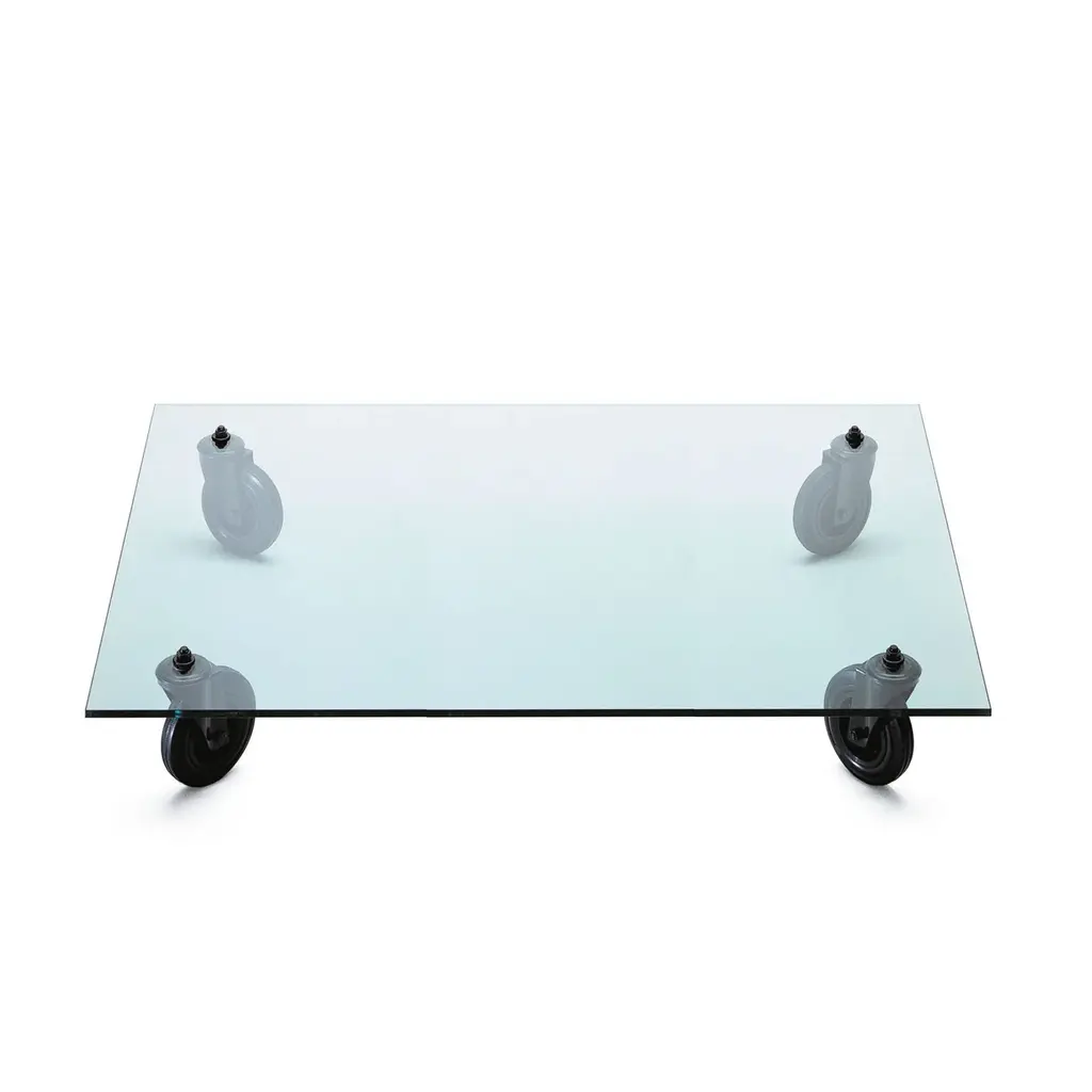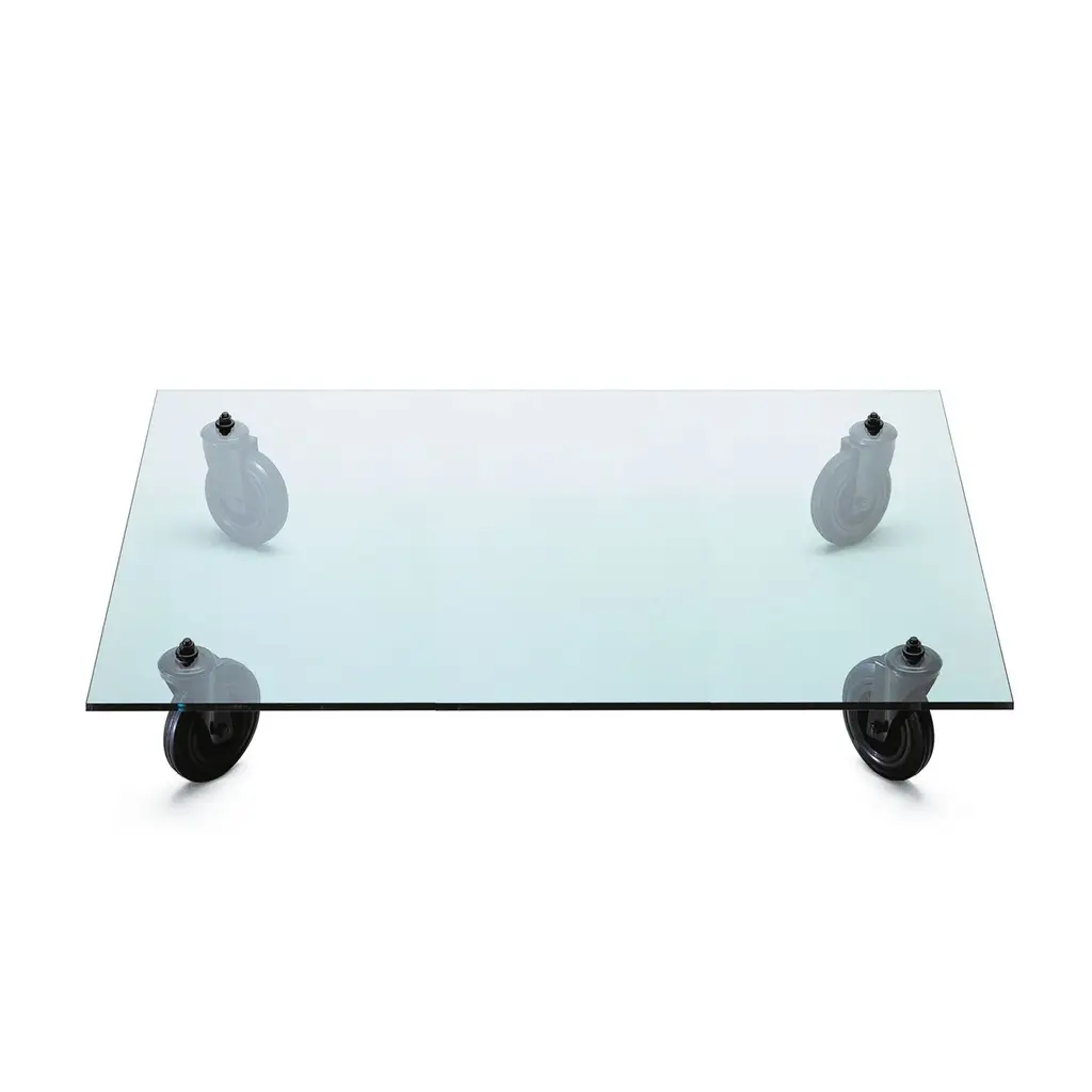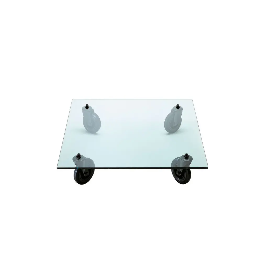 An industrial trolley used at the FontanaArte plant to transport glass: this was the object that inspired Gae Aulenti to design her Tavolo con Ruote. It is a specimen of intuitive design that skips the drawing board stage and goes straight from the idea of an everyday item to the prototype stage. This wheeled table replaces the factory trolley’s wooden shelf with a chunky sheet of beveled glass – a tribute to the company’s production history – and fits free-rolling industrial wheels. The nature of the object and its intended use are transformed by replacing just one simple part. Features