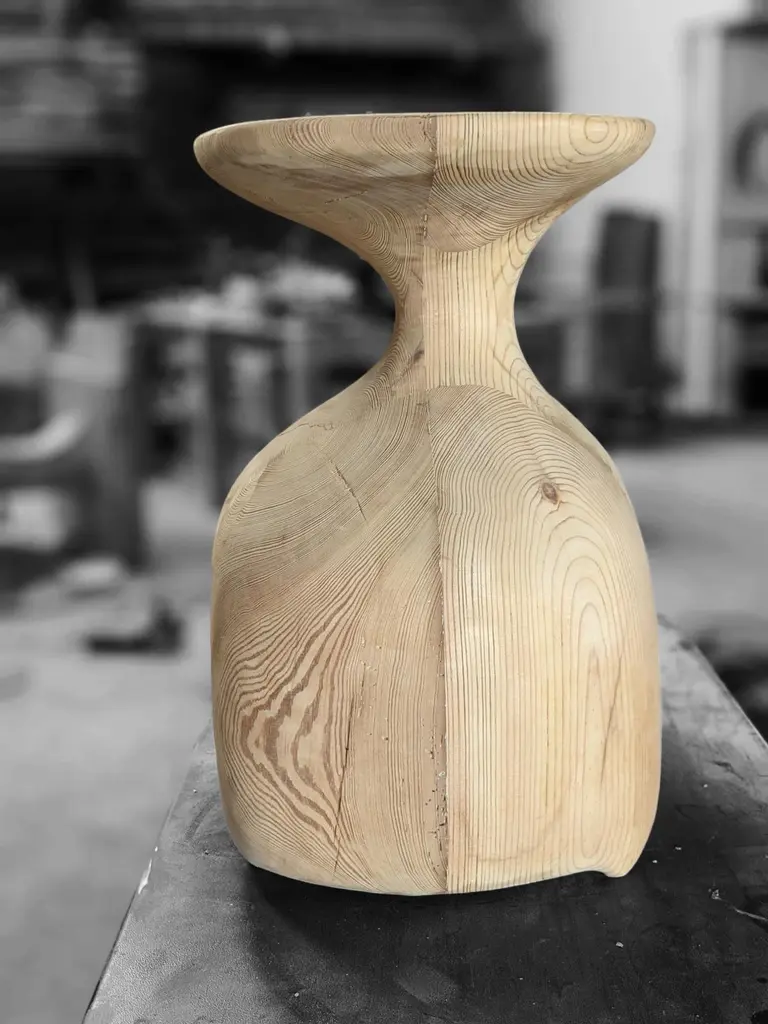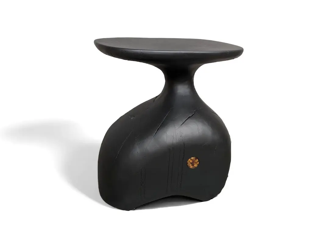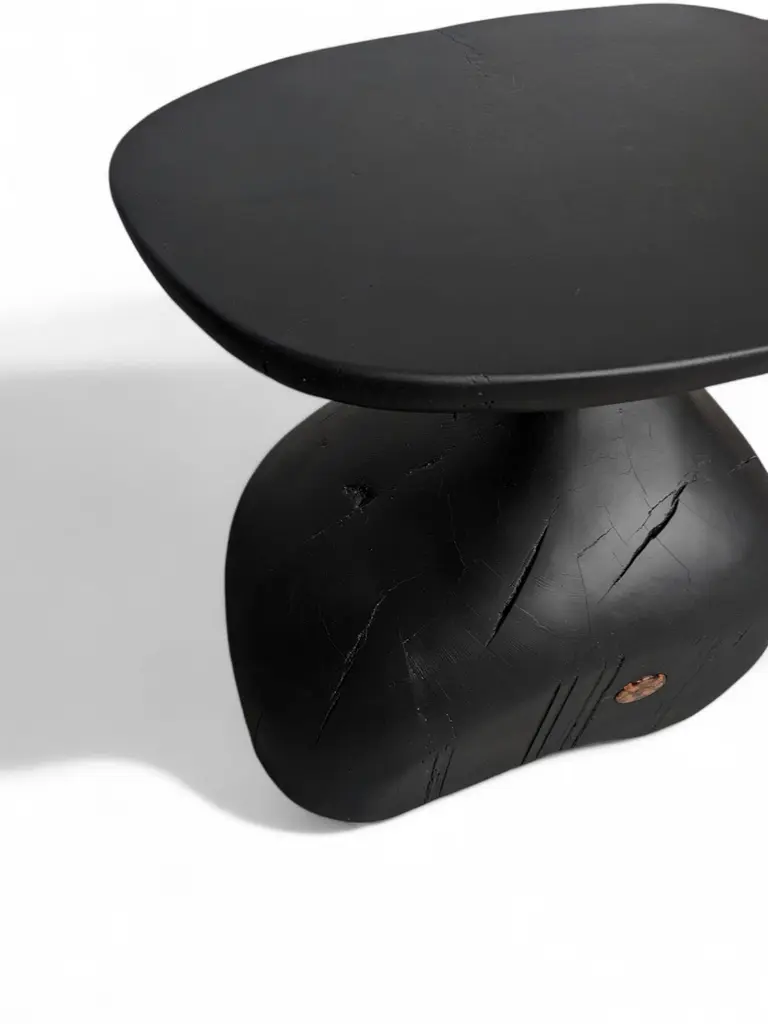 Tea 1750 Collection Auxiliary Table 2 by AMBER x IÑIGO CALLEJADimensions: W 55 x D 40 x H 60 cm. Materials: Old tea Beam base, charred and stained black.Iñigo Calleja is an engineer, designer and soulful maker born in Spain. He landed his first graduate job at European engineering leader BMW in Munich and developed a successful career in different companies that took his places all around the world. He found his inner entrepreneur living in Sydney and self developed his woodworking skills by chance and need. Once he realized he could build almost anything that he sketched he knew were about to get really exciting. In 2017 he decided to lay roots in coastal Cádiz, a city founded in the year 1000BC that hosts a breathtaking history and constructions that have seen human civilizations grow. Iñigo feels an unstoppable attraction for rare timbers he finds in many derelict buildings that were built centuries ago that are being demolished or renovated and becomes attracted to the stories those fine timbers treasure within.“The century old beams that we salvage from historic buildings in the tri-millenary city of Cádiz have always been around since our beginnings and are essentially our trademark.We were lucky to recover a batch of roof rafters from the old British Embassy in Calle Sagasta nr.1 whose construction dates back to 1750! A time when the Port of Cádiz was the main harbor of mainland Spain, enjoying the virtual monopoly of trade with the Americas.The common purpose of the designs in this collection is to achieve a high end looking sculptural and beautiful piece whilst exposing cracks, wrinkles and other superficial imperfections that these structural beams have garnered over their colossal career. By doing so we honor the lives of all people and characters that have dwelled this magnificent building over its almost 300 years of existence.”