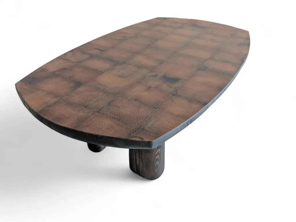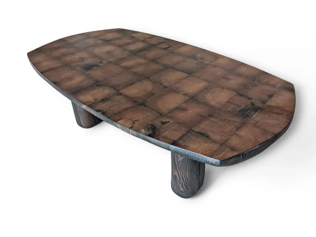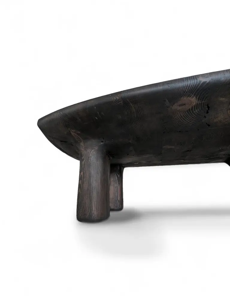 Tea 1750 Collection Centre Table Grid by AMBER x IÑIGO CALLEJADimensions: W 150 x D 110 x H 45 cm. Materials: Old Tea Beams, Glass fiber layered top, Black oil finish. Iñigo Calleja is an engineer, designer and soulful maker born in Spain. He landed his first graduate job at European engineering leader BMW in Munich and developed a successful career in different companies that took his places all around the world. He found his inner entrepreneur living in Sydney and self developed his woodworking skills by chance and need. Once he realized he could build almost anything that he sketched he knew were about to get really exciting. In 2017 he decided to lay roots in coastal Cádiz, a city founded in the year 1000BC that hosts a breathtaking history and constructions that have seen human civilizations grow. Iñigo feels an unstoppable attraction for rare timbers he finds in many derelict buildings that were built centuries ago that are being demolished or renovated and becomes attracted to the stories those fine timbers treasure within.“The century old beams that we salvage from historic buildings in the tri-millenary city of Cádiz have always been around since our beginnings and are essentially our trademark.We were lucky to recover a batch of roof rafters from the old British Embassy in Calle Sagasta nr.1 whose construction dates back to 1750! A time when the Port of Cádiz was the main harbor of mainland Spain, enjoying the virtual monopoly of trade with the Americas.The common purpose of the designs in this collection is to achieve a high end looking sculptural and beautiful piece whilst exposing cracks, wrinkles and other superficial imperfections that these structural beams have garnered over their colossal career. By doing so we honor the lives of all people and characters that have dwelled this magnificent building over its almost 300 years of existence.”