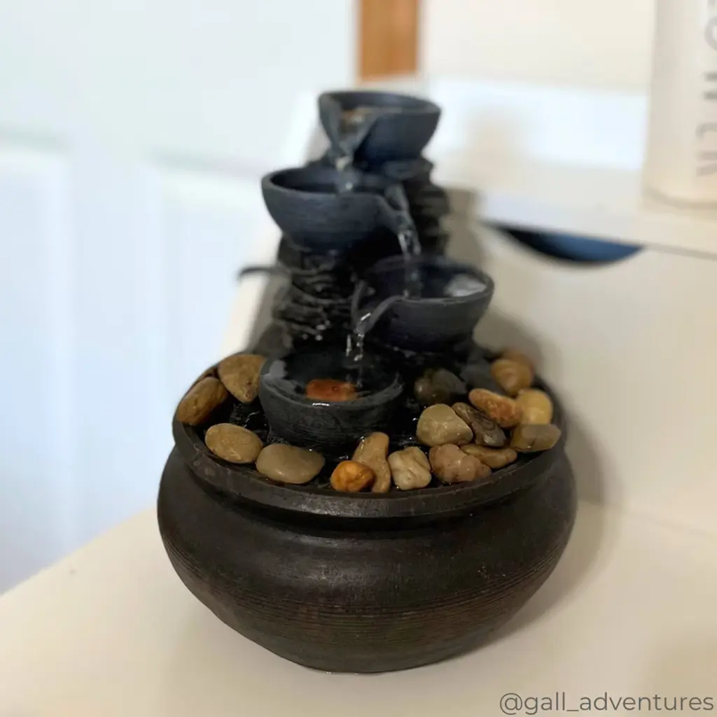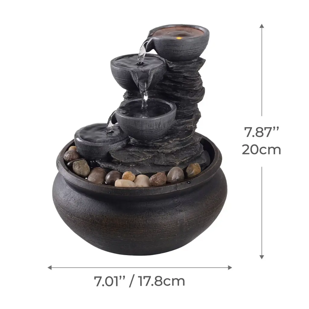 Transform any indoor or outdoor décor into a soothing oasis with this tabletop water fountain. The four petite tiers allow continuous cascades, the sounds of gently trickling water creating an instant aura of tranquility. Perfectly sized to fit atop a work desk to calm and centre yourself during the workday or use as an accent in the garden.