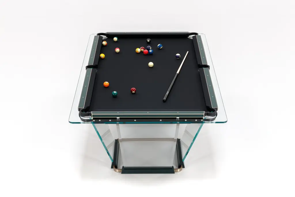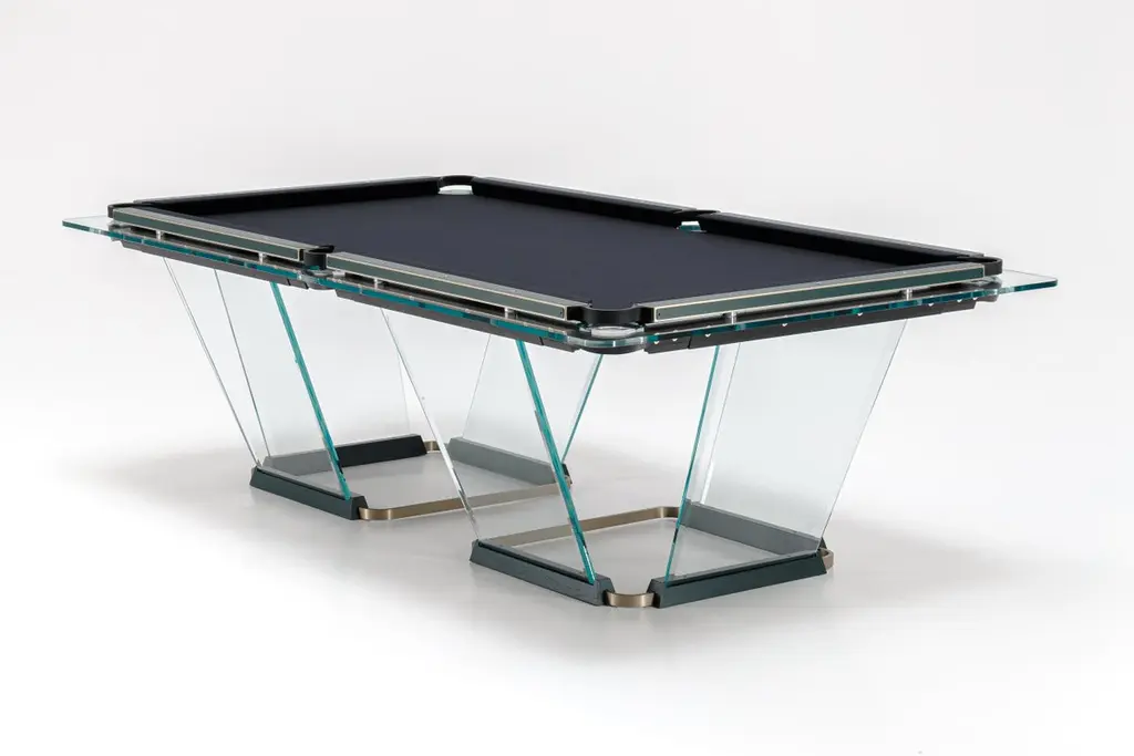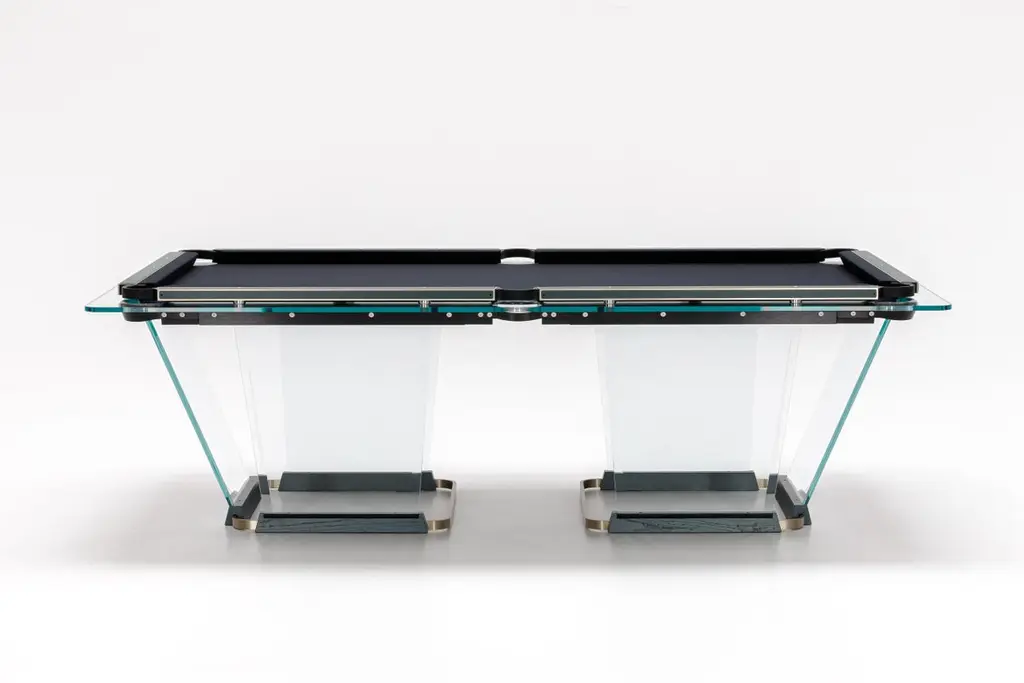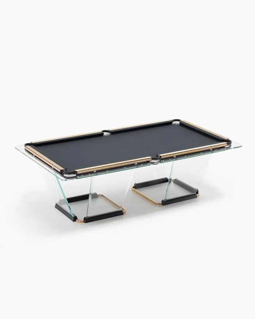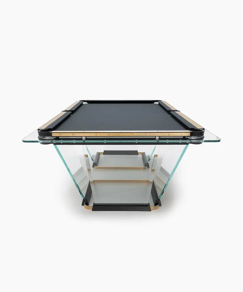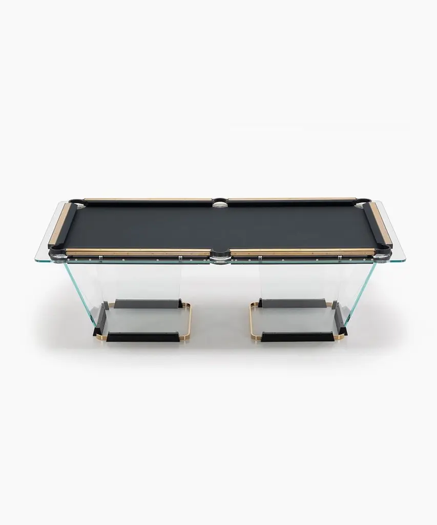 T.1.3 is a billiard-pool table made entirely of glass, where the playing surface is specially treated reproducing the friction of traditional cloth.The feet are sheets of glass bevelled on both sides that self-stabilize, the support is made of solid wood hollowed out for the insertion of the glass, hiding a perfect system of regulation. The pockets are made of smoked transparent thermoplastic.T1.3 Teckell is the perfect choice for a traditional game room with a modern flair. Behind every table is the work of a traditional carpentry workshop that also embraces 21st-century technologies. Artisans work with age-old precious woods as well as today’s cutting-edge materials. Old and new come together to give a fresh spin to each long-lasting, eco-friendly table.T1.3 is the product of an encounter between an entrepreneur and a designer,a project that becomes a reality thanks to the savoir faire of a group of Italian companies highly specialized in making individual components: glass, steel, wood, but also special high-tech polymers for the pockets and the bumpers.A great team effort at the service of an original and elegant idea that puts together imagination, entrepreneurial brilliance, technology and ability, in order to reveal and give life to a unique object.Available in different options: Leather inlays, woodFinish:24k Gold plated inlaysDimensions: 260 x 148 x H 82 cm L 114 1⁄4 W 64 1⁄4 H 32 1⁄4 inchesThe legs are glass plates with beveled edges on both sides that ensure the table is stable. The base is made of solid wood with carved grooves for securing the glass and hiding the perfect regulation system.Accessories included with the pool table:Four professional and stylish cues.One set of Pool Balls Aramith.One rack.The table cloth by Simonis is available in 24 colors.Cue rack and ceiling lamp are also available on request.About the designer:Marc Sadler has worked for a long time as designer in the sports sector, where he has experimented with new materials and innovative production processes. He has also worked successfully in furnishing and consumer products. In 2001 he won Compasso D’Oro Prize.