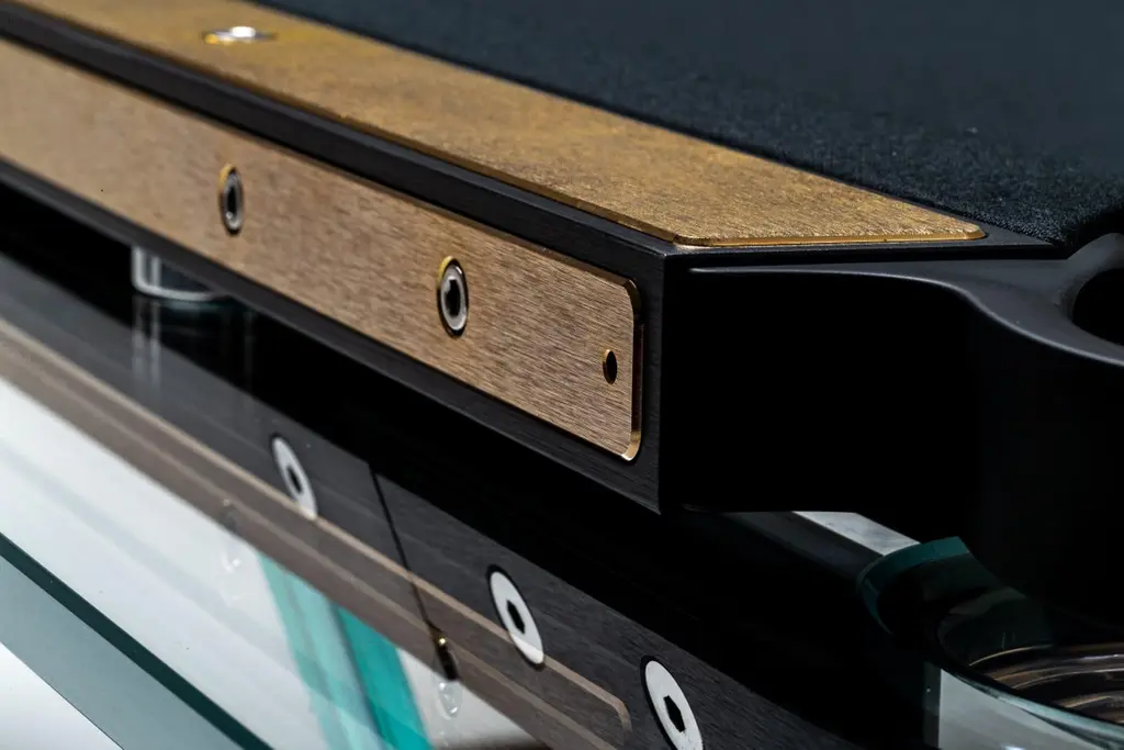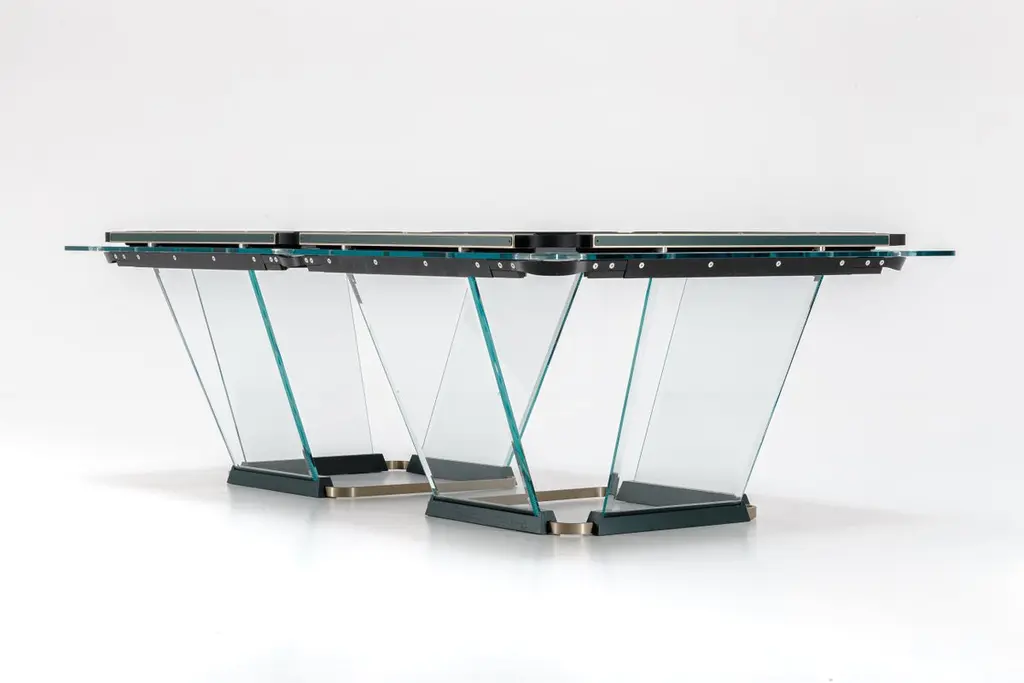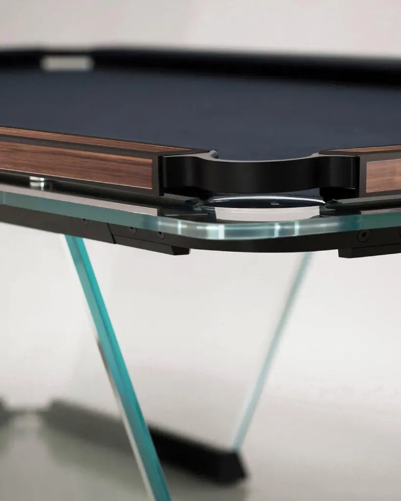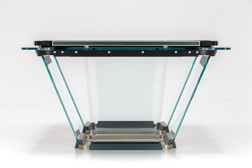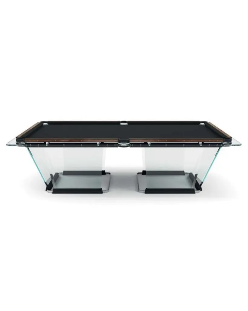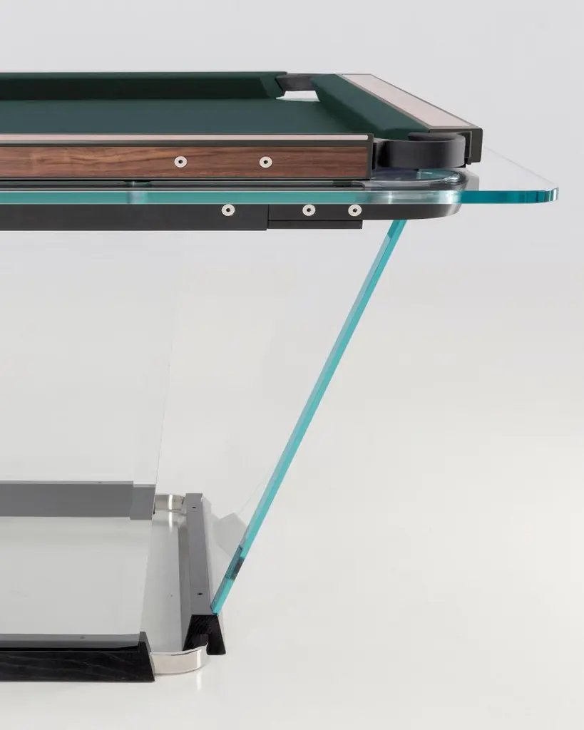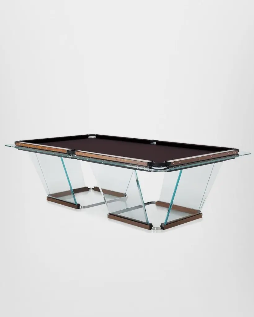 T.1.3 is a billiard-pool table made entirely of glass, where the playing surface is specially treated reproducing the friction of traditional cloth.The feet are sheets of glass bevelled on both sides that self-stabilize, the support is made of solid wood hollowed out for the insertion of the glass, hiding a perfect system of regulation. The pockets are made of smoked transparent thermoplastic.T1.3 Teckell is the perfect choice for a traditional game room with a modern flair. Behind every table is the work of a traditional carpentry workshop that also embraces 21st-century technologies. Artisans work with age-old precious woods as well as today’s cutting-edge materials. Old and new come together to give a fresh spin to each long-lasting, eco-friendly table.T1.3 is the product of an encounter between an entrepreneur and a designer,a project that becomes a reality thanks to the savoir faire of a group of Italian companies highly specialized in making individual components: glass, steel, wood, but also special high-tech polymers for the pockets and the bumpers.A great team effort at the service of an original and elegant idea that puts together imagination, entrepreneurial brilliance, technology and ability, in order to reveal and give life to a unique object.Available in different options: Leather inlays, woodFinish:24k Gold plated inlaysDimensions: 260 x 148 x H 82 cm L 114 1⁄4 W 64 1⁄4 H 32 1⁄4 inchesThe legs are glass plates with beveled edges on both sides that ensure the table is stable. The base is made of solid wood with carved grooves for securing the glass and hiding the perfect regulation system.Accessories included with the pool table:Four professional and stylish cues.One set of Pool Balls Aramith.One rack.The table cloth by Simonis is available in 24 colors.Cue rack and ceiling lamp are also available on request.About the designer:Marc Sadler has worked for a long time as designer in the sports sector, where he has experimented with new materials and innovative production processes. He has also worked successfully in furnishing and consumer products. In 2001 he won Compasso D’Oro Prize.