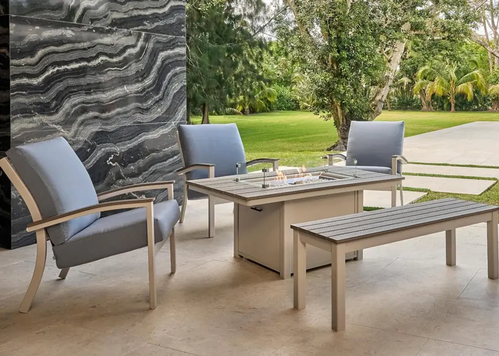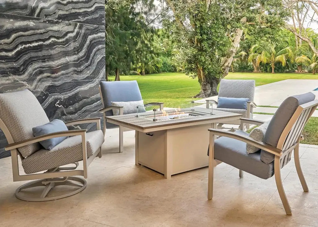 Started in 1903, Telescope Casual Furniture is world-renown for their quality and style. Using innovative techniques, they have perfected the art of all-weather outdoor furniture and fire pits. From their famous director's chairs to their outdoor furniture, everything is skillfully crafted in the USA. Available in many colors, Telescope Casual's Fire Tables utilize a Marine Grade Polymer (MGP) top. Marine Grade Polymer is a durable polyethylene material that has been used on yachts for twenty years. This proprietary material is 25% stronger than others like it in the market. It is stiff, sturdy, and scratch-resistant. Choose your powder-coat color and Marine Grade Polymer color. Standard Marine Grade Polymer colors will be on all vertical and horizontal surfaces. Accent MGP colors are available only on top surface of Fire Tables. Vertical side panels will be same color as powder-coat frame, except White frames will have Snow MGP side panels.