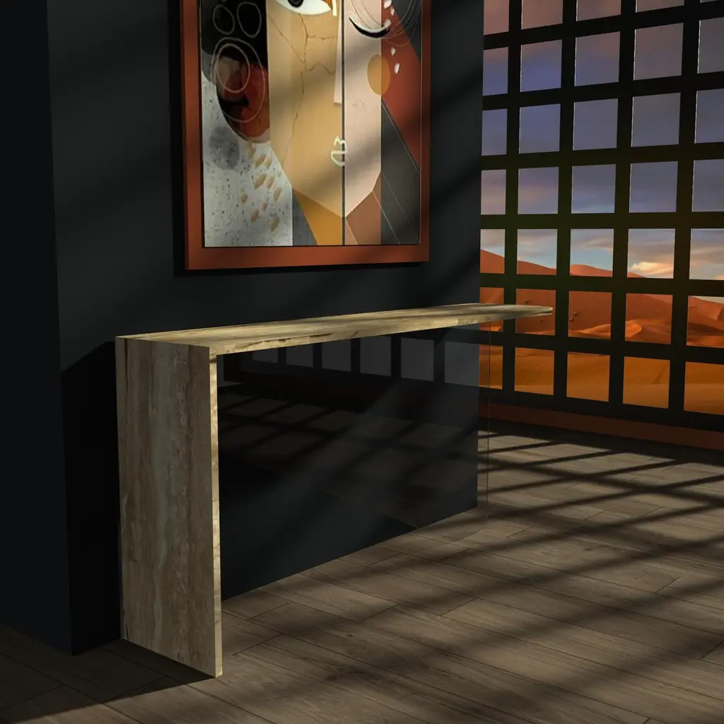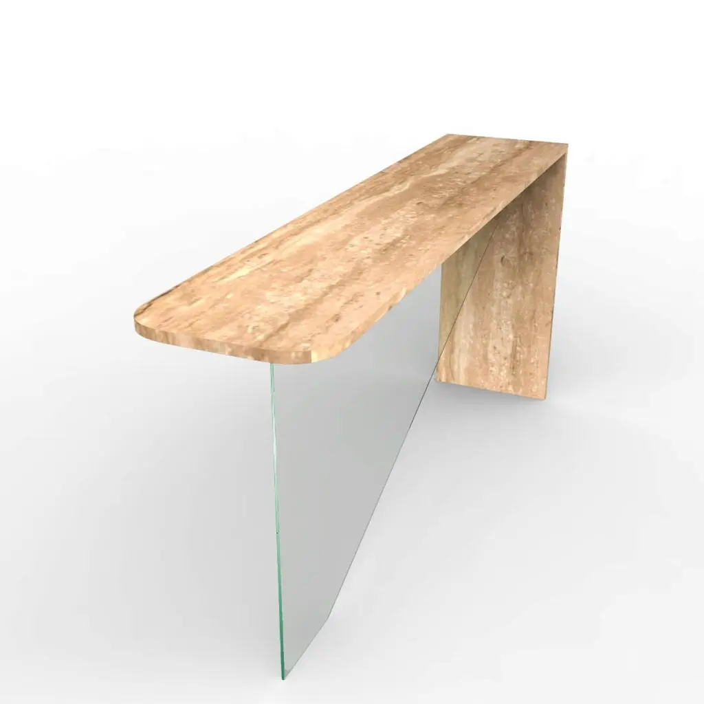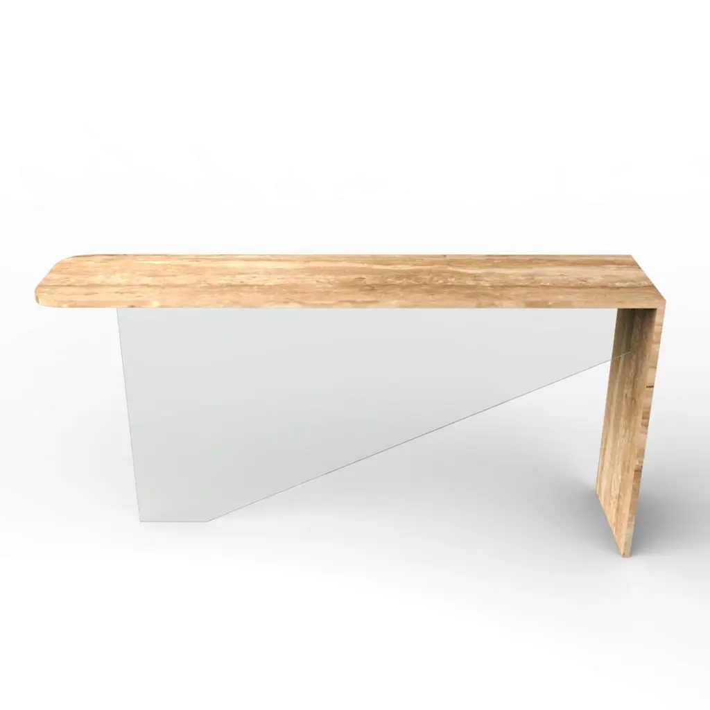 Tena Marble Console Table Bespoke Marble & Crystal Furniture Custome-Made SpainThe Tena console redefines minimalist elegance through the perfect union of natural marble and crystal-clear glass. With a sculptural form defined by clarity and contrast, Tena features an L-shaped marble structure that forms the tabletop and one lateral leg, complemented by a central glass support that is precisely aligned to create a striking sense of balance and innovation.Designed by Joaquín Moll, known for transforming stone into contemporary art pieces, Tena embodies a quiet sophistication that speaks through proportion and material purity. The seamless transition between the solid presence of marble and the lightness of glass gives this console an almost levitating quality, making it as much an artwork as it is a functional piece.Often crafted in Roman travertine, celebrated for its subtle texture and timeless tone, the marble can be customized with a curated selection of fine natural stones—allowing for a completely bespoke aesthetic. The central tempered glass support, cut with precision, adds a touch of modernity and transparency that enhances the visual lightness of the piece without compromising its architectural strength.Each Tena console is custom-made at the workshops of Meddel España, where expert artisans shape every detail by hand. The attention to material integrity, alignment, and balance results in a console that is both technically refined and emotionally resonant.Subtle, original, and impeccably crafted, the Tena console brings a sense of contemporary luxury to any interior. It is a tribute to thoughtful design—where the timeless beauty of marble meets the quiet brilliance of glass.