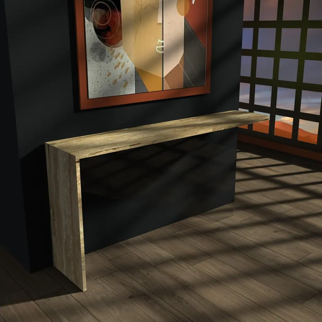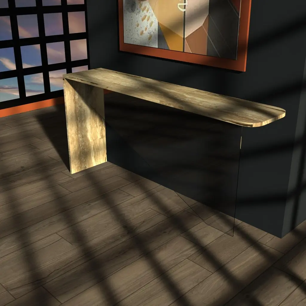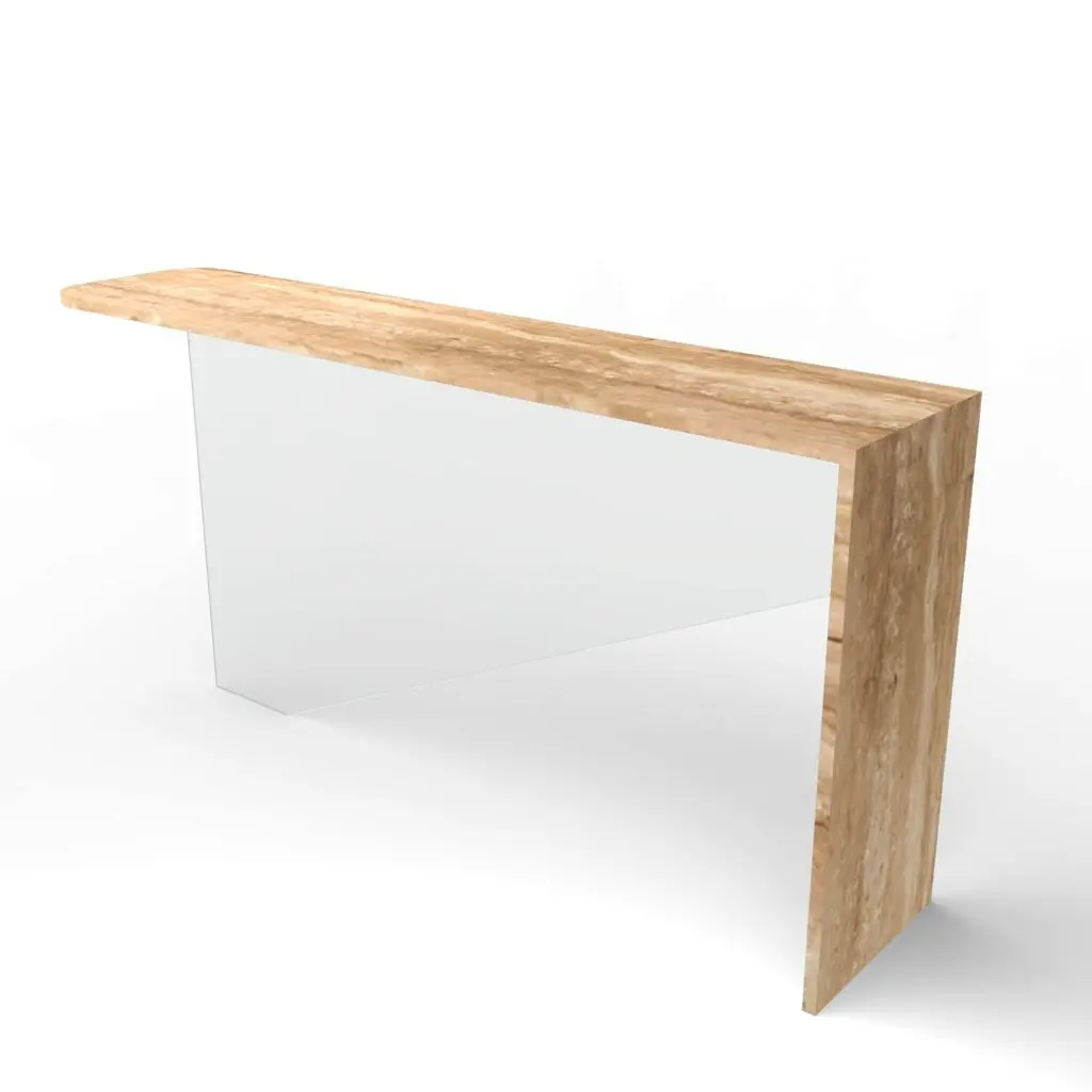 Tena Marble Console Table Bespoke Marble & Crystal Furniture Custome-Made SpainThe Tena console redefines minimalist elegance through the perfect union of natural marble and crystal-clear glass. With a sculptural form defined by clarity and contrast, Tena features an L-shaped marble structure that forms the tabletop and one lateral leg, complemented by a central glass support that is precisely aligned to create a striking sense of balance and innovation.Designed by Joaquín Moll, known for transforming stone into contemporary art pieces, Tena embodies a quiet sophistication that speaks through proportion and material purity. The seamless transition between the solid presence of marble and the lightness of glass gives this console an almost levitating quality, making it as much an artwork as it is a functional piece.Often crafted in Roman travertine, celebrated for its subtle texture and timeless tone, the marble can be customized with a curated selection of fine natural stones—allowing for a completely bespoke aesthetic. The central tempered glass support, cut with precision, adds a touch of modernity and transparency that enhances the visual lightness of the piece without compromising its architectural strength.Each Tena console is custom-made at the workshops of Meddel España, where expert artisans shape every detail by hand. The attention to material integrity, alignment, and balance results in a console that is both technically refined and emotionally resonant.Subtle, original, and impeccably crafted, the Tena console brings a sense of contemporary luxury to any interior. It is a tribute to thoughtful design—where the timeless beauty of marble meets the quiet brilliance of glass.