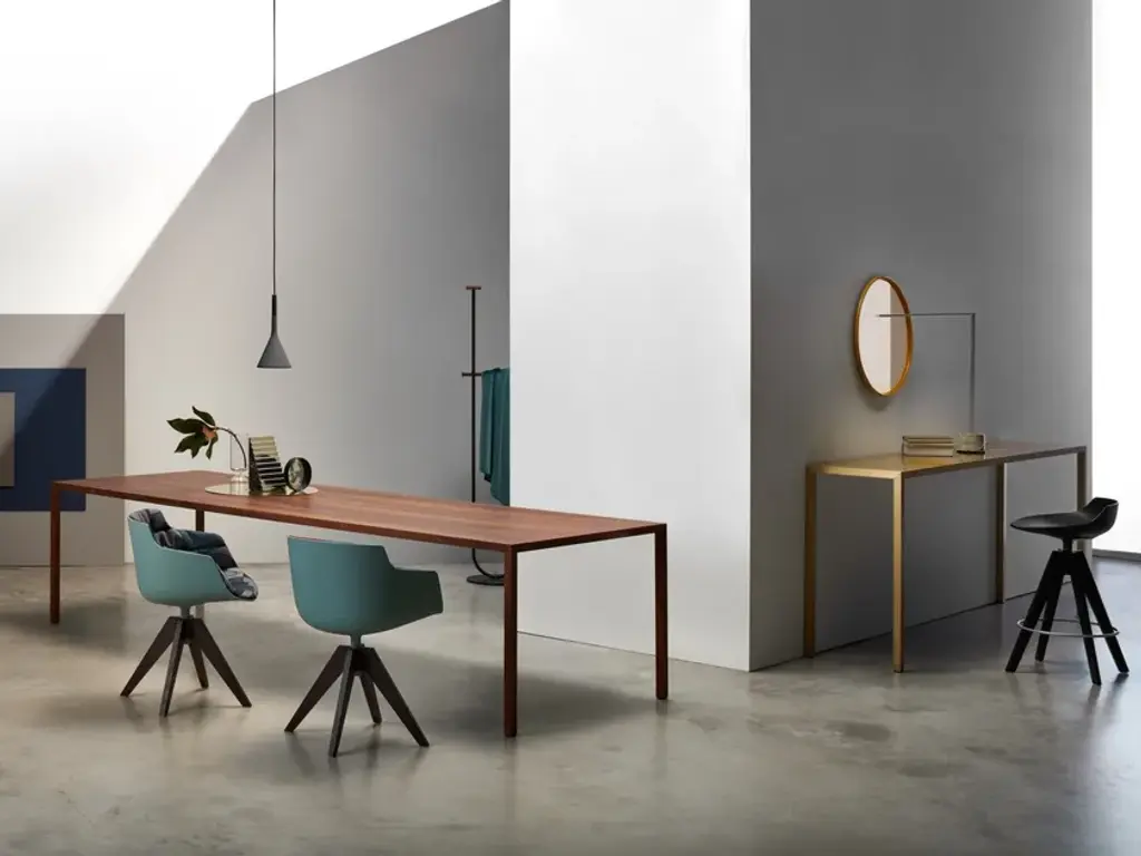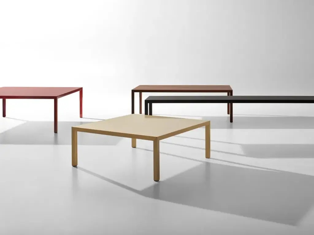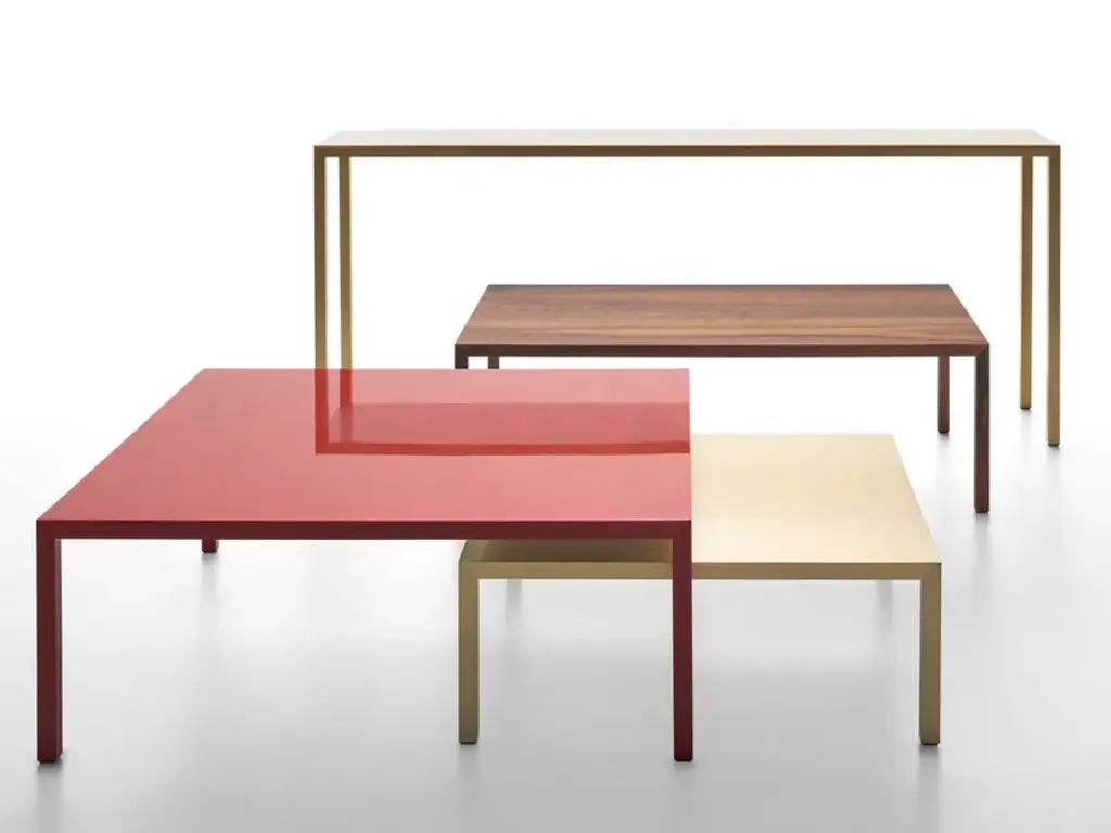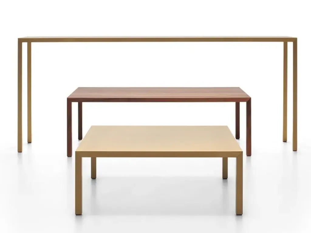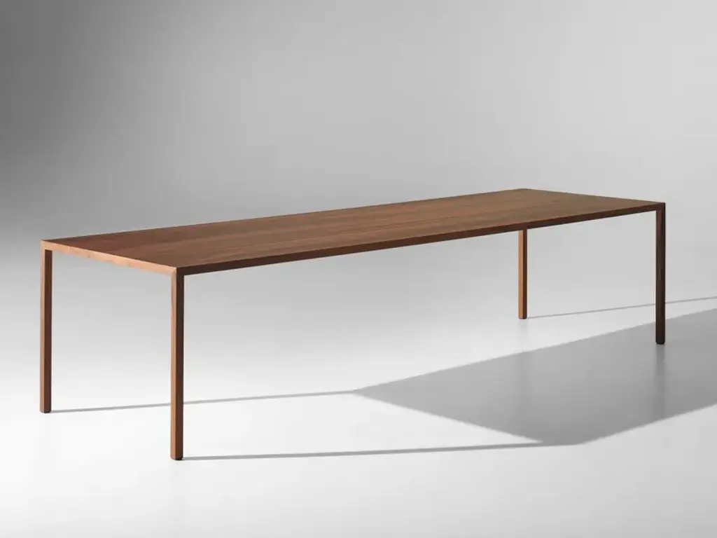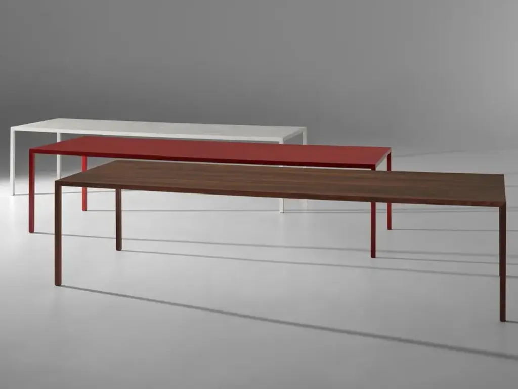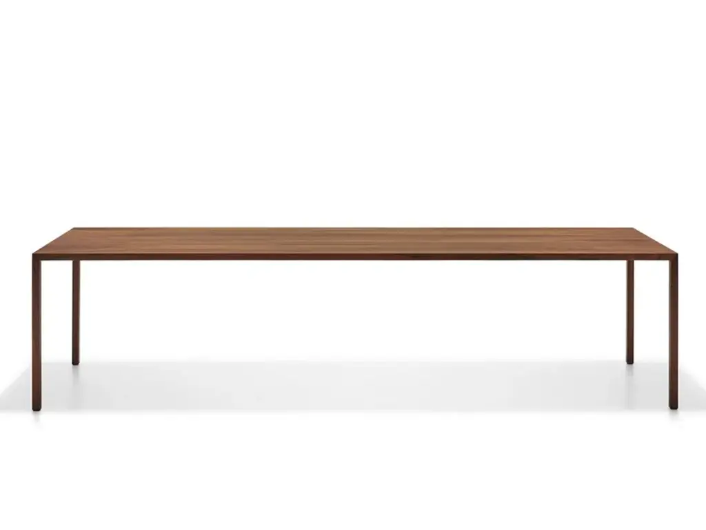 Table featuring new mono-material finishes.The important technological innovation it incorporates, combined with the tensioning capacity of the components, makes it possible to build tabletops in large sizes which remain perfectly flat and also extremely light.Frame and tops35x35 mm steel legs with internal structural tie-rod. The 35 mm thick tabletop is a load-bearing composite board built with an internal frame consisting of either aluminium profiles and polystyrene filler.DimensionsThe Tense table is an icon of the MDF Italia collection, a project which develops and evolves in terms of its own “tensity”.Today Tense, together with Tense Material, comes in:• 5 heights (H35, H45, H73, H90, H110)• 31 sizes• 16 finishes• over 170 types• around 1500 variants• 1 thickness, only 35 mm. FinishesFine wood, in Italian walnut, transparent acrylic finish. Edges and legs covered in 2 mm-thick cut walnut, processed with sawed effect (series of irregular cuts of different depths). Top covered in 2 mm-thick wood, fine smooth finish with variable slats which give the surface a distinctive array of shades, exalting the natural characteristics of the wood and raw material.Top-accessThe tables are also available in the version equipped with 1 or 2 top-access and under top cable try. The metal cable trays are telescopic (H7/H10 cm), to host various wiring systems, such multi-scoket boxes, etc. wiring systems and electrical parts are not included.The top-access is made of aluminium (L350 D127 mm) and it’s available in three versions:• single lead with soft closing (A version)• double lead (B version)• optional, single lead with soft closing, with inlay in the same finish of the table (C version).The top-access is available in the finishes: matt white lacquered for the tables in reconstructed stone white Calce, pink onyx and yellow. Matt black lacquered for the tables in all other versions.Price up charge for top-access in same finish of the table for the F042507/09/20/22/25 variants.The steel cable spring (optional) can be inserted in the cable holes of the cable tray to lead the cables to the floor.Today Tense, together with Tense Material and Tense Intarsia, comes in:- 5 heights (H35, H45, H73, H90, H110)- 36 sizes- 12 finishes- over 170 types- around 1584 variants- 1 thickness, only 35 mm.Top-accessThe tables are also available in the version equipped with 1 or 2 top-access and under top cable try.The metal cable trays are telescopic (H7/10 cm), to host various wiring systems, such multi-scoket boxes, etc. wiring systems and electrical parts are not included. The steel cable spring (optional) can be inserted in the cable holes of the cable tray to lead the cables to the floor. The top-access is made of aluminium (size 127x350 mm) in three versions:- Single lead with soft closing- Double lead - OPTIONAL, single lead with soft closing, with inlay in the same finish of the table Finishes of the top-access:- matt white lacquer with tables in matt white- matt black lacquer with tables in black, and medium grey.- price upcharge for top-access in same finish of the table for the variants.