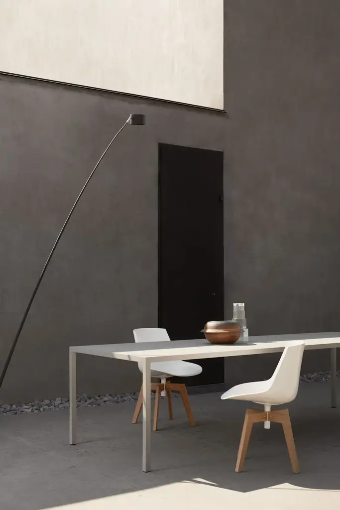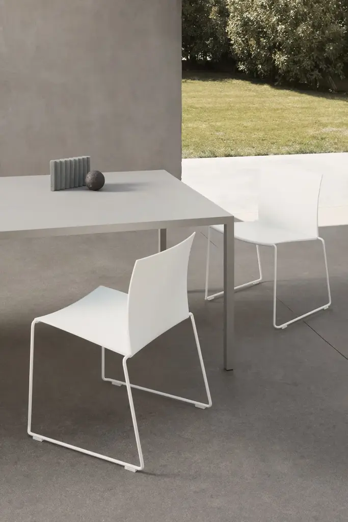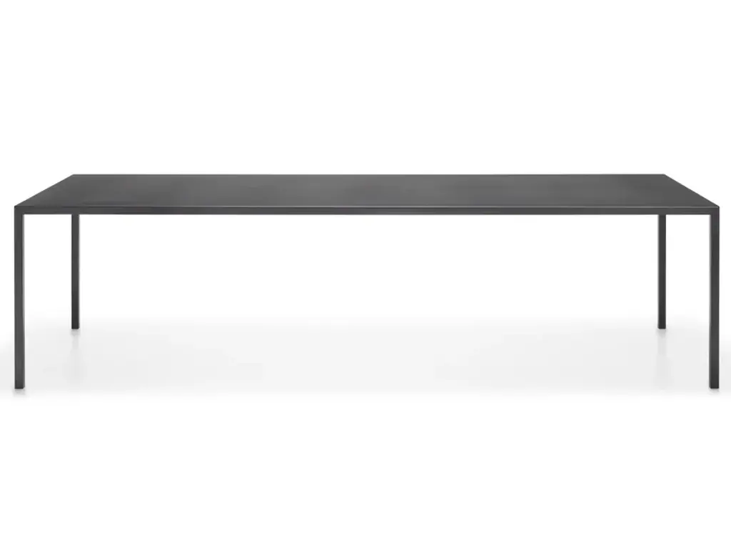 New finishes: reconstructed stone white calce, black slate, yellow and pink onyx.Structure and topExtruded aluminium legs, 35x35 cross-section, with stainless steel structural tie-rod and adjustable feet. The load-bearing top, 35 mm thick, is a composite panel made up of an inner frame of galvanised steel profile, painted with a specific treatment for outdoor use, and filled with polystyrene. This is completely covered, both on the top and on the edges by an aluminium sheet. FinishesGoffered white, corten and black iron painted finish.The black iron finishes have a cloudy shaded effect, a feature and peculiarity of this specific finish.Reconstructed stone is obtained from a blend of mineral powders that have been micronized and mixed with liquid acrylic and water-based products, giving it a material essence. The finishes are applied manually with a palette knife over the entire surface of the table, creating a one-of-a-kind texture that characterises each and every product, both to the eye and to the touch. After application, a maturation process at room temperature is required; the material is subsequently protected with a water-based nanotechnological finish that makes the table sturdy and easy to clean. Top, edges and legs covered with the application of a thickness of about 1.5 mm of material. Finishes: pietra Serena, white Calce, black slate, pink onyx, yellow onyx, red brick and sage green .OutdoorDuring winter and when the items are not in use, we recommend covering the structures with the specific optional cover accessories.