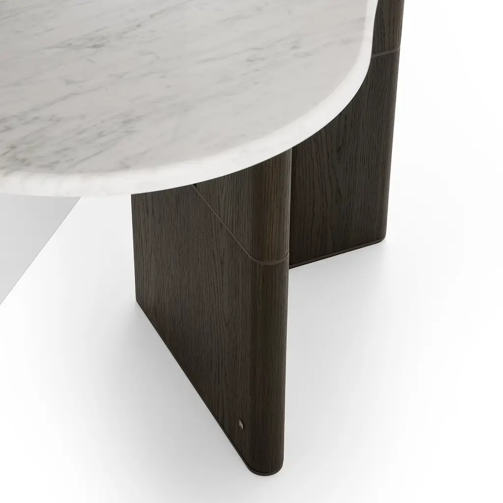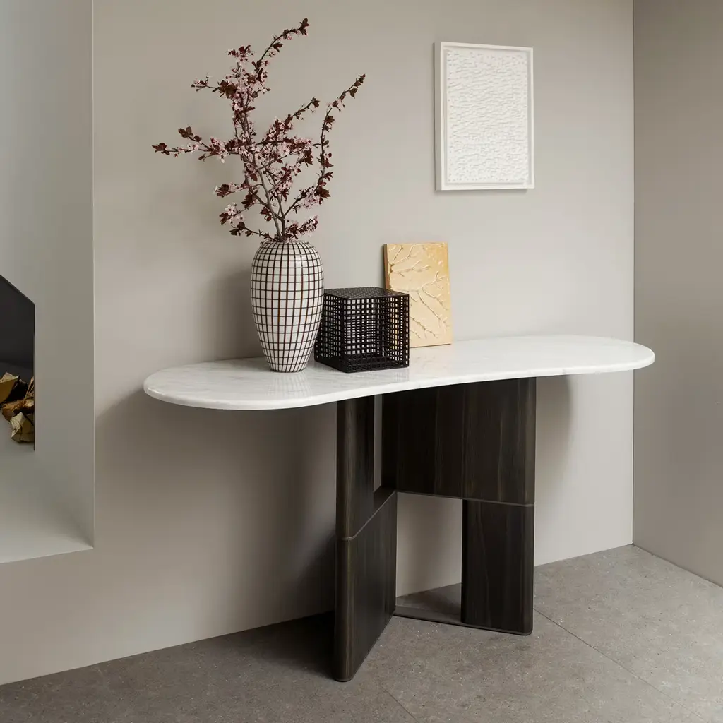 Celebrating exquisite artistry, this console stands out with its curved MDF legs adorned in Laguna oak veneer and meticulously crafted metallic inserts, finished elegantly in dark-burnished epoxy powder. The bean-shaped Carrara marble tabletop, delicately edged with a half-bullnose profile, exudes timeless allure and refinement. A harmonious fusion of modern design and artisanal detail, this piece promises to grace any setting with unparalleled sophistication and luxurious appeal.