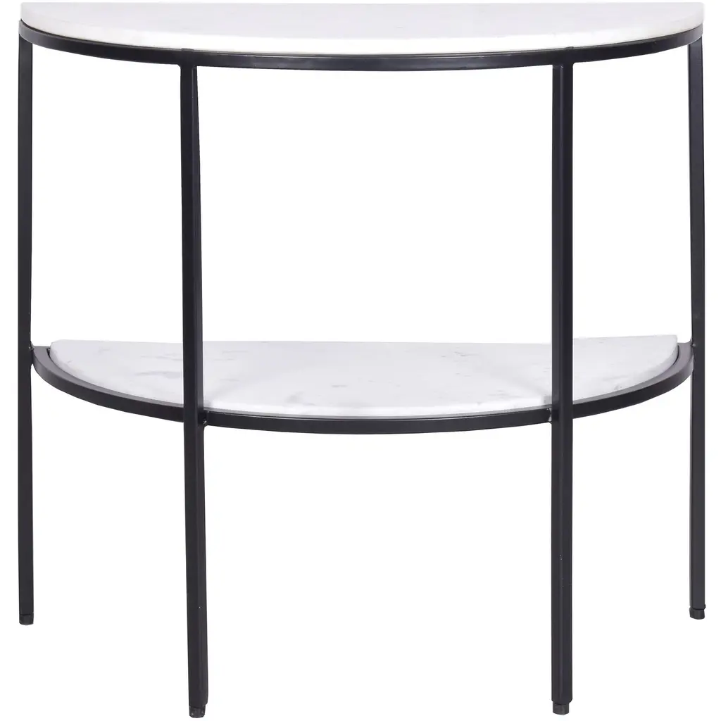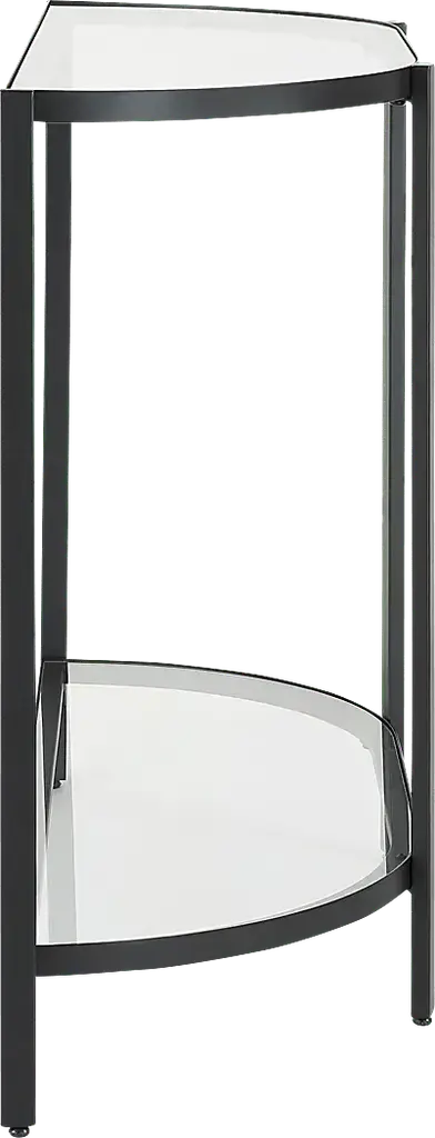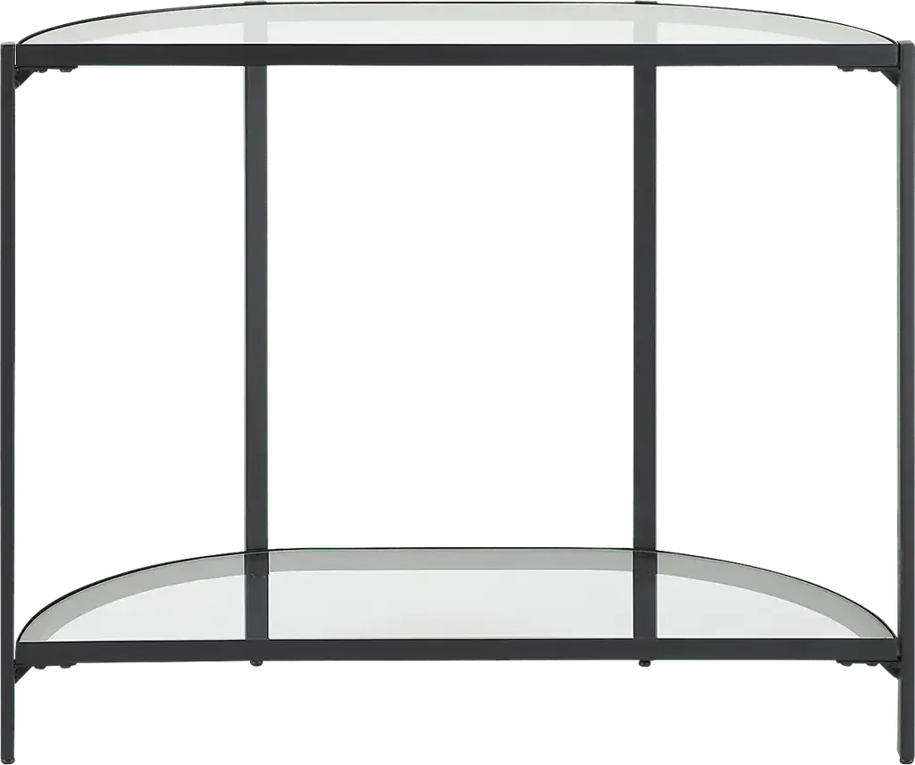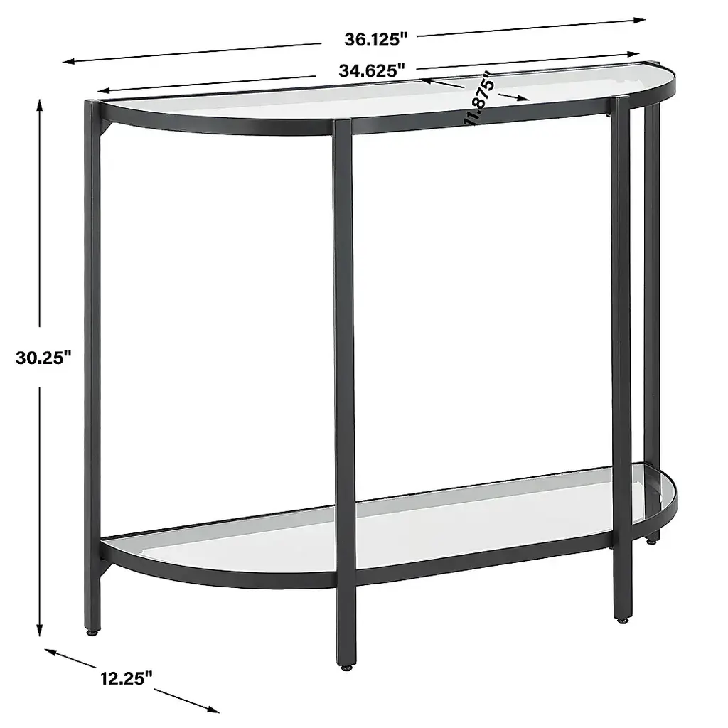 Featuring a sleek demilune frame that spans 36" wide, this Tharo iron console table blends style and function. The satin black finish exudes a contemporary elegance and the shelves are crafted with tempered glass, offering a durable surface for displaying your favorite decor. Customer assembly required.