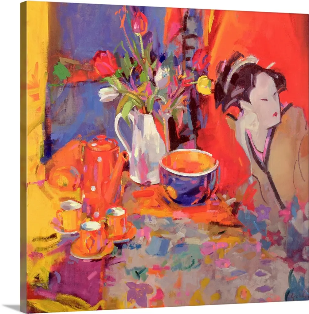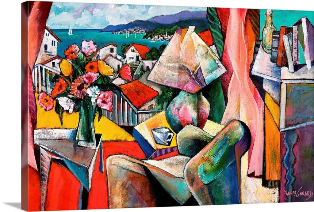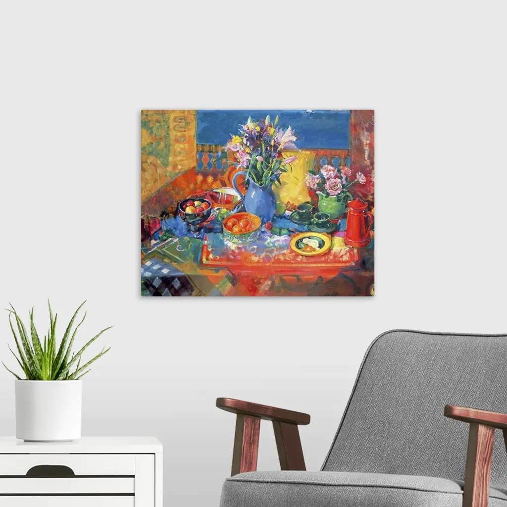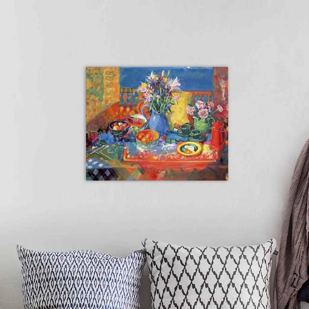 This is a Giclee print of contemporary still life painting of flowers, fruit, patterned textiles, and colorful ceramic ware on a table near an open door way with a view to the harbor.