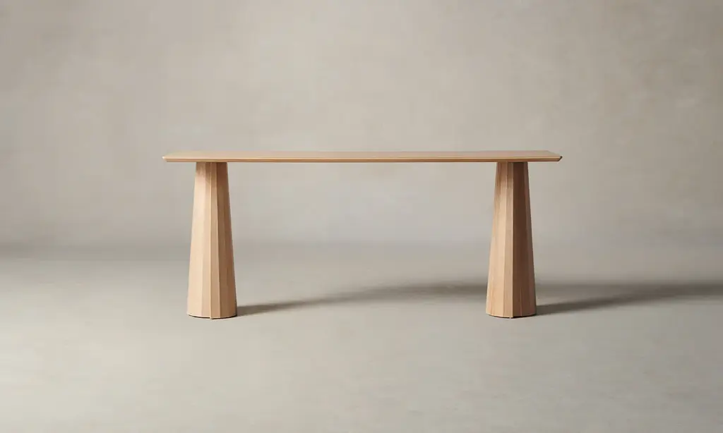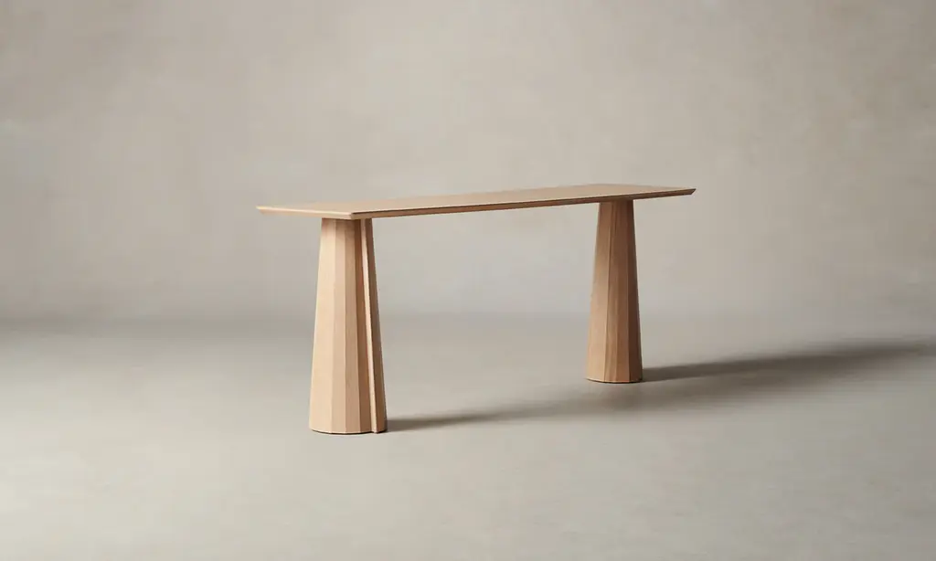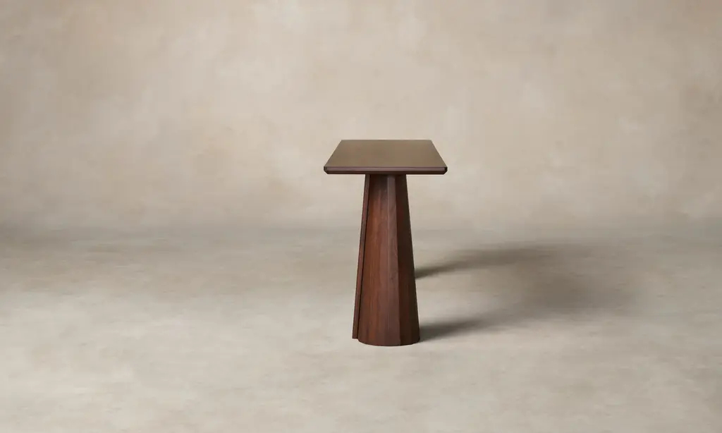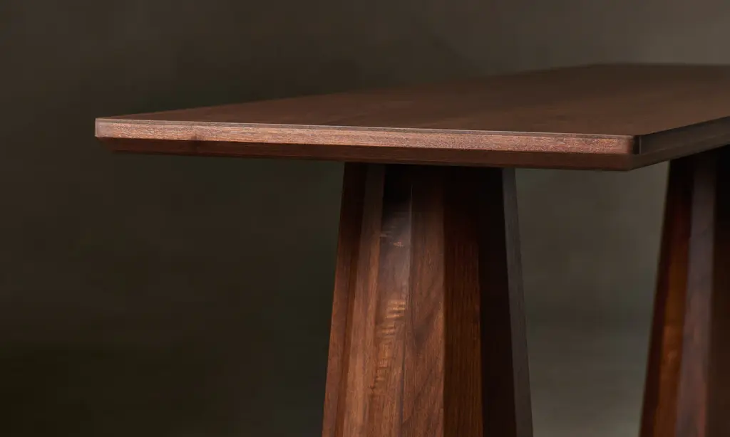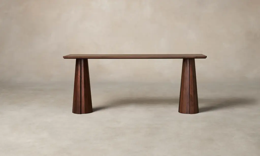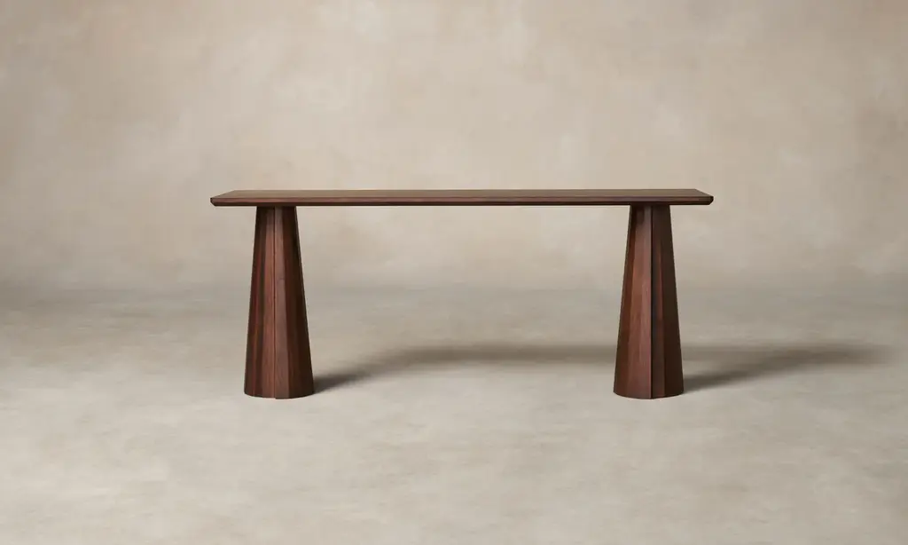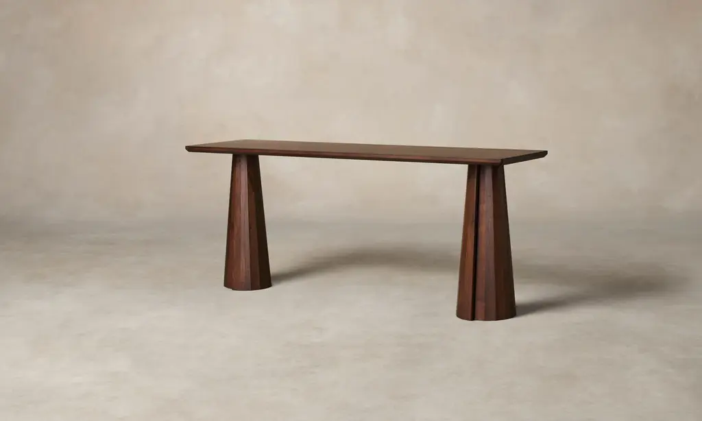 A striking piece for the entryway, hallway, and beyond, the Bank Console Table boasts a beveled-edge tabletop and conical legs—each encircled by facets and a distinctive overlap. Handcrafted at a family-owned workroom in upstate New York.