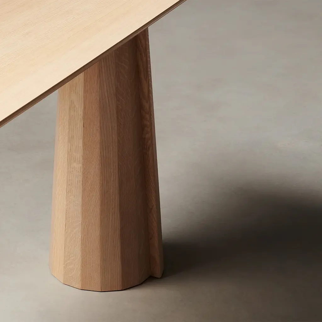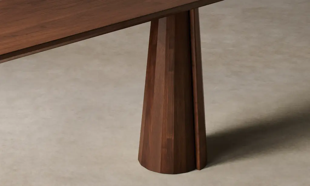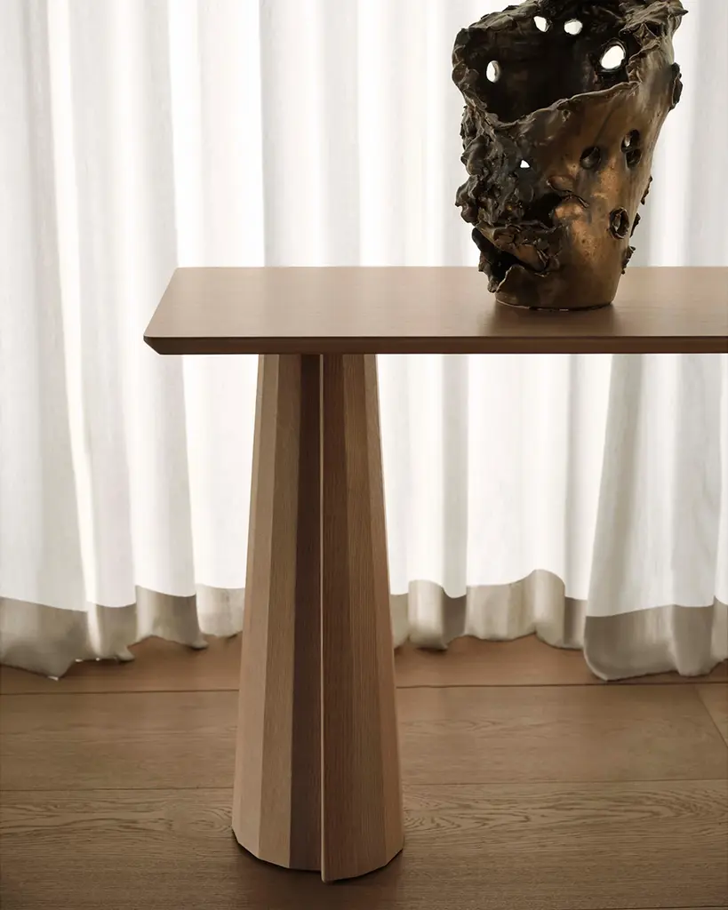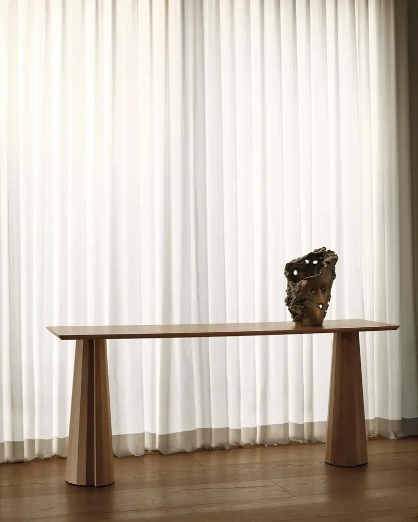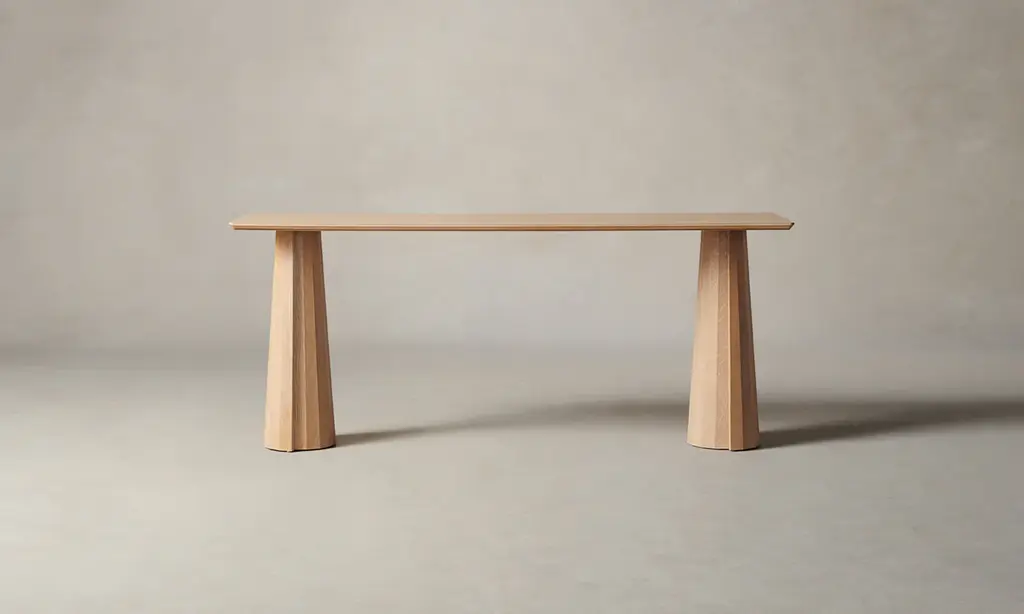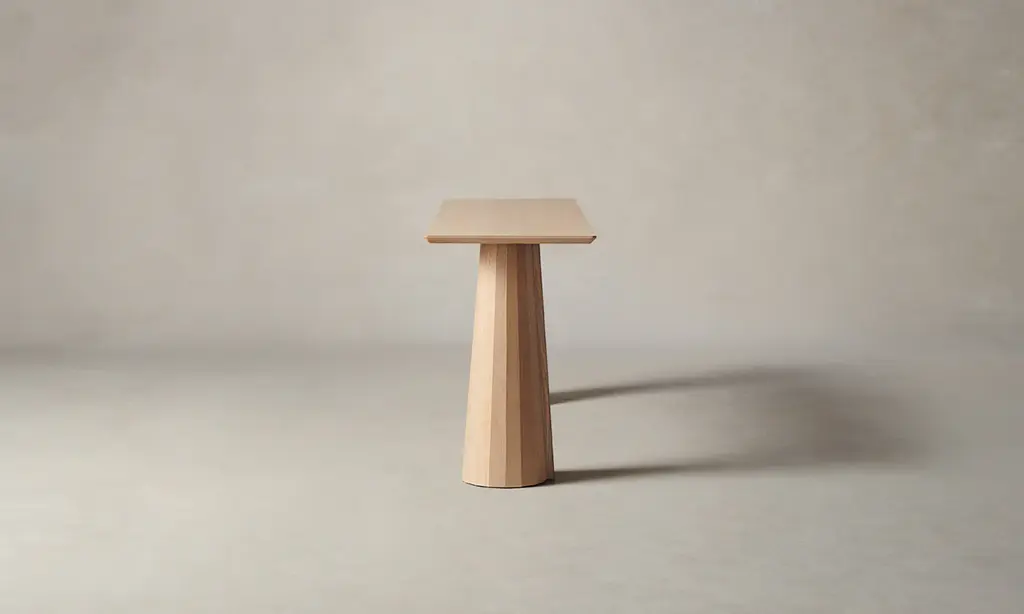 A striking piece for the entryway, hallway, and beyond, the Bank Console Table boasts a beveled-edge tabletop and conical legs—each encircled by facets and a distinctive overlap. Handcrafted at a family-owned workroom in upstate New York.