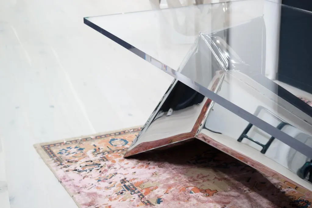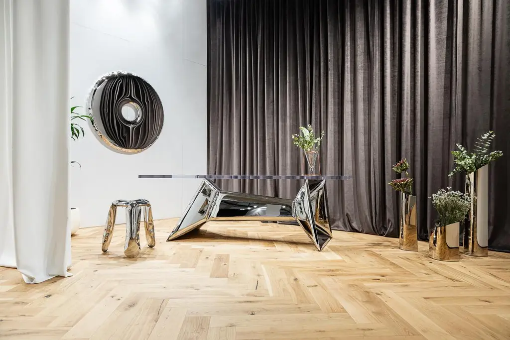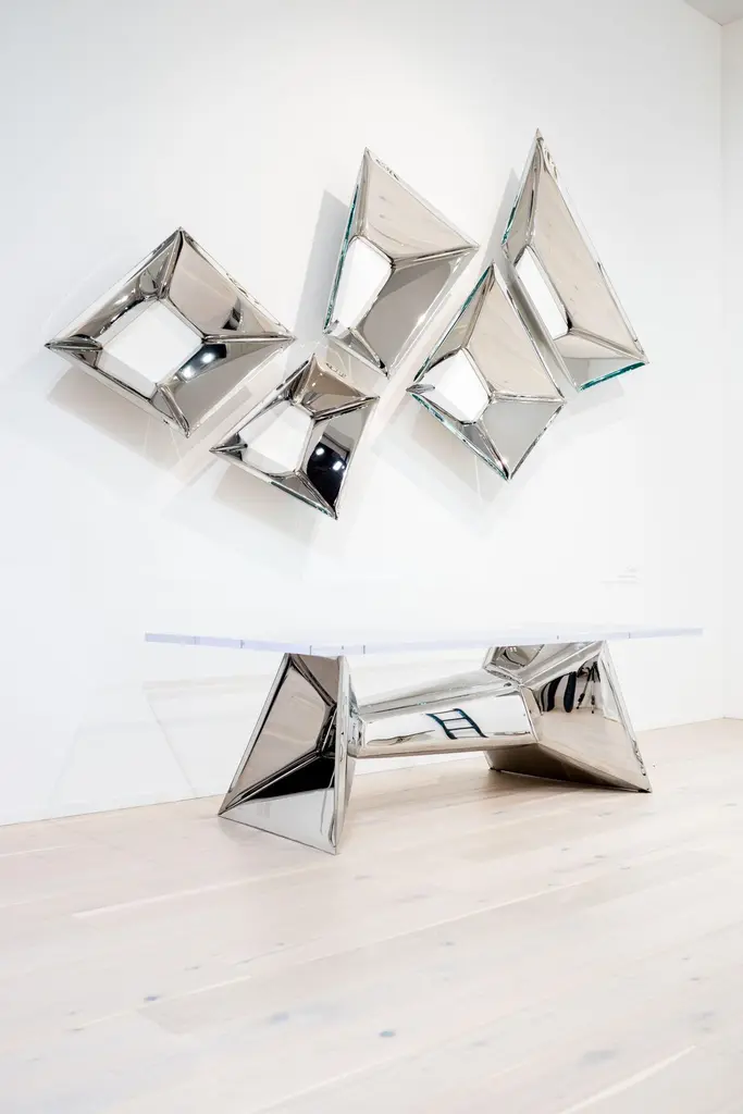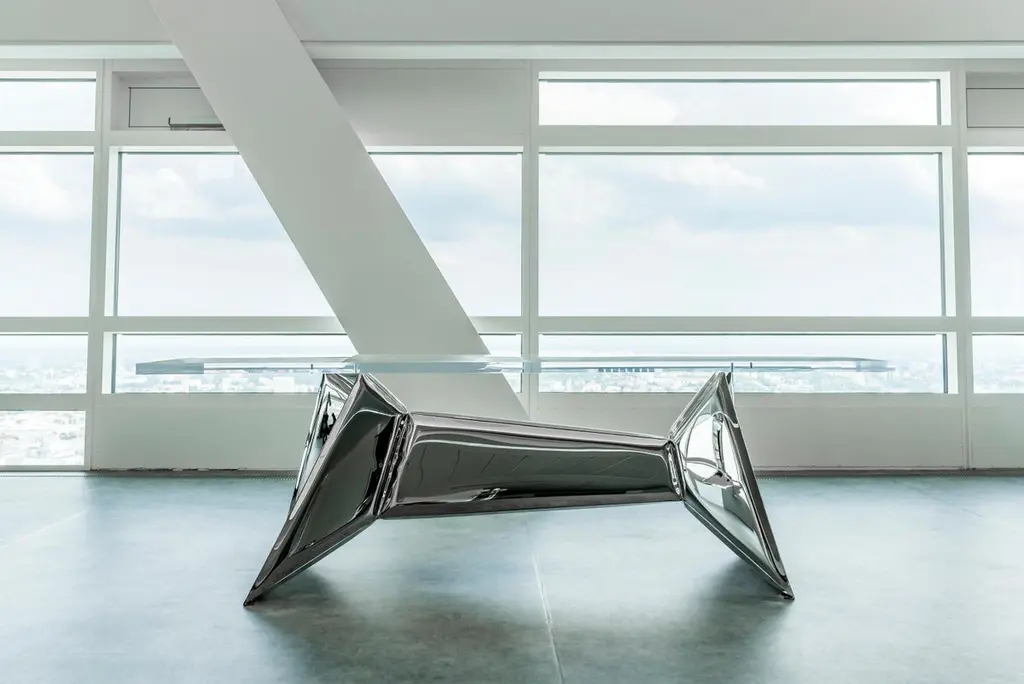 The Crystals table in stainless steel, ZietaDimensions: L 220 x W 110 x H 73 cmMaterial: stainless steel and acrylic top.Crystals is a series of mirrored objects combining geometric shapes with smooth, soft transitions of inflatable metal forms. Polished surfaces curve the light, creating a stunning game of reflections and shadows. Curved mirrored surfaces allow to get lost in reflections.Crystals table is a brand new concept and evolution of the diamond inspired series of objects. The inner part of the crystals table base, with its mirrored surfaces, creates a kaleidoscope, a curved reality. In this way, people looking in to the object experience a colorful optical illusion. The clear tabletop will expose the shapes of parametrically designed base to present the purity of formAbout Zieta: Zietas main goal is to deliver uniqueness and customization in design and constructions while keeping the production, transport and warehousing innovatively efficient.This is how they imagine the future world: Light, durable structures of customized applications produced on demand out of one-of-a-kind parts, yet efficiently.They use computer controlled production process. Customized pattern, customized form, customized function, one-of-a-kind product and outstanding precision are what they deliver.You will find all of this philosophy reflected in the products. They research, they discover new possibilities, they play with forms and they deliver a beautiful, innovative, surprising outcome to people who love design and who care about the design development.They believe their work is a valuable contribution to the world of design not only by the unique beauty of the forms but most of all by opening ultra-innovative opportunities of forming and new paths for the world of future.