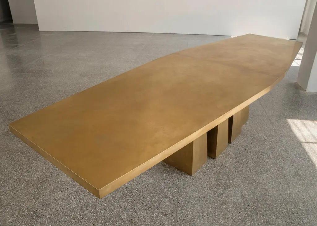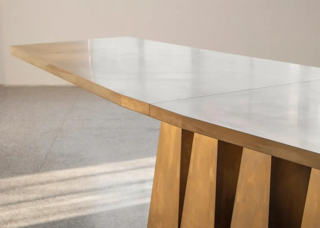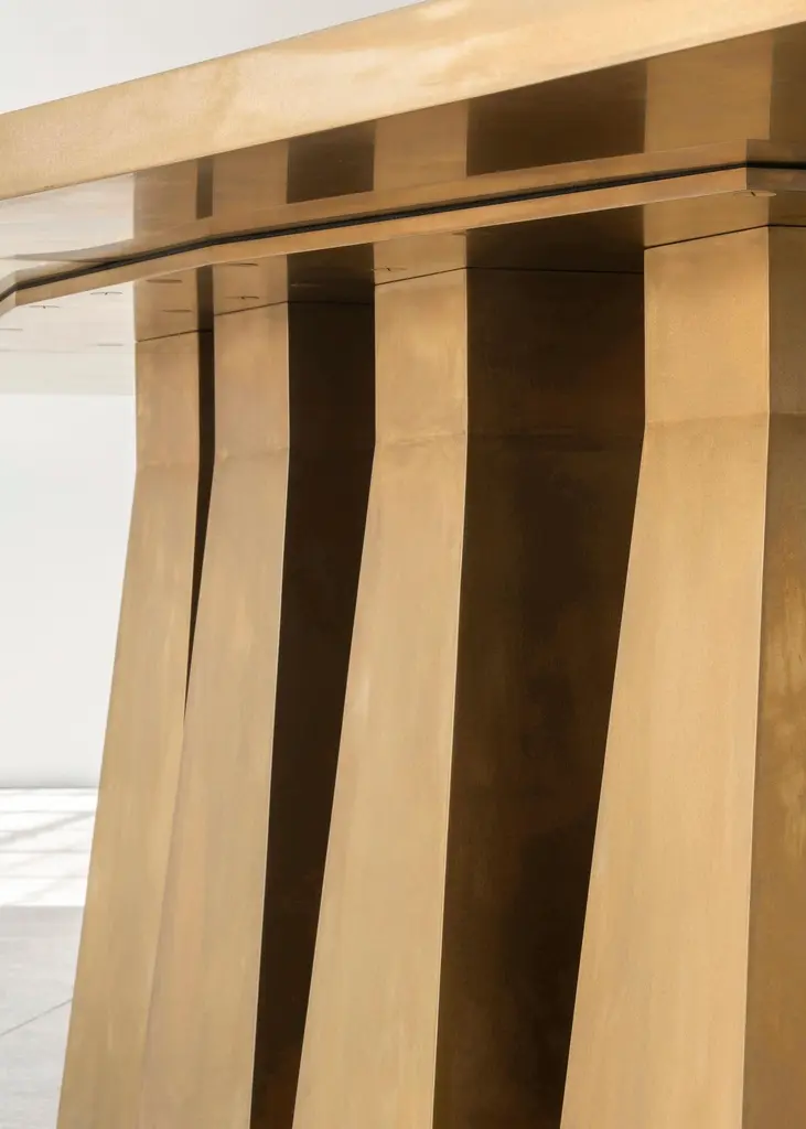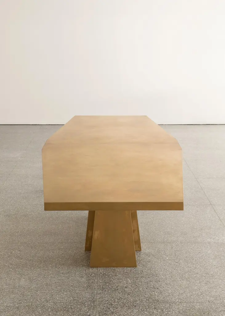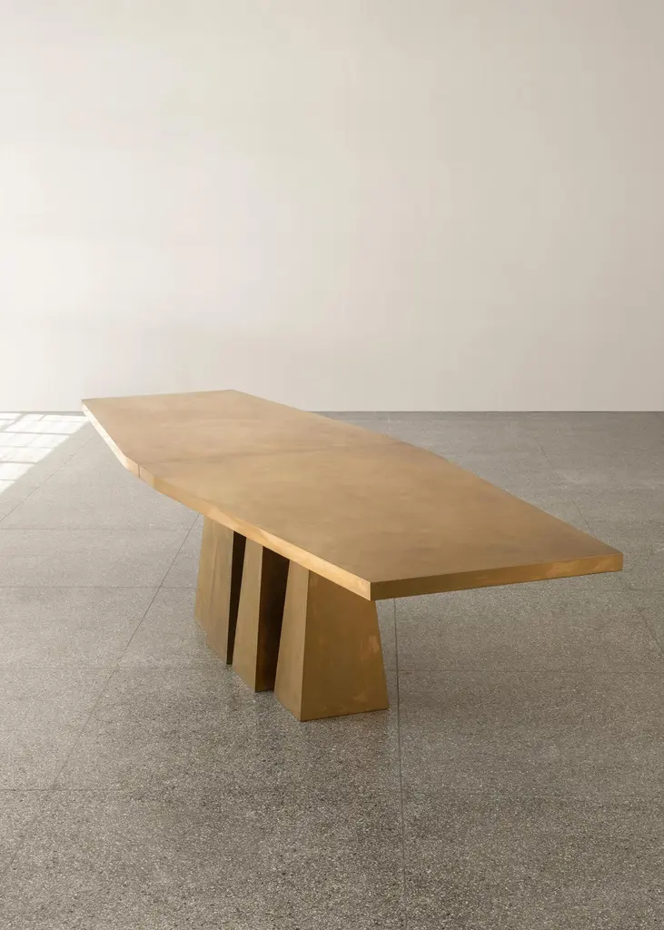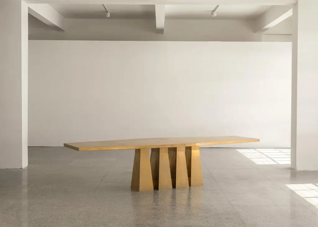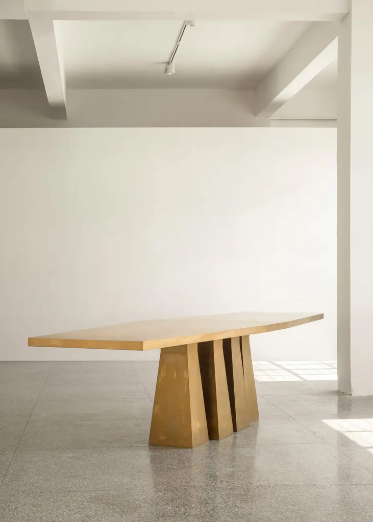 The gate 01 table by Sing Chan Edition Of 20 + 2 APDimensions: W 320 x D 100 x H 75 cmMaterials: Stainless steel, electroplating.Sing Chan ( Chinese: 陈星宇/Xingyu Chen), the founder of SINGCHAN DESIGN, was born in 1990, and graduated from the Department of Industrial Design in Guangzhou University in 2013. He served as the Design Director for Bentu Design in 2016.Founded his own design studio in 2020, Sing specializes in discovering new revelations from different civilizations and eras, reconstructing them through design methods, and shaping new objects that link the past and the present.Panyu, Guangzhou, China, where Sing grew up, is a small town with a rich history along the Pearl River. In the early years, thanks to the developed waterway transportation, the port of the town has a very close relationship with Hong Kong, the imported cultures, utensils, and values meet and fuse here.It was not until he had been in the design industry for more than ten years that he realized that his understanding of native culture was shallow. He is confused about this, and experience tells him that the truly valuable objects are not groundless and pieced together, but based on historical inspection and adaptation of the times. Sing hopes that his design can be like a story that is worth telling in a lyric way, affecting the present across time.