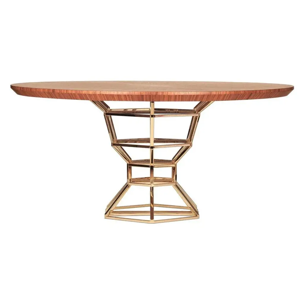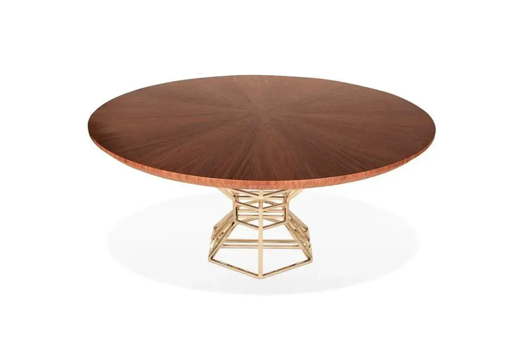 The Graal table by Royal Stranger Dimensions: 160 x 160 x 75 cm Materials: Walnut wood veneer inlay marquetry with matte finish and polished brass legs. Based on a giant structural noble metal bowl, the base of the table worked in walnut wood veneer marquetry, gives The Graal table a unique and careful design, in a game of complex simplicity. This piece is attributed to the mentioned designer/maker. It has no attribution mark and no official proof of authenticity, however it is well documented in design history. I take full responsibility for any authenticity issues arising from misattribution
