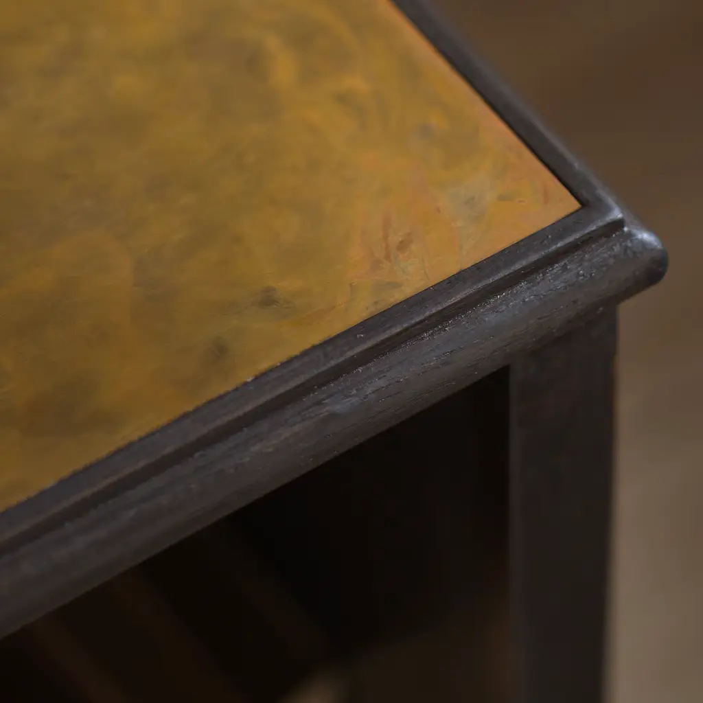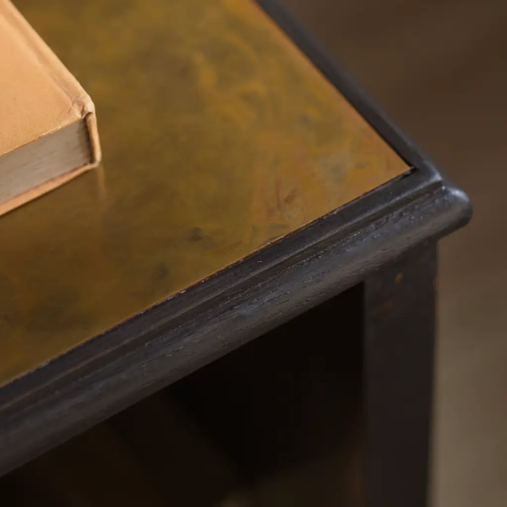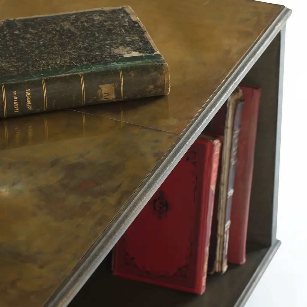 This design features a rigorous geometric structure crafted by combining solid ebonized oak and patinated bronze. Collecting book favorites while adding a subtle illumination effect is a clever choice the designer took with functionality and versatility in mind. It will make for a superb addition to private and professional contexts, alike.