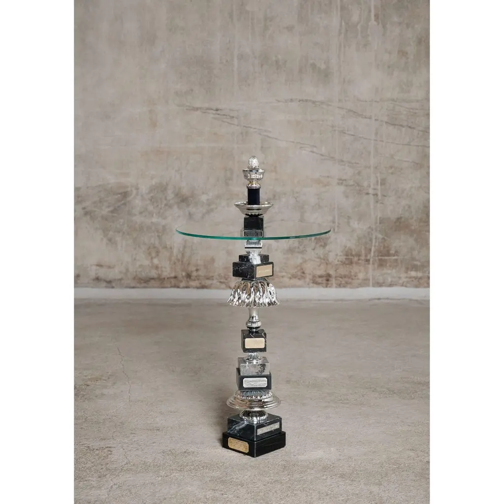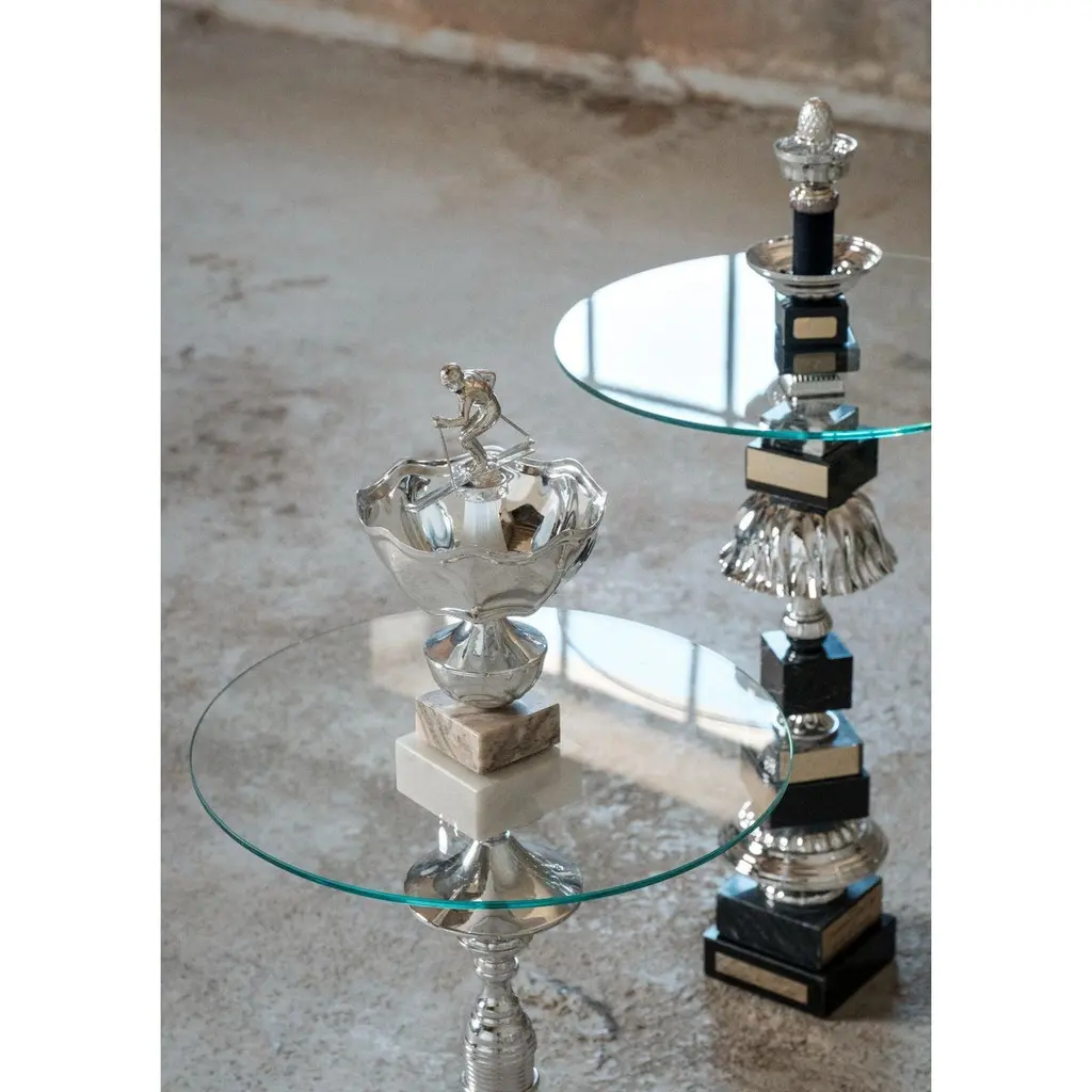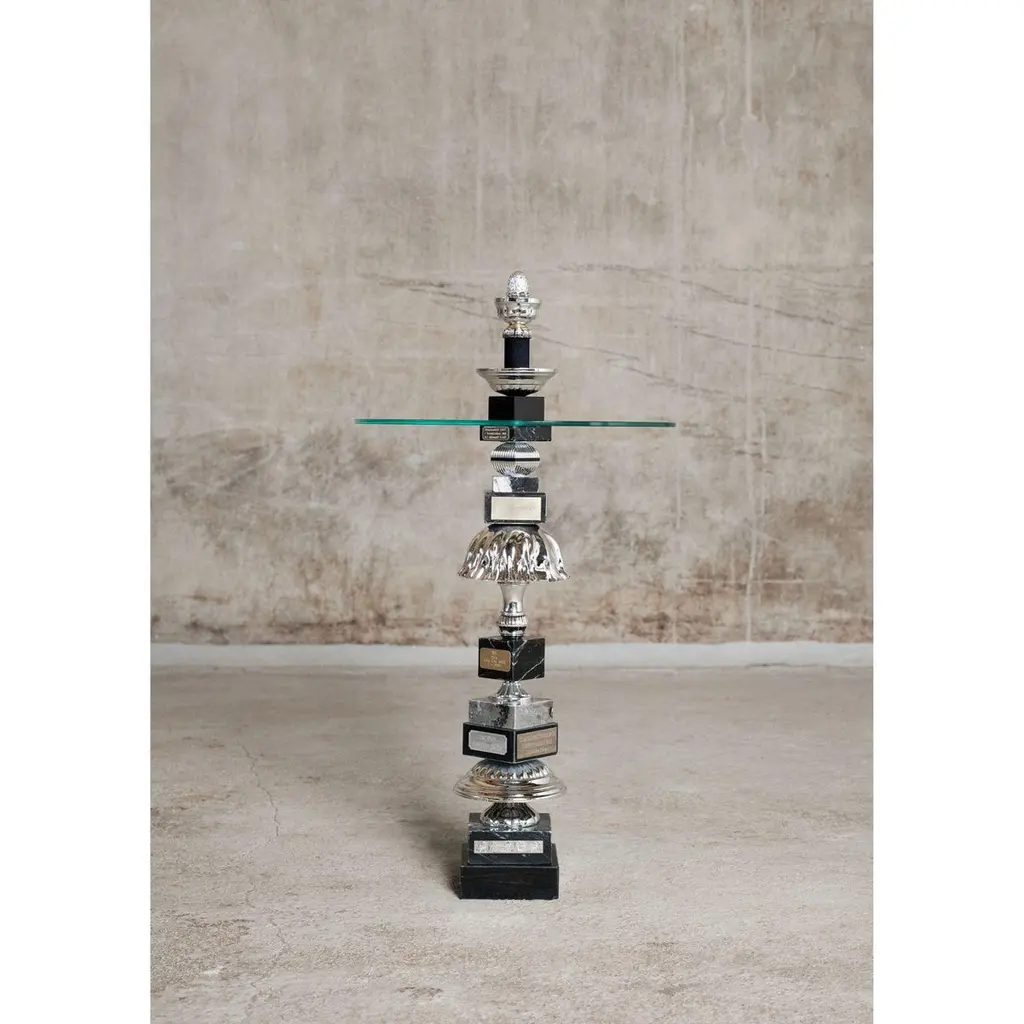 The silver pine cone table by FléttaDimensions: D40 x H76 cmMaterials: Black/silver/grey marble, glass.Trophy is a collection of tables, lights, flowerpots and shelves made of old trophies collected from athletes and sports clubs in Iceland. Trophies are a part of big moments in people’s lives, achievements, and memories. They tell a story of countless hours and strenuous exercises. They are made for a moment, when they are lifted up in triumph.Designers Birta Rós Brynjólfsdóttir and Hrefna Sigurðardóttir founded Flétta in 2018 but have been working together since 2014. Both with backgrounds in product design from Iceland University of the Arts, they bring a high degree of conceptual and process innovation to their works using mundane or often overlookedproducts and materials. Their practice revolves around responsible design, utilizing reused materials and local production with evident respect for craftsmanship and storytelling.