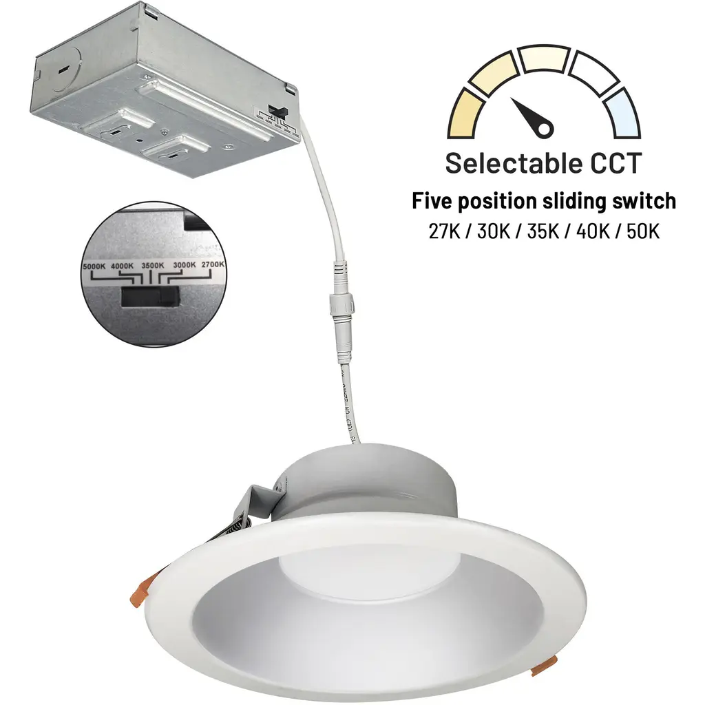 8" Theia LED luminaires are commercial grade downlights designed for easy installation into new construction or remodel applications. Tunable white luminaires include an integral color temperature switch located on the junction box of each luminaire with a quick connect that allows for easy disconnect and mounting in the ceiling. No housing required. Input Voltage 120V. Lumens / Wattage 2100lm / 22W. Color Temperature Selectable CCT (27K/30K/35K/40K/50K). Color Rendering Index 90+ CRI. Dimming Triac or ELV. Finish Haze Reflector / Matte Powder White Flange. Accessories New construction frame-ins ordered separately (NF-R725 or NFP-R725). Listing cETLus Listed for Wet Locations.