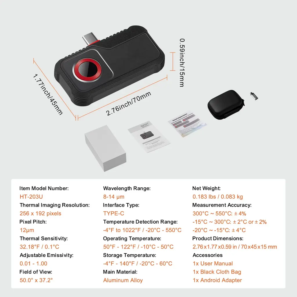 High-Definition Thermal Imaging: Experience crystal clear imaging with thermal camera, featuring 256 x 192 high IR resolution. It offers -4°F to 1112°F extended temperature range and 32.13°F / 0.07°C thermal sensitivity, allowing for precise temperature measurements and capturing even the subtlest temperature variations. Intuitive Touchscreen Control: Seamlessly control, zoom, and navigate images with our 3.2-inch large touchscreen. Stay connected via WiFi and conveniently store your photos and videos on the included 16GB storage card (13.9GB available) for further analysis. Real-Time Insights: The 25Hz refresh rate ensures smooth image streaming and lag-free thermal imaging, providing real-time insights into temperature changes and thermal patterns. No crucial details are missed, even during fast movements or transient events. Convenient Visible Light: Our pocket thermal imager combines 256 x 192 IR thermal imaging with 300,000-pixel visible light. Easily overlay thermal and visible light images to better understand temperature distribution and target appearances, providing better target differentiation. Thoughtful Details Refined: infrared thermal imager is optimized with numerous user-friendly features: 3000mAh high-capacity battery, DOD ≥ 80% after 500 charge-discharge cycles, 3 auto power-off time options, multiple language support, and IP54 rated protection. See the unseen, identify issues with ease! Package Content 1 x User Manual 1 x Drop-proof Strap 1 x TYPE-C Cable