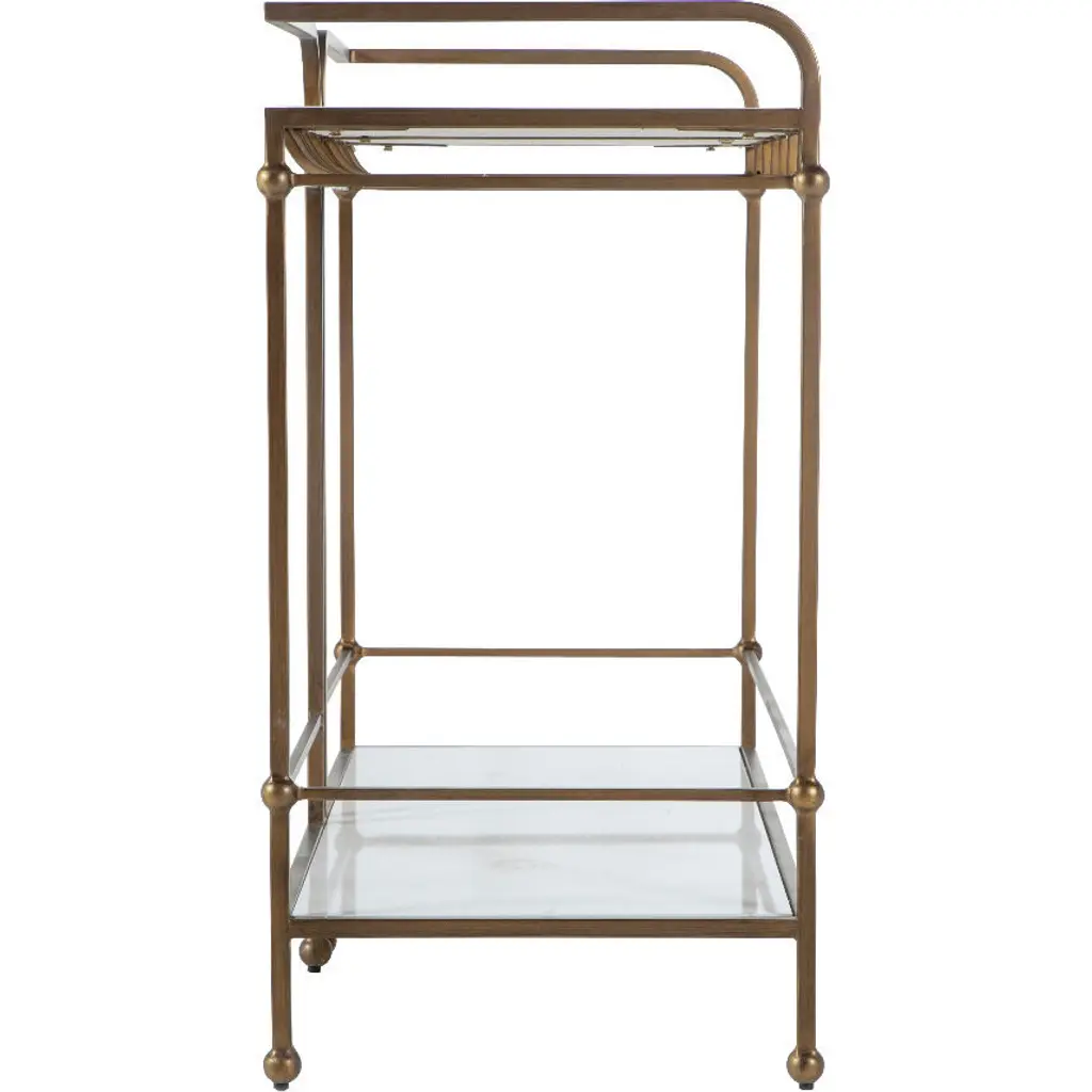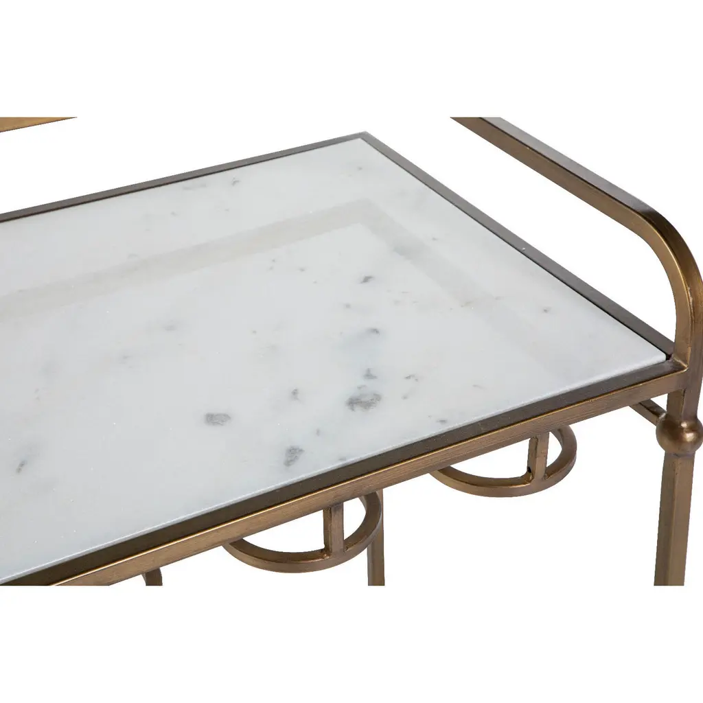 The Thia Bar Console exudes elegance with its sophisticated blend of brushed brass, cerused black, and Roman white marble. This stylish piece features a sleek iron frame with a fixed shelf, offering both durability and thoughtful storage space. The top surface is the perfect space for mixing cocktails, while the lower shelf provides additional storage for your favorite spirits and mixers. Crafted with natural materials, each console features unique variations in color and pattern, adding to its charm and character. Perfect for entertaining, the Thia Bar Console combines practicality with refined aesthetics, making it an eye-catching addition to any space.