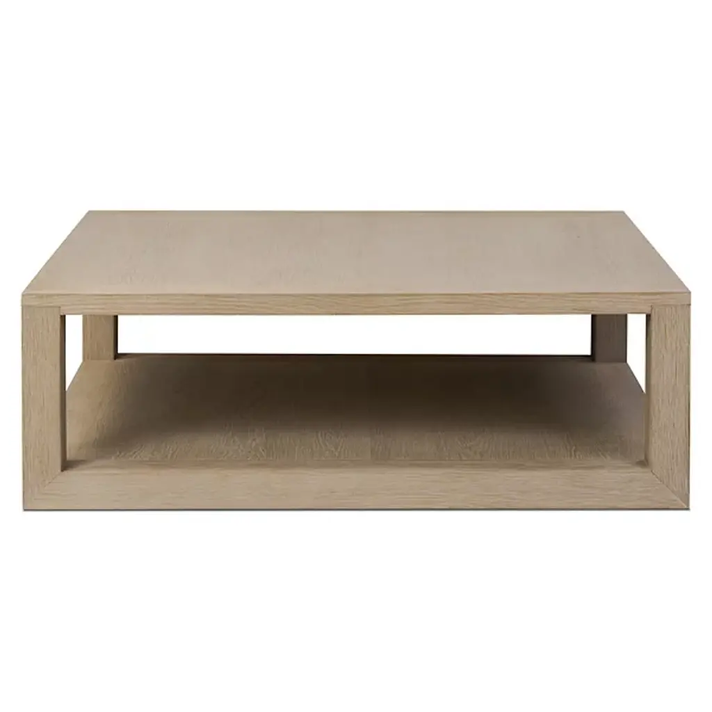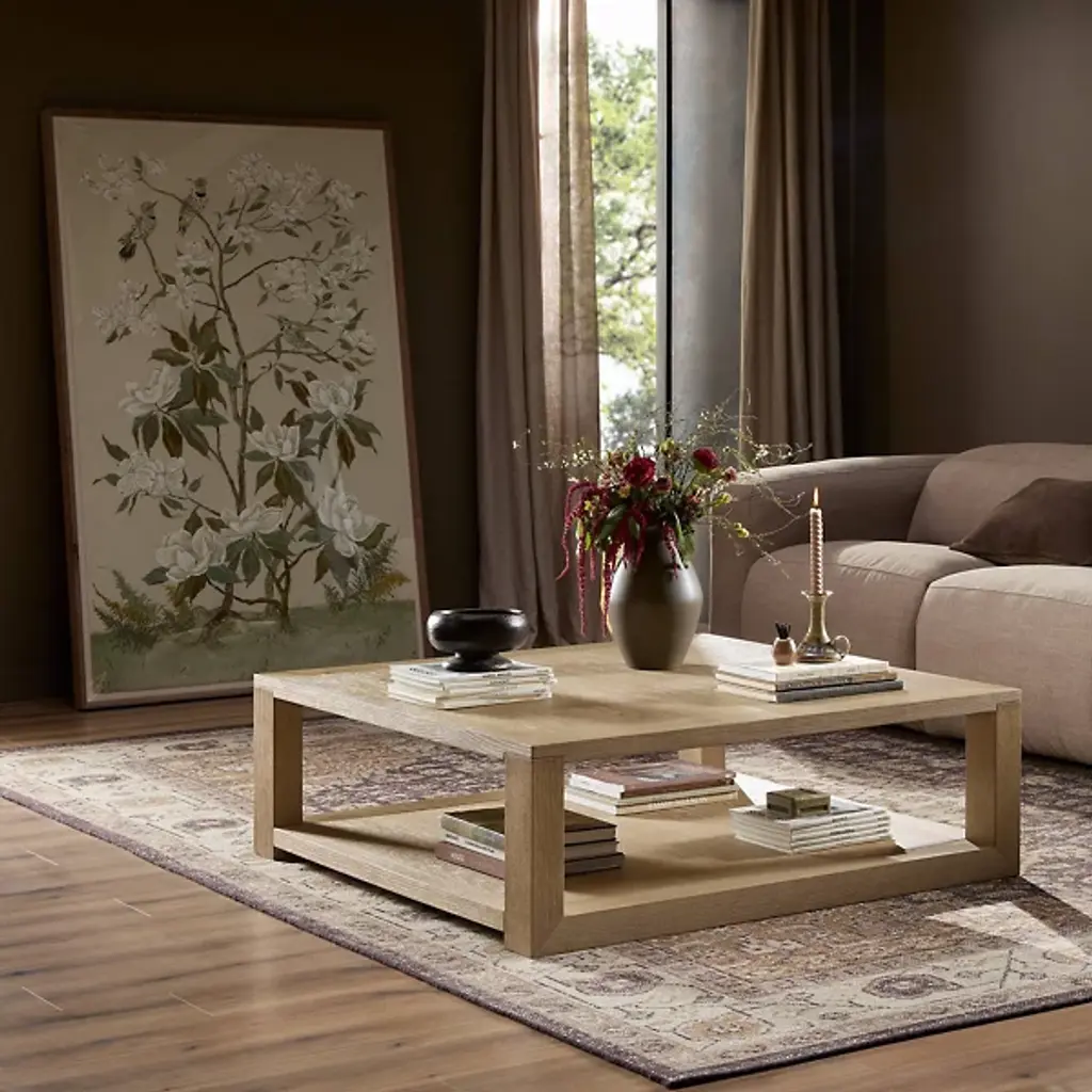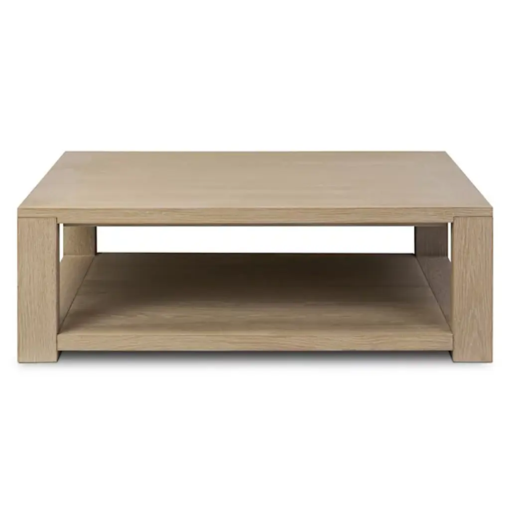 The Thomas Square Coffee Table from Four Hands adopts bleached solid oak construction in clean geometric proportions that anchor living spaces with architectural confidence. The square-shaped top provides ample surface area while lower shelving adds practical storage for books, magazines, and decorative objects. Light oak finish brightens the wood's natural grain patterns without obscuring the material's authentic character. This two-tier design maximizes functionality while maintaining visual lightness through open construction, creating coffee table storage that serves both daily needs and display purposes.