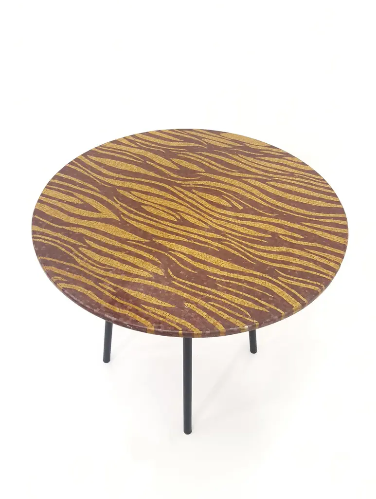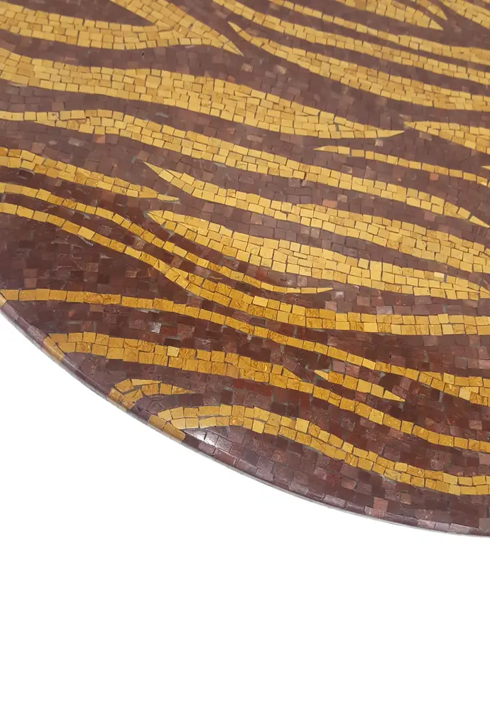 The Tiger Table is inspired by one of the most popular Stephanie Odegard's carpet designs. The table is made with a high quality fine stone mosaic overlay of semi-precious and fossil stones. Each piece of stone is about 8mmx8mm each is carefully laid to create this beautiful effect of the Tiger stripes. Customization is our specialty.Prices do not include shipping from India (for custom orders) or our MN warehouse (items from stock). That will be additional.Available size: 32" x 32" x 01" Material: Semi-precious and fossil stonesBuyer Cancellation-The cancellation charge is 25% which increases to 50% if the production is started.Prices do not include shipping from India (for custom orders) or our MN warehouse (items from stock). That will be additional.