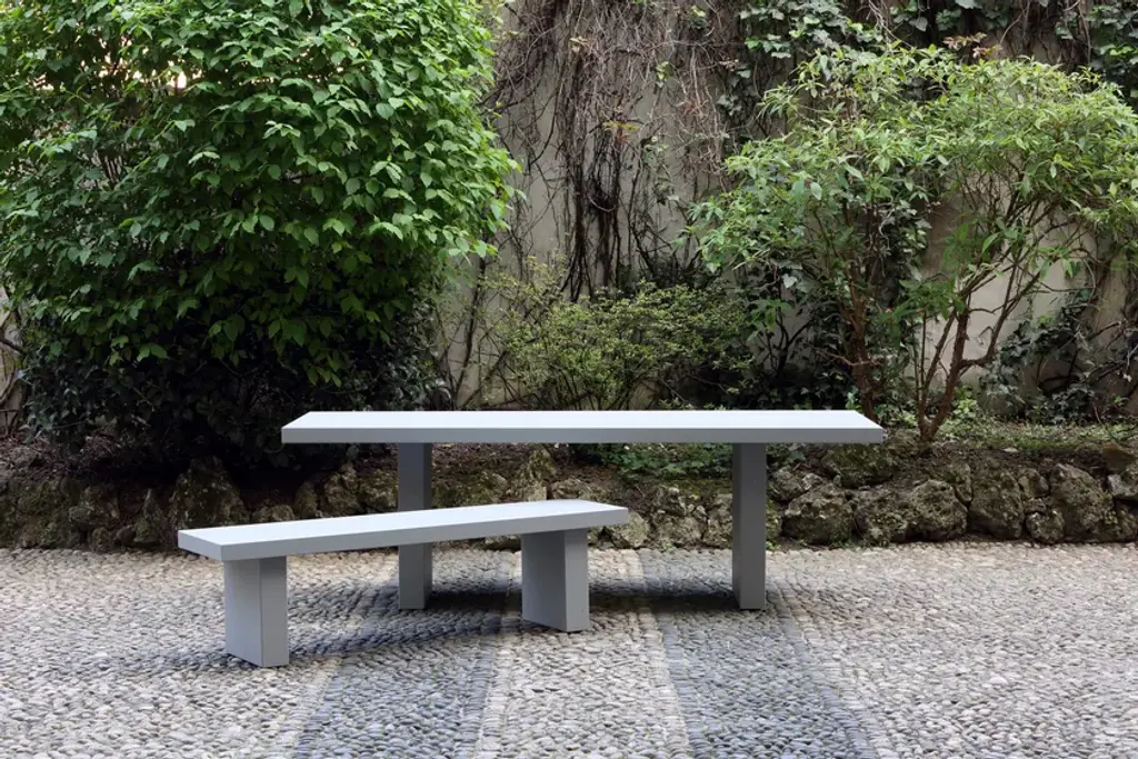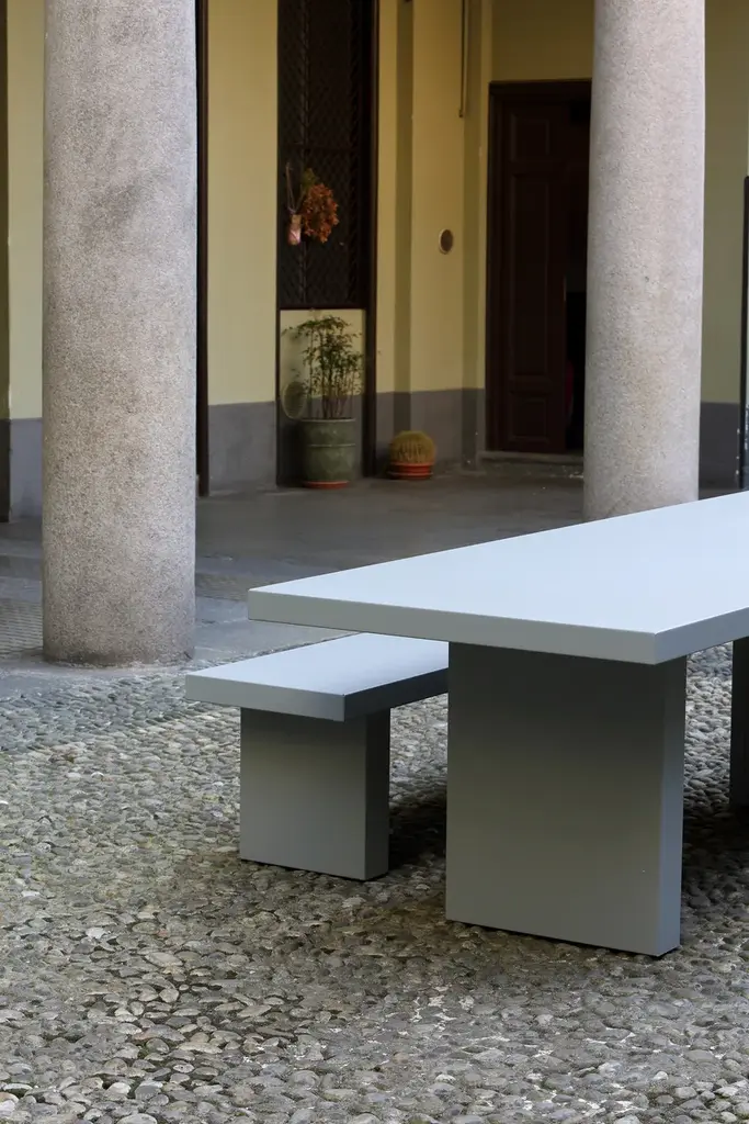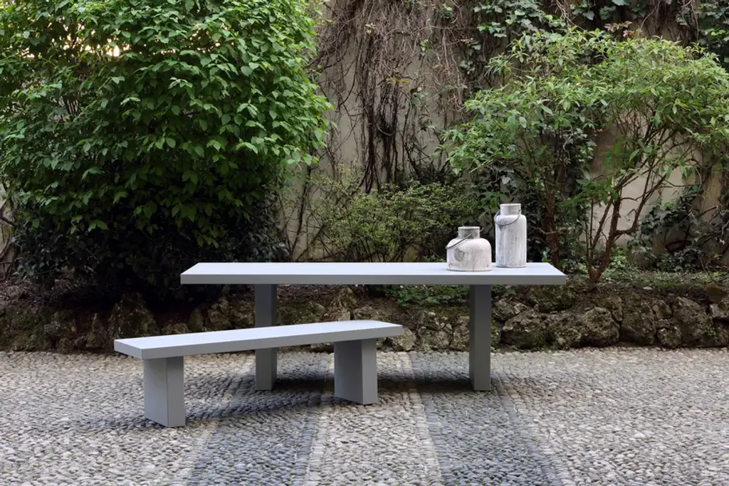 Tommaso is a concrete grey colour epoxy painted table.For indoor/outdoorCharacteristics:Products of Outdoor Collection are designed to be used outdoor. If left all time directly in contact with atmospherical agents without any protection, they will change – as it happens to all outdoor products. During winter we suggest to tilt the table legs and the banch of some cm in order to have water flowing and not becoming stagnant.