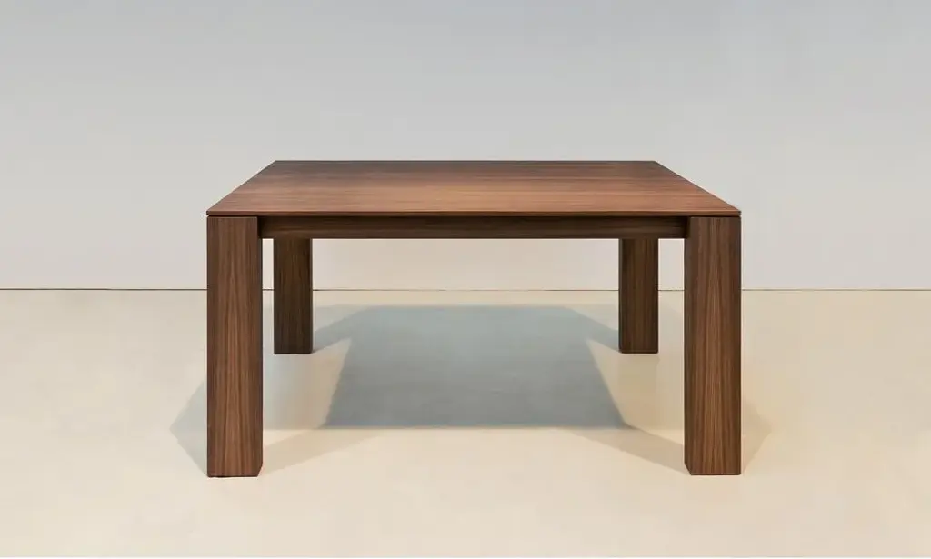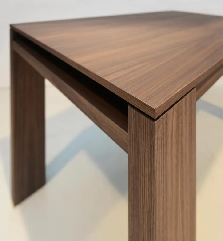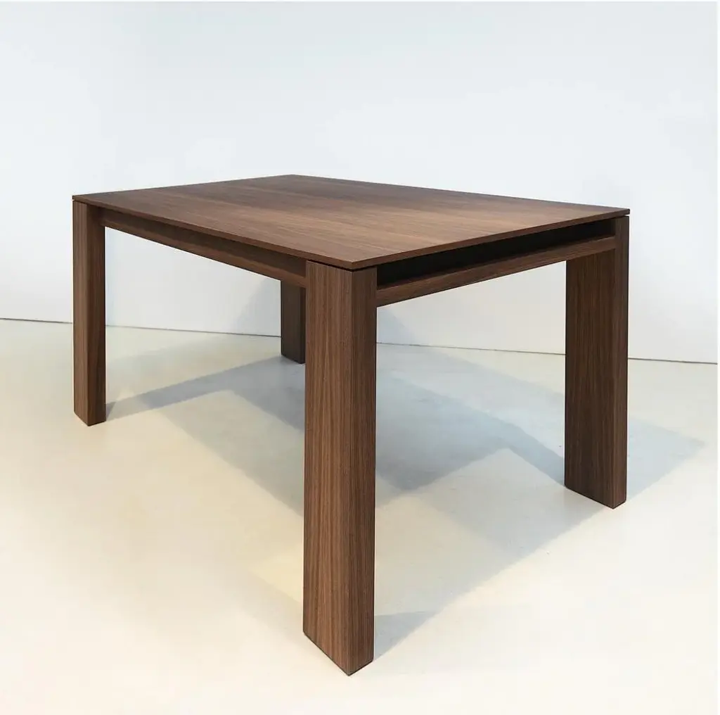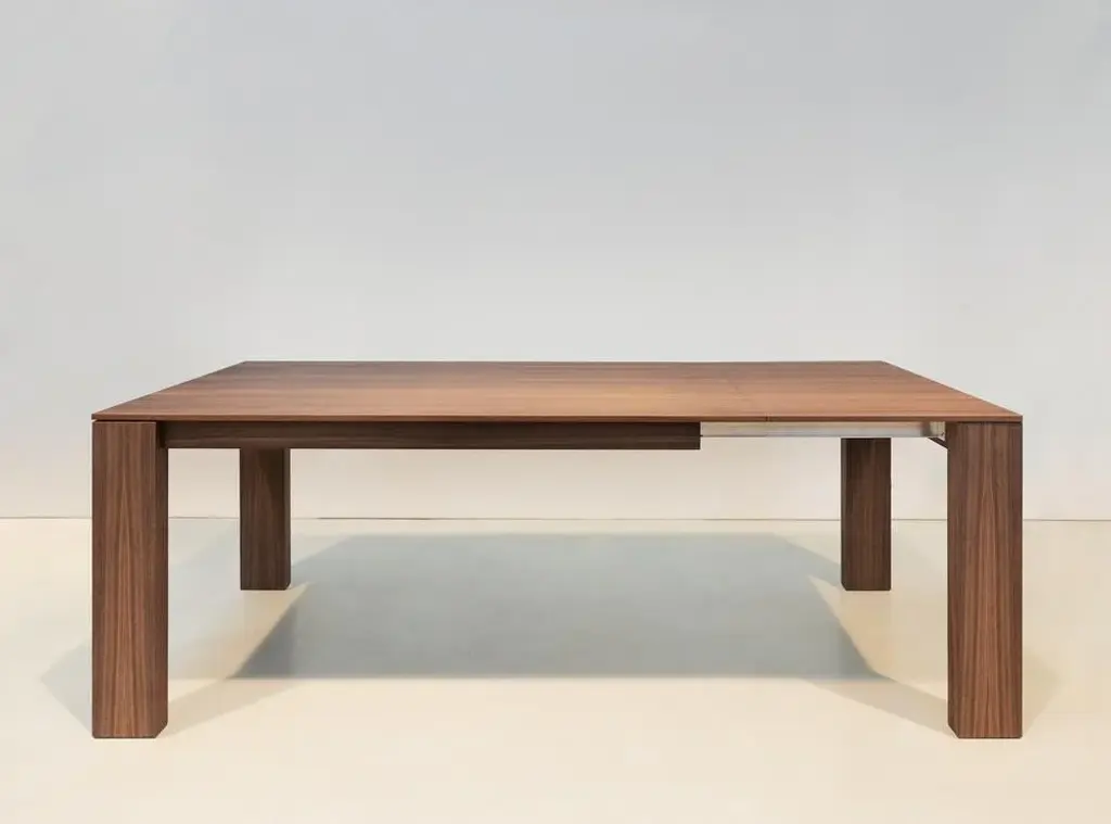 "Rectangular table veneered walnut real wood, extendable with anodized aluminum telescopic mechanism, which allows, when the table is closed, to have the whole floor without cuts. The easy opening is carried out with the movement of the legs which, always remaining at the end, allow maximum usability of the spaces. Characteristic of the table is the reduced thickness of the 15 mm plane. " Signed by Maker