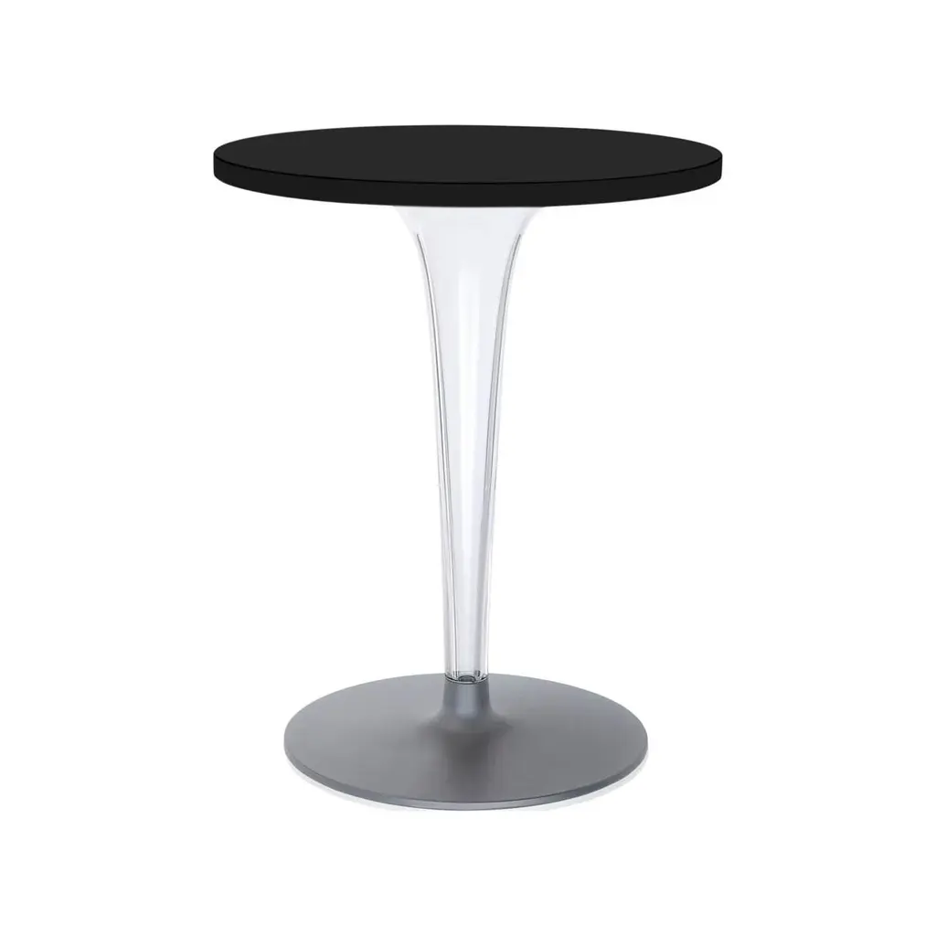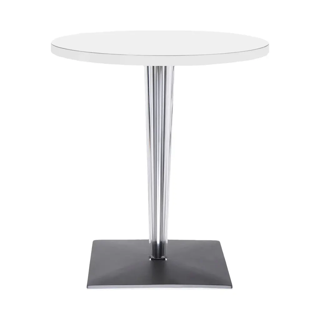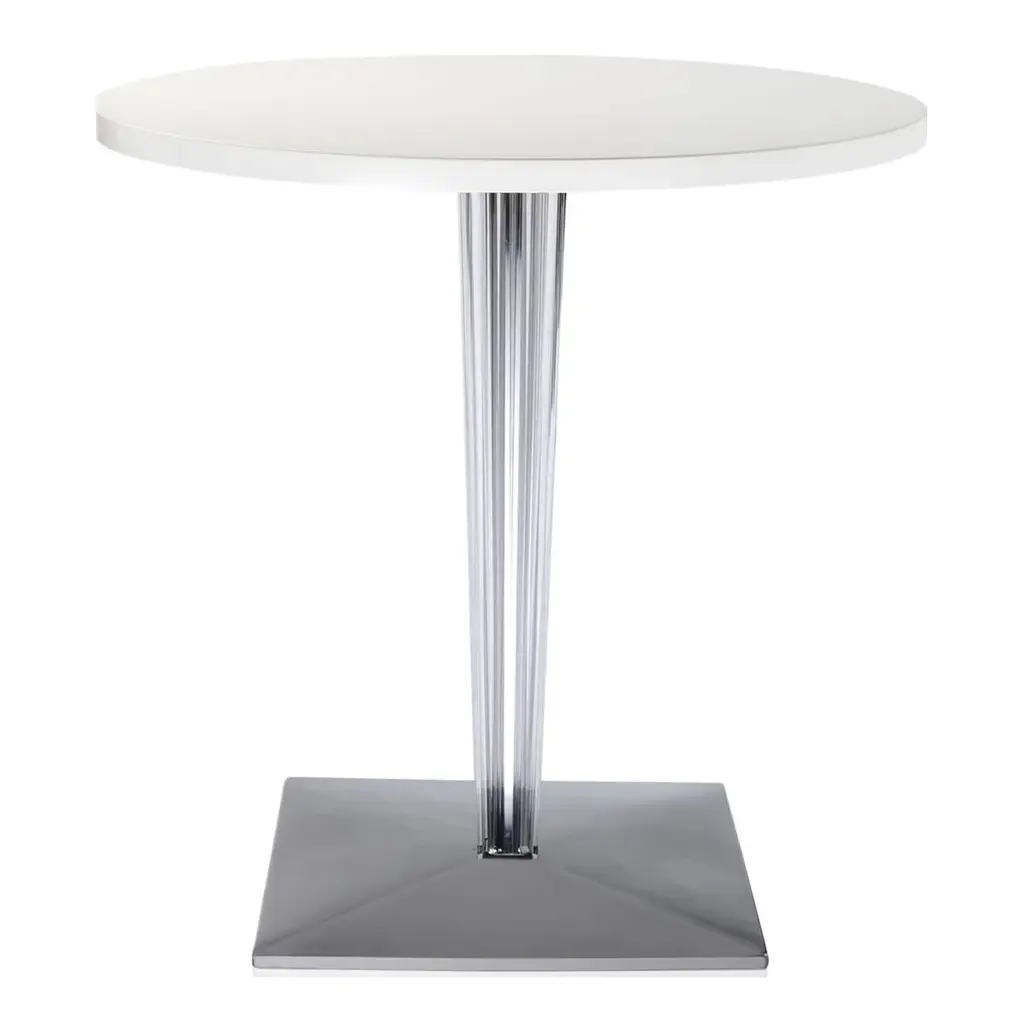 The second TopTop table version is especially suited for indoor bar and restaurant use and always features the central transparent circular or square section leg with a pleated surface and metal core. The top is round or square laminate and the base is made of painted aluminum. Features