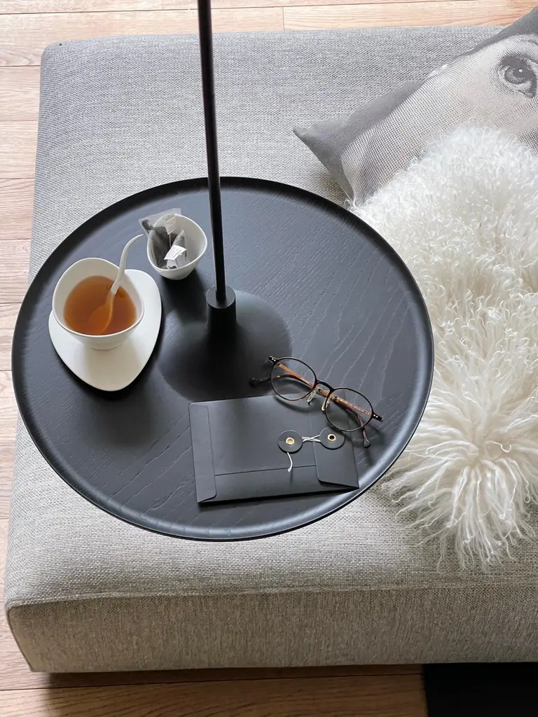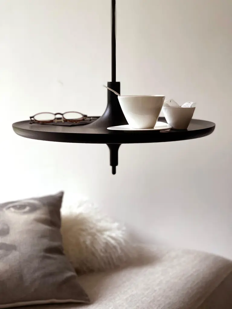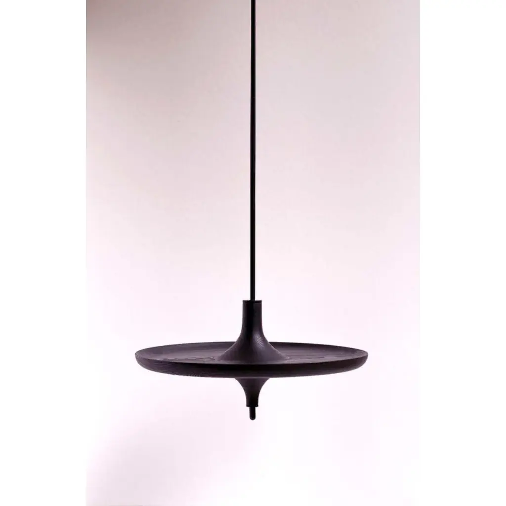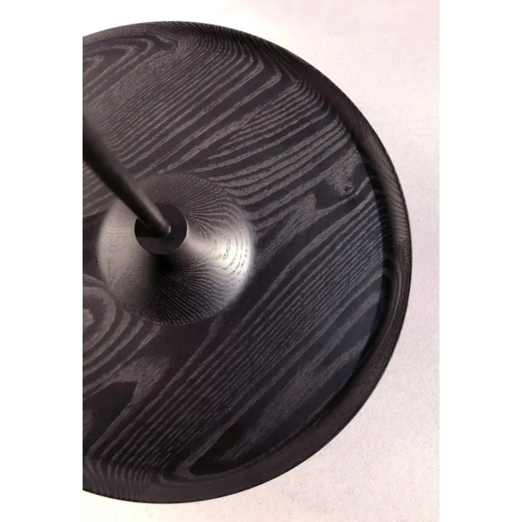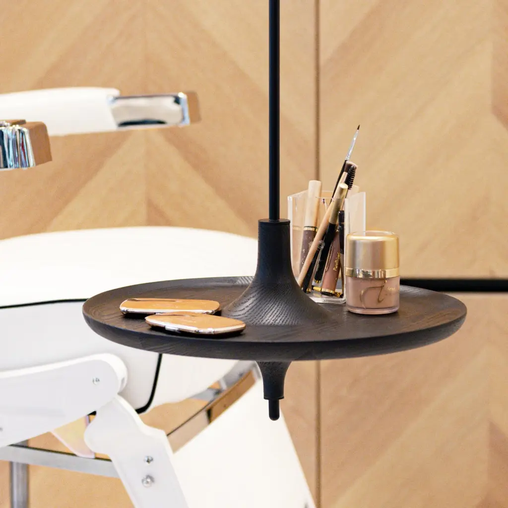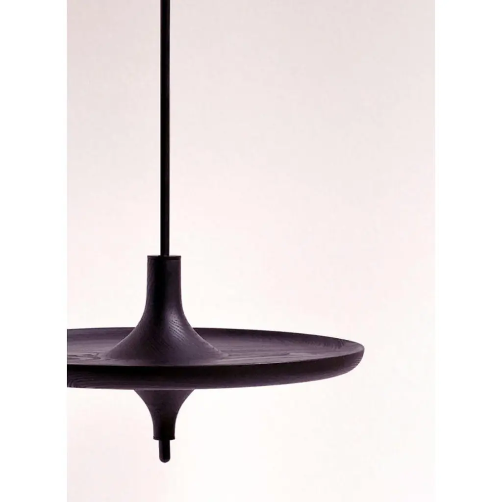 Toupy Stained Ash And Black Metal 44 Hanging Table by Mademoiselle JoDimensions: Ø 44 x H 200 cm.Materials: Stained ash wood and black metal.Available in four colors, two bar versions and several diameters. Please contact us. Taking the shape of a wooden spinning top, TOUPY is a futuristic shelf, born from the visual association between the functionality of a feeding tray and the essential design of the spinning top. Hanging from a metal bar fixed to the ceiling, it frees itself from the constraint of the floor to give it its airyappearance.More than a purely functional piece of furniture, its shape carved out of the mass of noble wood turned on the lathe invites us to perceive it as a sculpturalwork. Its round shape fluidifies the space and allows you to add a sober and elegant touch to your interior.Far from being an ordinary object, TOUPY is unique and has been designed to last. Trained as a stylist at La Cambre, I have worked for 25 years to create trends, colours and fabrics for the world of lingerie. Architecture has always been my passion and as such, object design has become an obvious path for me.My approach is based on intuition, with a fascination for the material and the intention to offer something beautiful and different. My vision delicately intertwines heritage and technology, aiming to offer creations at the right price, designed to last and be transmitted, while trying to produce as local as possible and to highlight our know-how.A responsible commitment for a sustainable product.We offer products produced with great care in Belgium and Europe. Useful creations that make you smile, creations you pass on, objects that will have multiple usages in their different lives following the imagination of their owner.