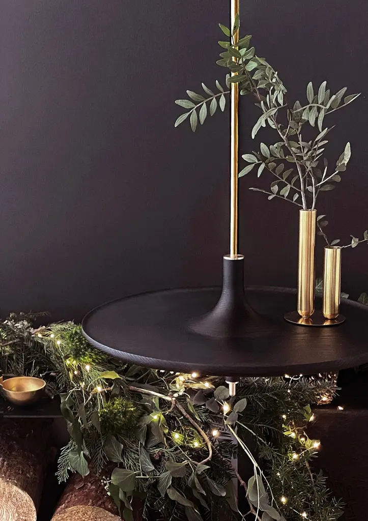 Toupy Stained Ash And Brass 38 Hanging Table by Mademoiselle JoDimensions: Ø 38 x H 150 cm.Materials: Stained ash wood and brass.Available in four colors, two bar versions and several diameters. Please contact us. Taking the shape of a wooden spinning top, TOUPY is a futuristic shelf, born from the visual association between the functionality of a feeding tray and the essential design of the spinning top. Hanging from a metal bar fixed to the ceiling, it frees itself from the constraint of the floor to give it its airyappearance.More than a purely functional piece of furniture, its shape carved out of the mass of noble wood turned on the lathe invites us to perceive it as a sculpturalwork. Its round shape fluidifies the space and allows you to add a sober and elegant touch to your interior.Far from being an ordinary object, TOUPY is unique and has been designed to last. Trained as a stylist at La Cambre, I have worked for 25 years to create trends, colours and fabrics for the world of lingerie. Architecture has always been my passion and as such, object design has become an obvious path for me.My approach is based on intuition, with a fascination for the material and the intention to offer something beautiful and different. My vision delicately intertwines heritage and technology, aiming to offer creations at the right price, designed to last and be transmitted, while trying to produce as local as possible and to highlight our know-how.A responsible commitment for a sustainable product.We offer products produced with great care in Belgium and Europe. Useful creations that make you smile, creations you pass on, objects that will have multiple usages in their different lives following the imagination of their owner.