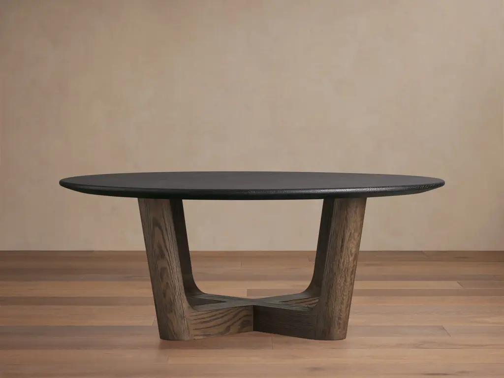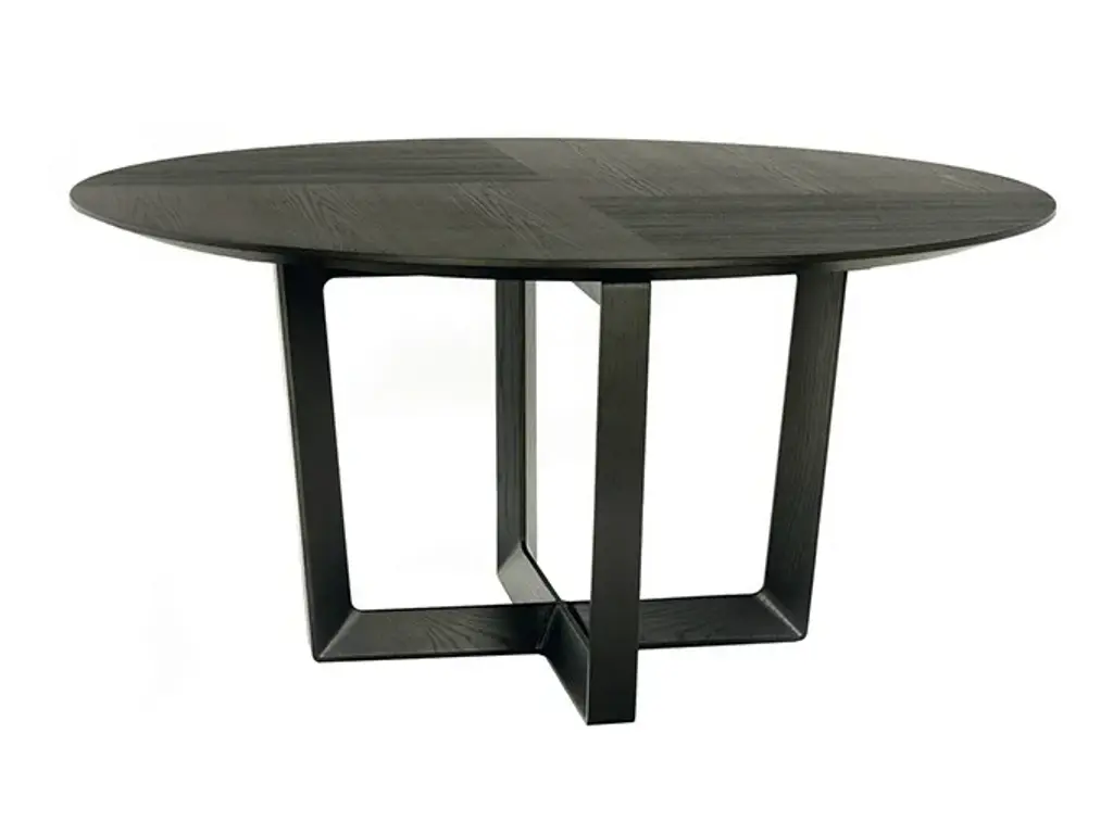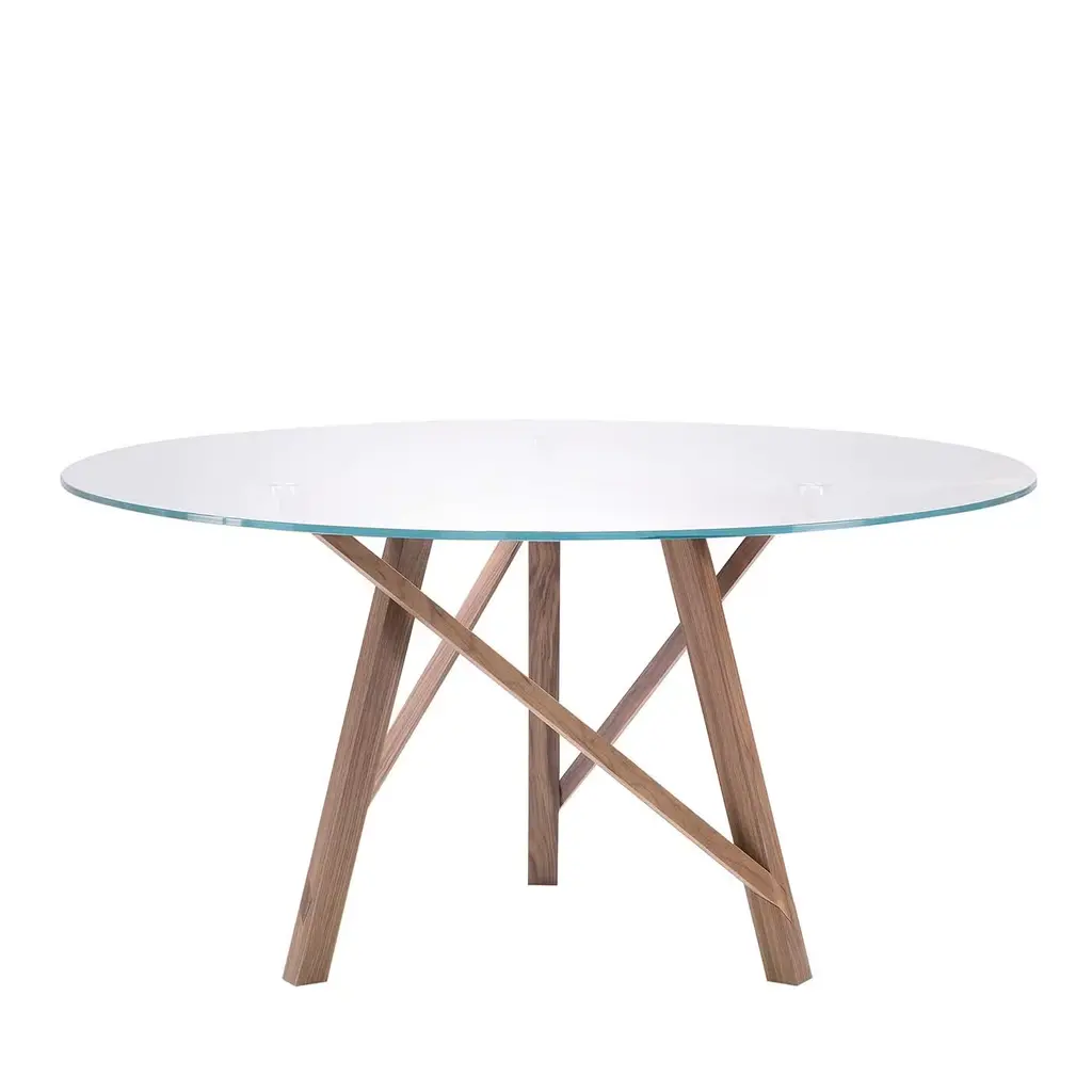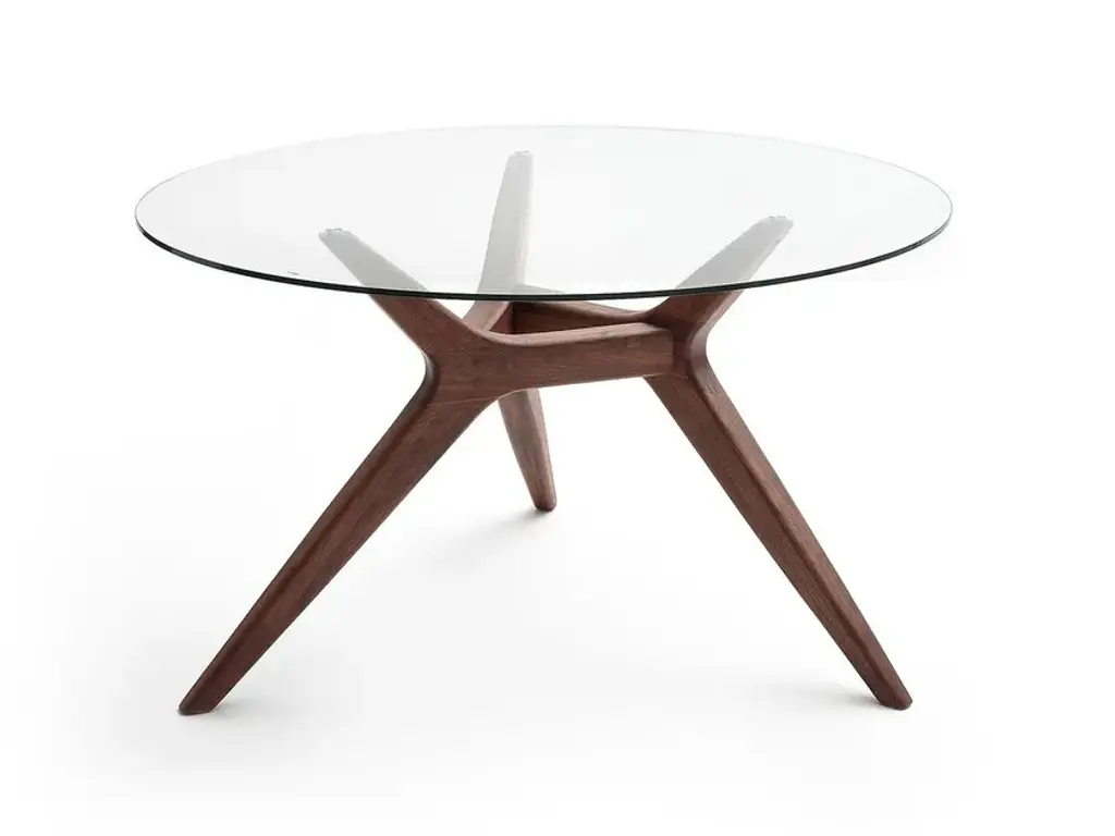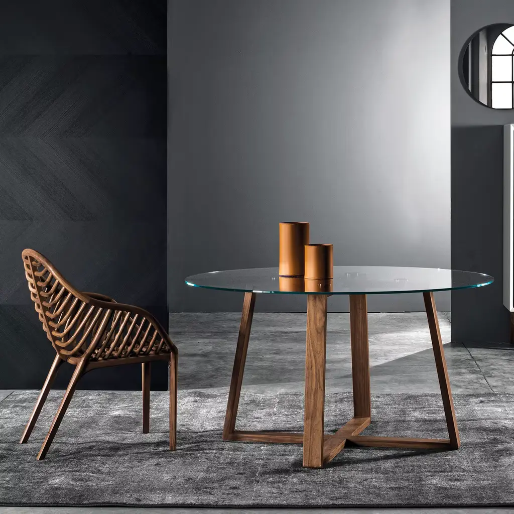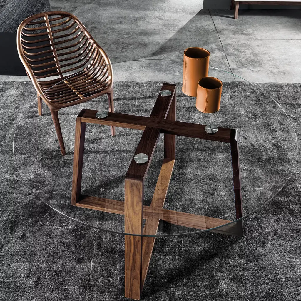This stunning round table is as versatile as it is striking, boasting character and elegance in its combination of curved and straight lines and contrasting materials. Its base in matte Canaletto walnut crosses at the center, highlighting the symmetry of this design, and supports the smoky glass round. The structure is also available in ash please consult the Concierge for details.