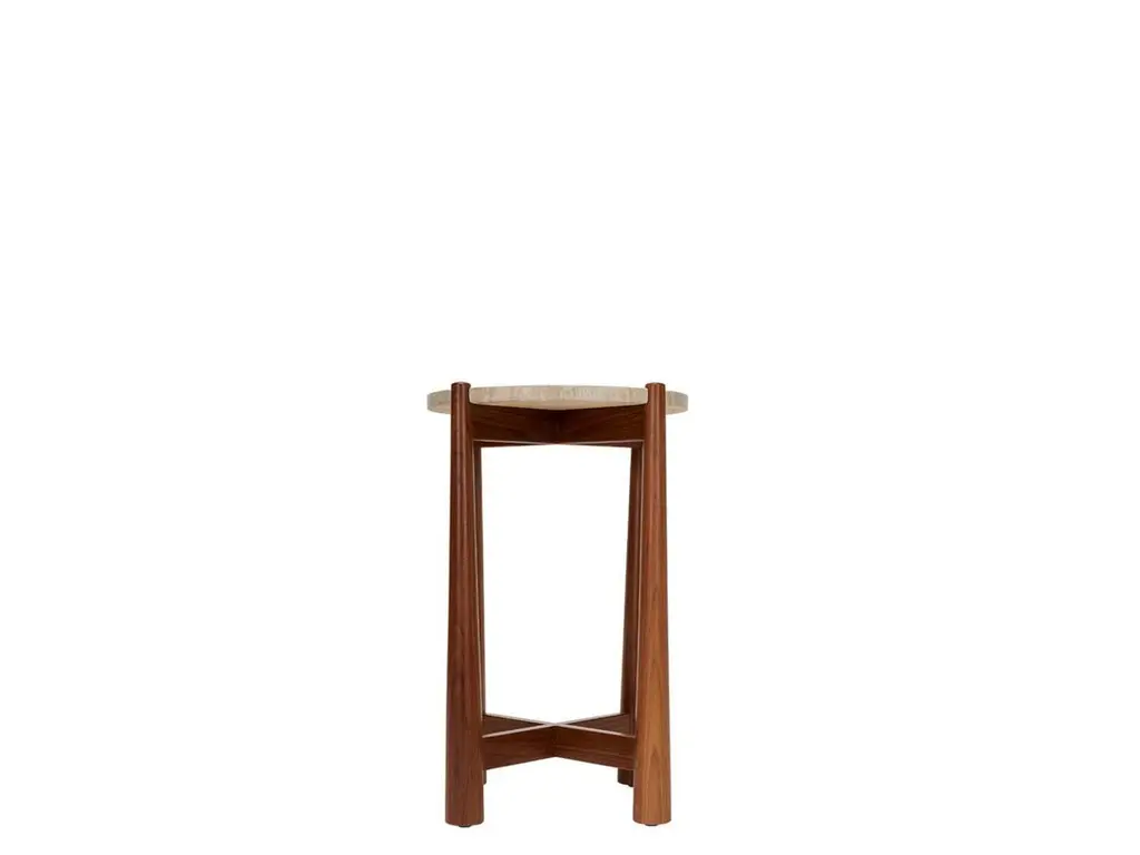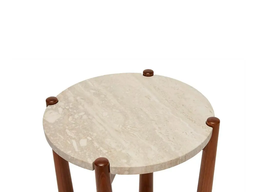 The Bronson drinks table features a round stone top with notched corners that rest atop a detailed walnut or oak base.The Lawson-Fenning collection is designed and handmade in Los Angeles, California. Reach out to discover what options are currently in stock.