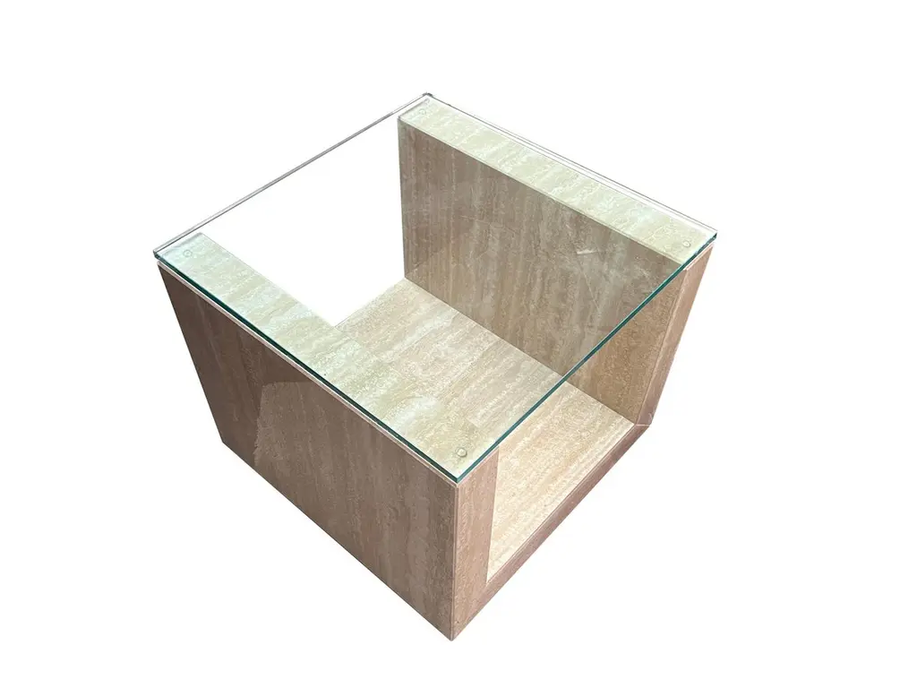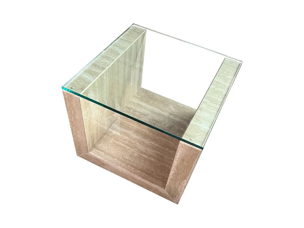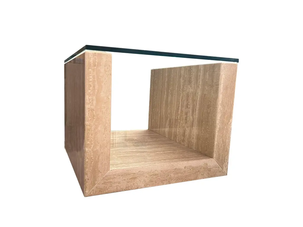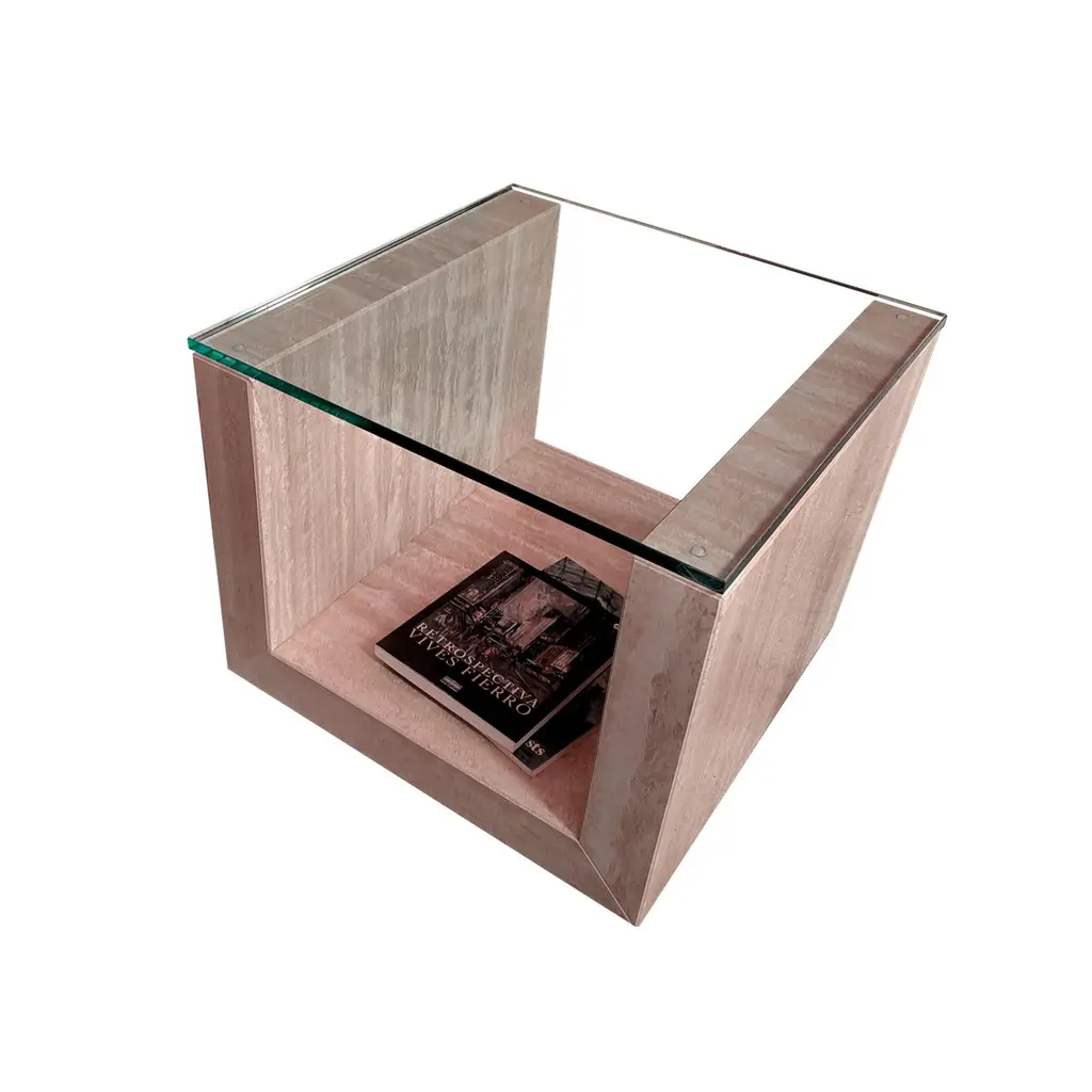 Travertine Marble AMIA Auxiliary Side Table Contemporary Design Meddel in StockTravertine marble side table perfect to complement a decorative environment. The structure of this travertine marble side table is "U" shaped with a glass top. The table has casters for easy mobility in the space.The finish of this table is polished, which brings an extra shine and therefore a brightness to the space by reflecting light. The beige cream travertine marble is perfect to combine with other colors either in textiles or in artwork.Amia has a contemporary design with straight lines and exact proportions of the marble in its structure, which makes this side, table a decorative element of great aesthetic value. Its high benefit is given both by its exquisite design, perfectly proportioned and executed, and by its material, which stands out for its elegance and quality.Its author Joaquín Moll is a connoisseur of travertine marble and an expert in designing pieces of furniture that combine marble with glass. Completely timeless pieces that last over time, even if the years go by, Amia will always be a table that combines with any decorative style and completely adapts to the living room space.
