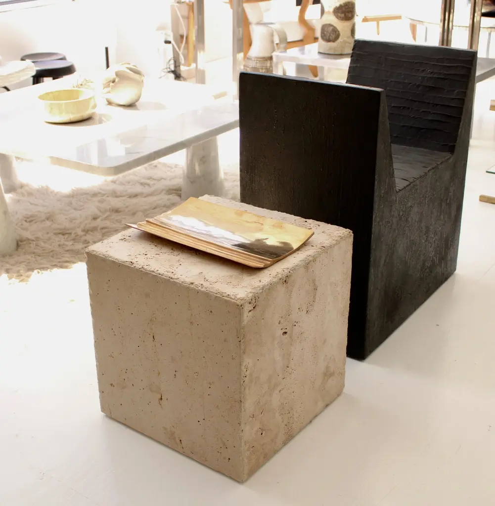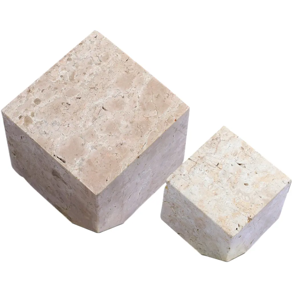 Italian travertine cube shaped side table, end table or coffee table.Also a great drinks table.Design with rustic edge Pavilion Antiques and 20th c These can be purchased as a single or in pairs or multiplesEach table is composed on different travertine slabs making each table unique.Each slab is chosen for its unique veining and texture.These tables make great side tables, coffee tables in multiples, or sculpture stands.They are contemporary and may be ordered individually or in multiples.These tables can be used as a stool for sitting but not constructed for standing on. Italian travertine rectangular tall side tables, end tables, coffee table or a great drinks table. Contemporary bespoke design rustic edge by Pavilion Antiques and 20th c Each table is composed on different travertine slabs making each table unique.Each slab is chosen for its unique veining and texture.These tables make great side tables, end tables, drinks table, coffee tables or sculpture stands.Italian travertine rectangular tall side table, end table or a great drink table.Each table is composed on different travertine slabs making each table unique.Rustic edge travertine table designed by Pavilion Antiques and 20th c.Each slab is chosen for its unique veining and texture.These tables make great side tables or sculpture stands.They are contemporary and may be ordered individually or in multiples.Photo shows a pair. Price per table. Please note that each table will be different as the marble is always different and these photos represent tables that have been made in the past or currently. Each table is unique as the marble is always unique. The edges are always a chiseled edge.Photos show various configurations of usage. They are contemporary and may be ordered individually or in multiples.Lead time is 2-3 weeks.Not intended for outdoor useShipping is per item. These tables cannot ship ups or fed and must be shipped via private shipper within the USA. Please contact before ordering.