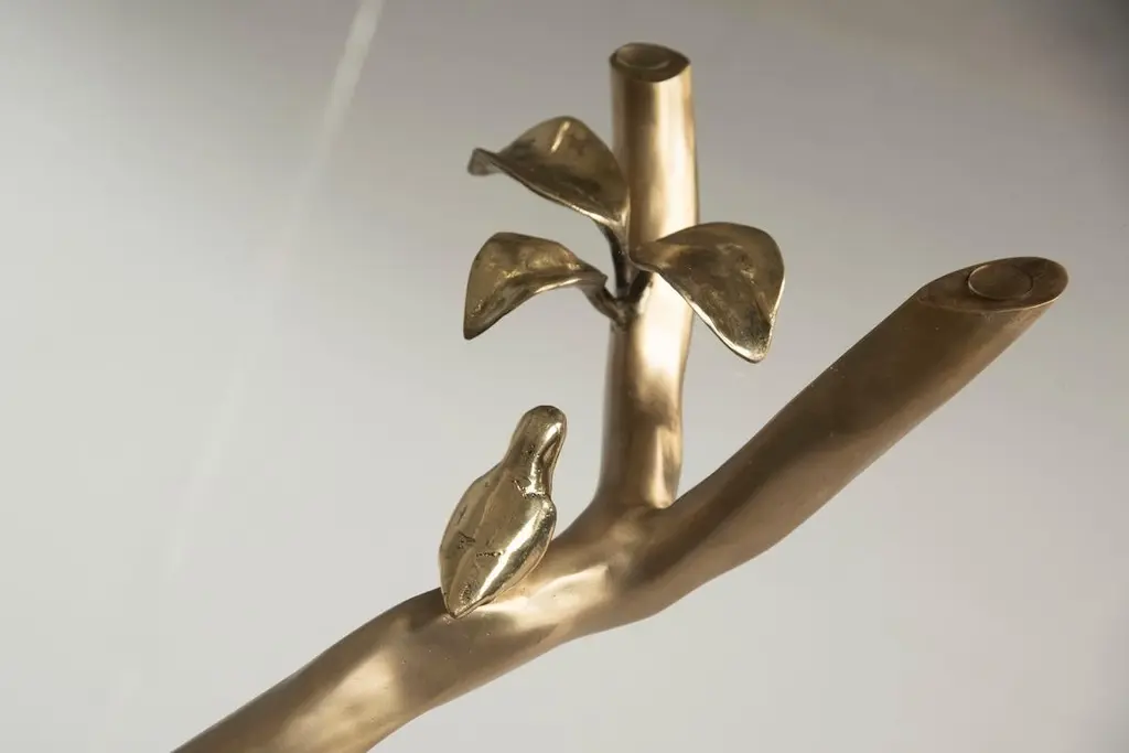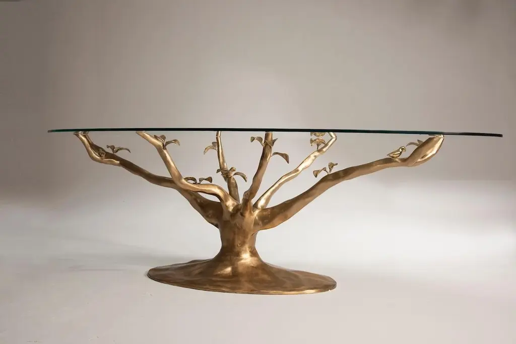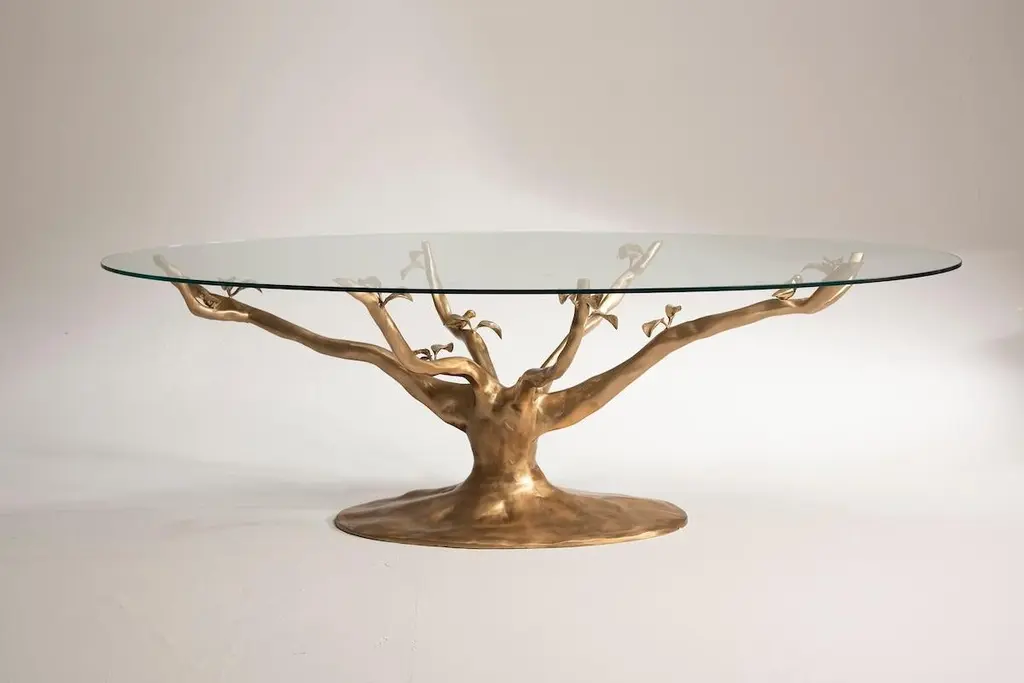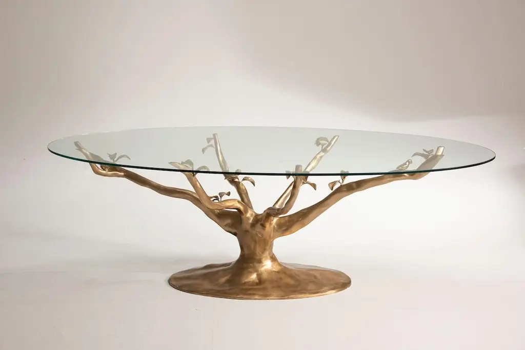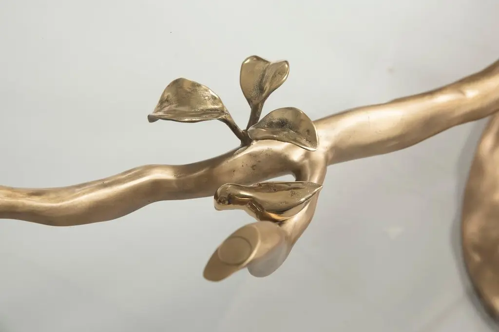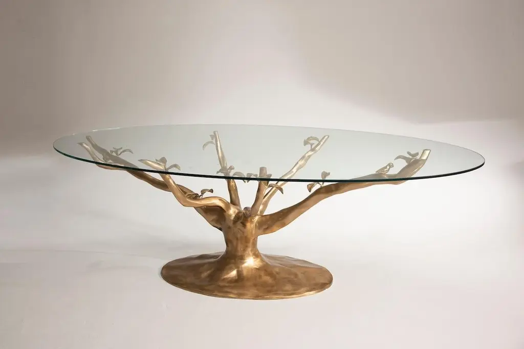 Pescetta sculpture table, a unique work of design and material, handcrafted entirely in Italy.The table has a central leg reminiscent of a tree trunk, with leaves and birds, totally made of cast brass.The style of the table is inspired by the Deco period of the 1940s.The weight of the table is 90 kg.The top is made of 15mm glass measuring 240x120cm but can be substituted in size and color depending on the customization required.Minimum 220 up to 260cm, width 110 up to 140cm.Price INCLUDES the costs for any packaging and crates needed to protect the item and keep the item stable during any International travel ( tailored made wooden crate and inner professional packaging ). Price of the Item DOES NOT INCLUDE the shipping quote which will be calculated according to your destination.