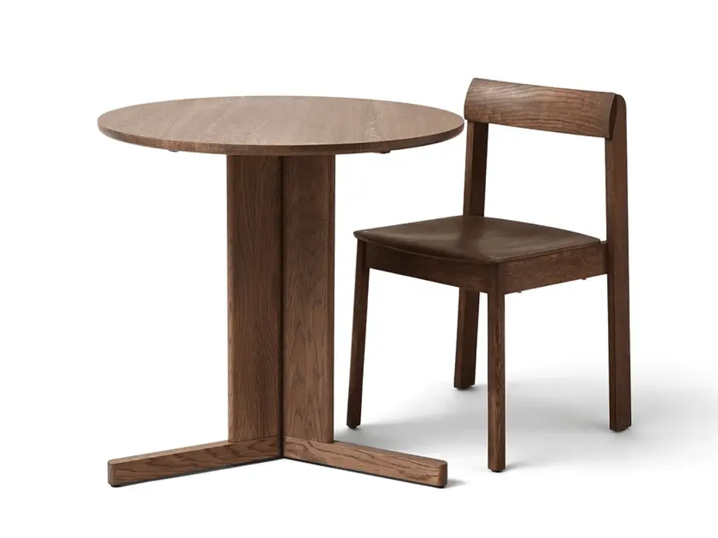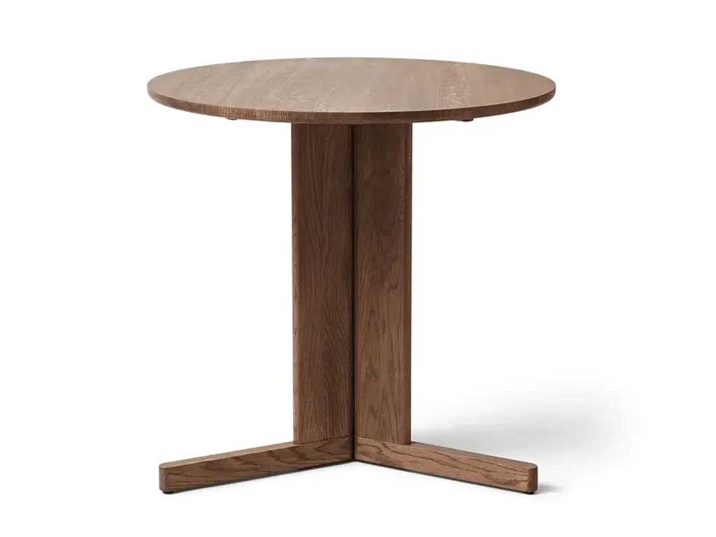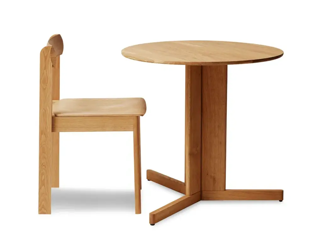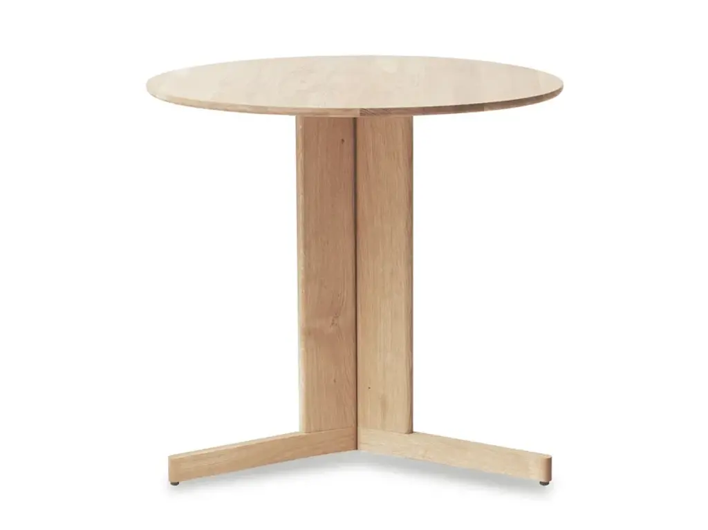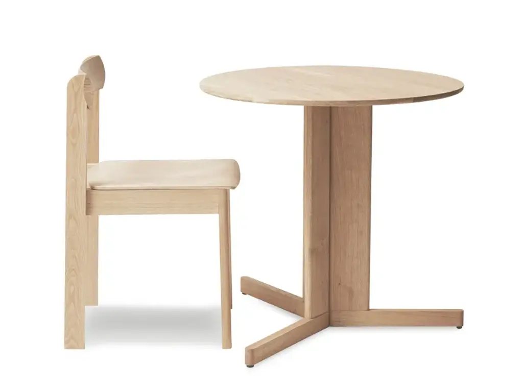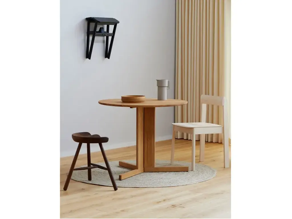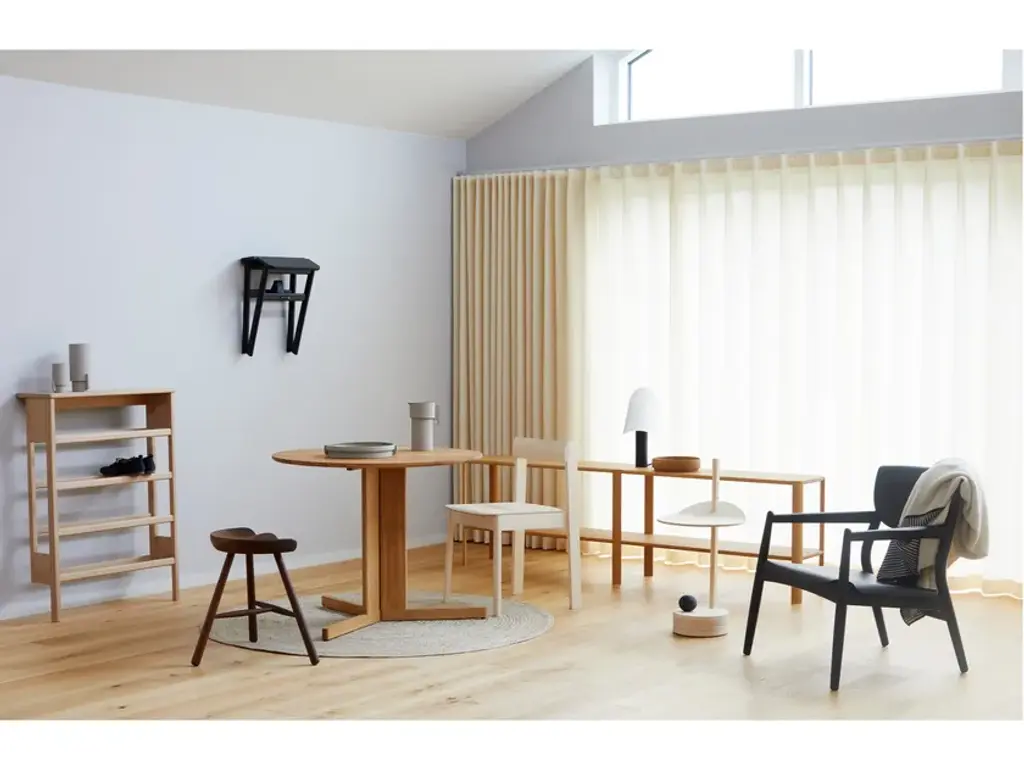 Trefoil is a table in solid oak, characterized by a base in which three feet join centrally and support the round top, making this piece of furniture light visually but stable and resistant at the same time. The design of the three legs allows to sit comfortably without hindering the seat. This table, available in natural or white oak, is suitable for home, work and public spaces. “The frame of table was an aim to create an interesting shadow effect where three identical legs meet each other. The three legs stand very close together and shape the characteristic construction of the table.” Herman Studio