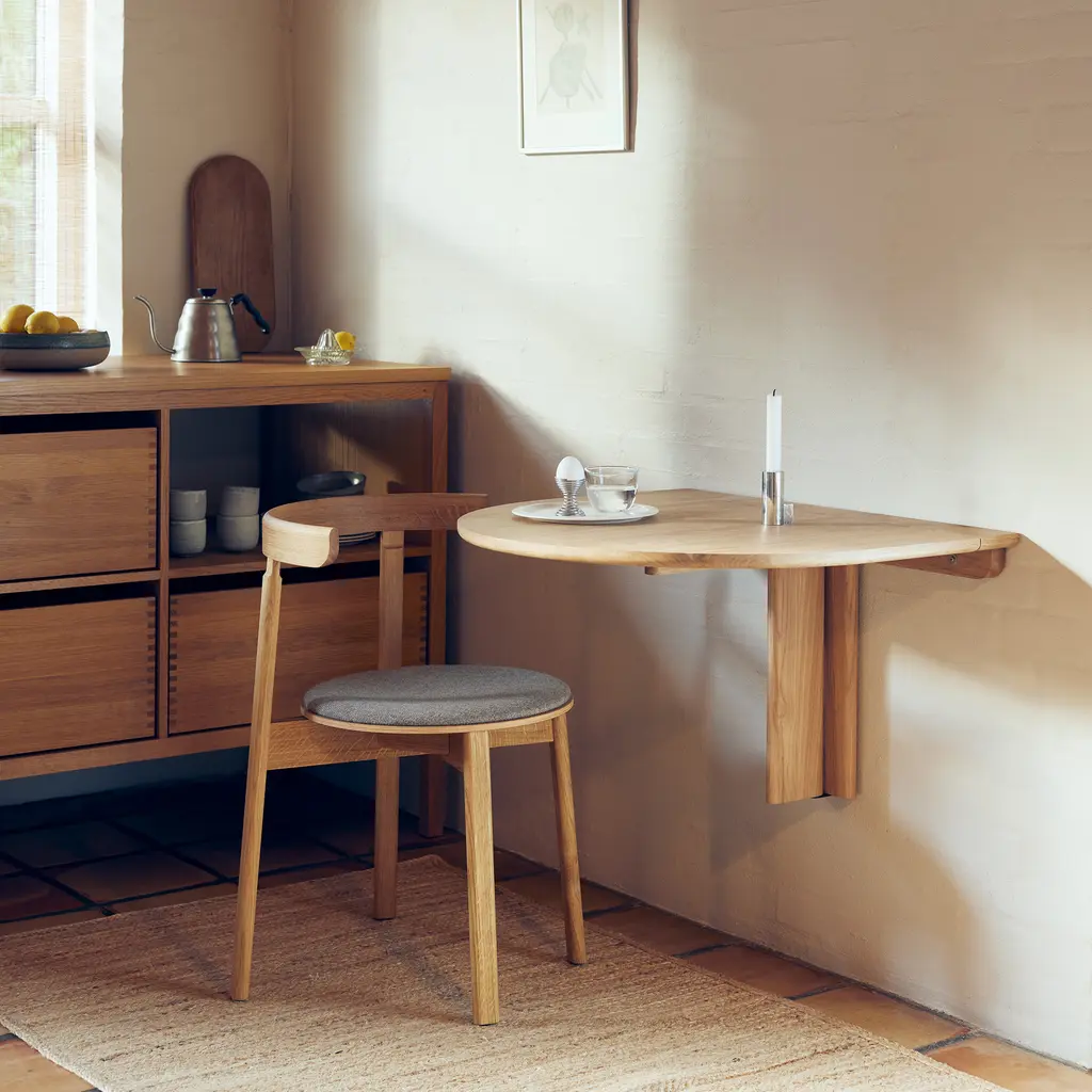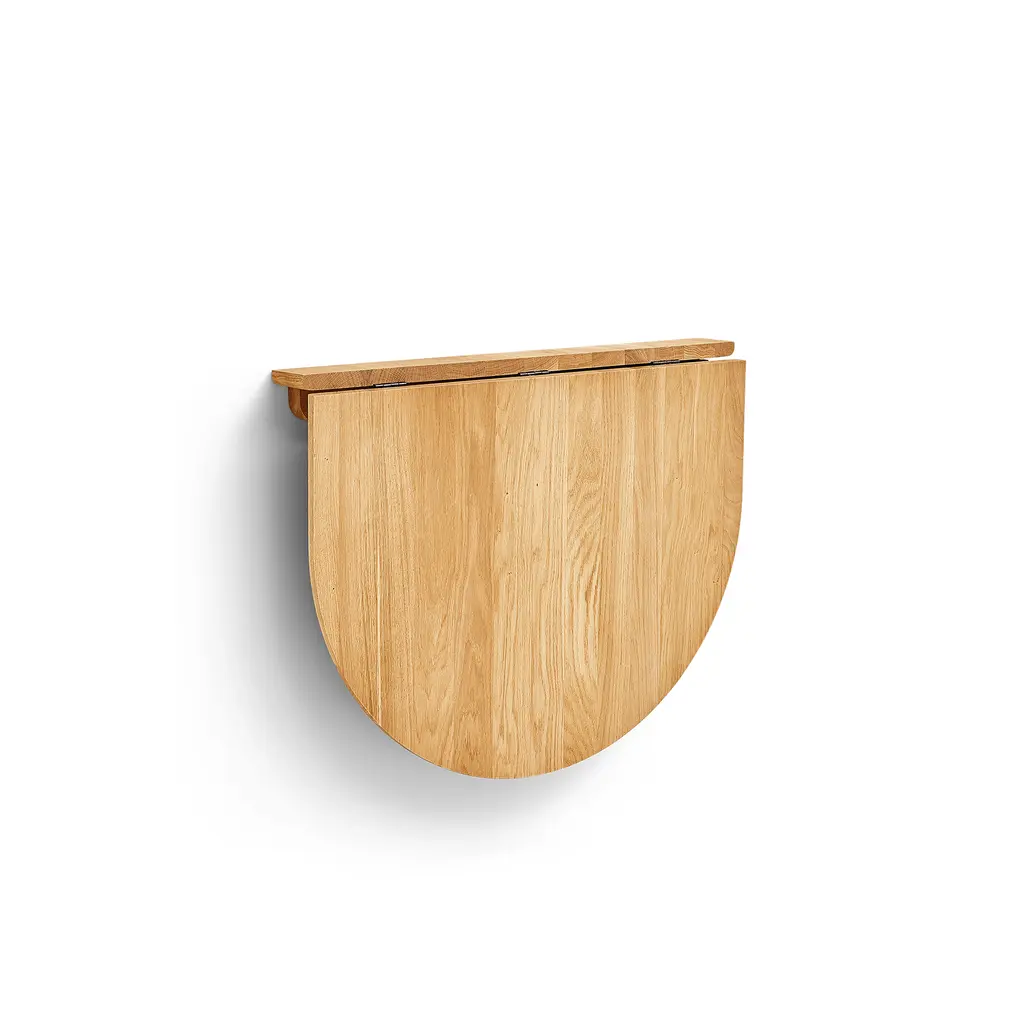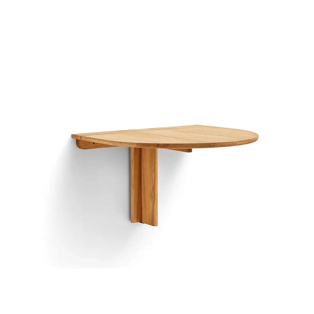Specially designed to save floor space and maximize function, the Form & Refine Trefoil is a practical and elegant wall mount folding table. Created by Jonas Herman, this piece of furniture is versatile and simply perfect for compact rooms, apartments, and any area where free space is extra-precious. When it comes to the best place for a wall mounted table, kitchen areas and home offices are a great choice, but you can install this Trefoil table anywhere. The design fits into any décor with ease, making this wall mount fold out table perfect for your home. Once installed, the oval table can be opened or folded as needed. The base and support rest against the wall, leaving the floor completely free and providing ample leg room. Additionally, with this wall mounted table, folding the top creates a narrow shelf where you can place a mug or small items. Made from solid wood, the Form & Refine Trefoil Folding Wall Table is crafted from FSC-certified European oak and comes with a natural oil finish. Freestanding tables from the same series are also available.