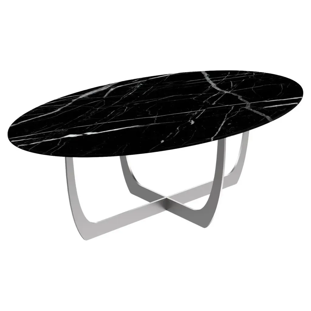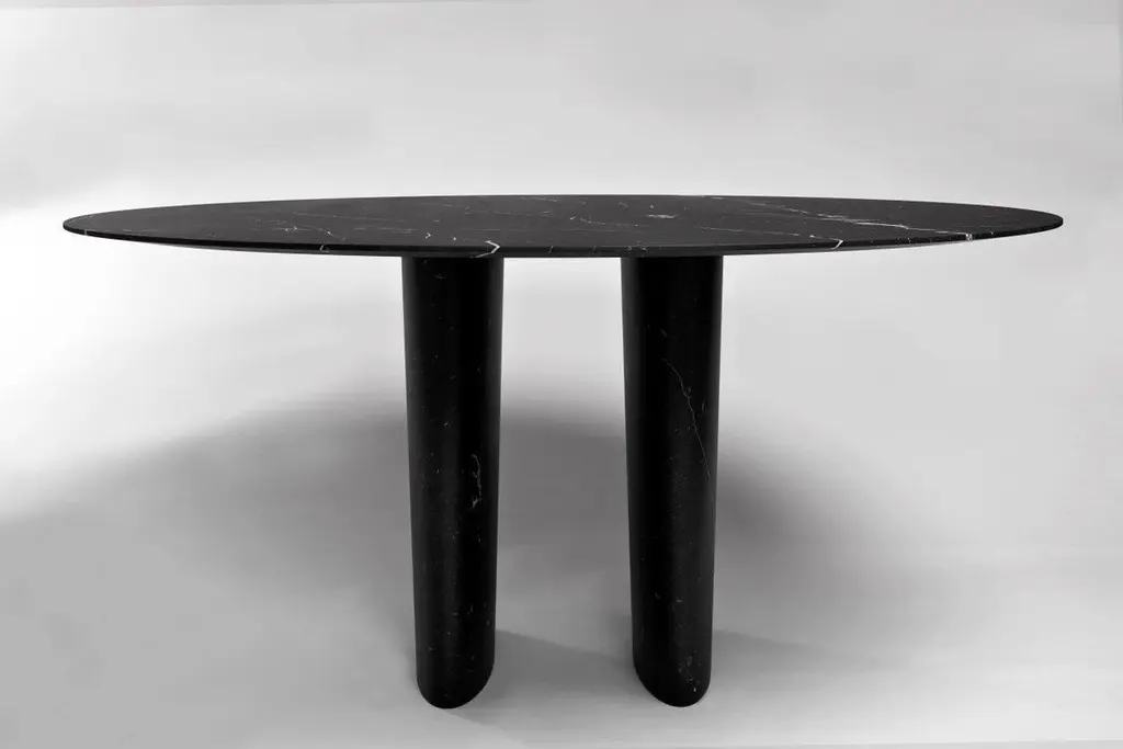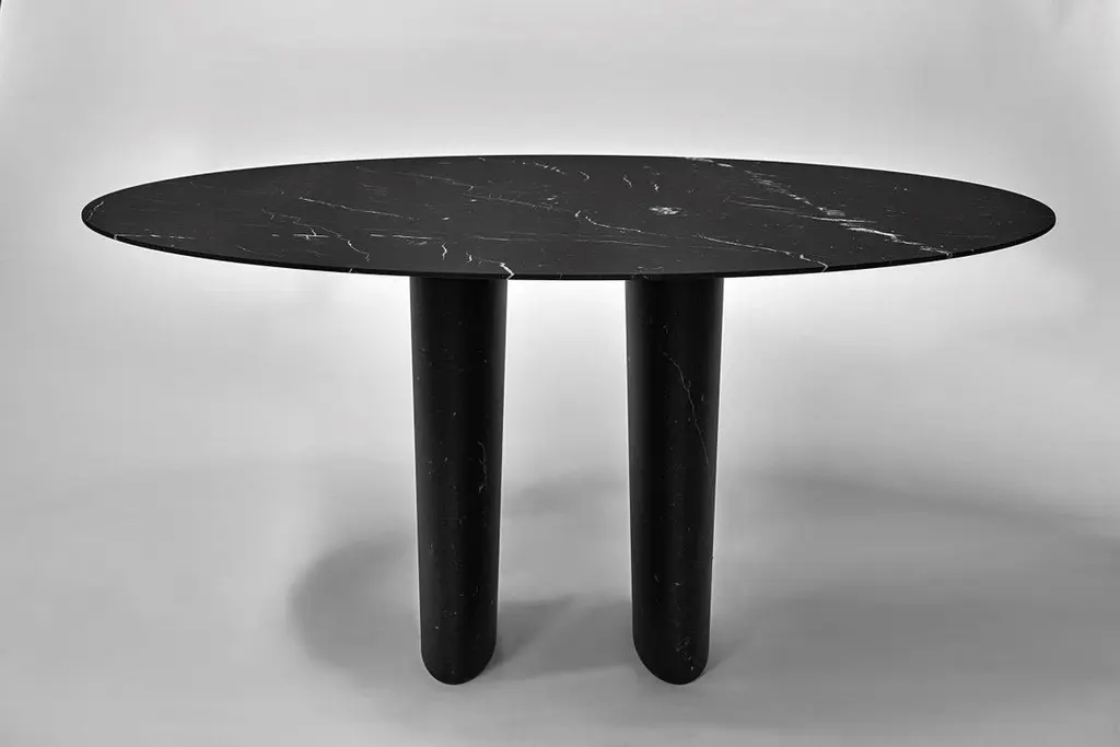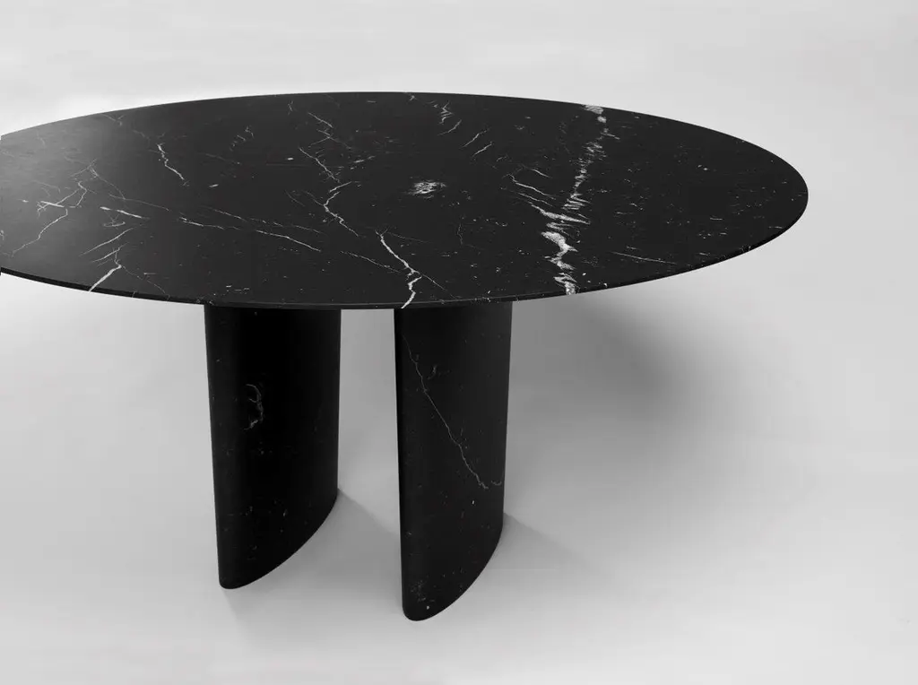 The trilite table is part of the newest table collection by Pibamarmi. The round top sits on two legs made of stone. Both top and legs are made of Nero Marquinia marble Customer can choose dimensions, shape and stones.