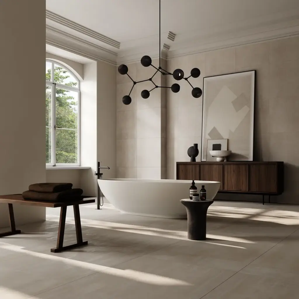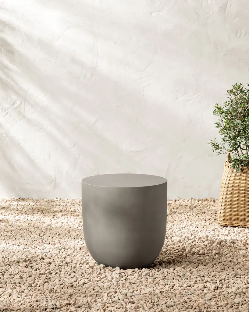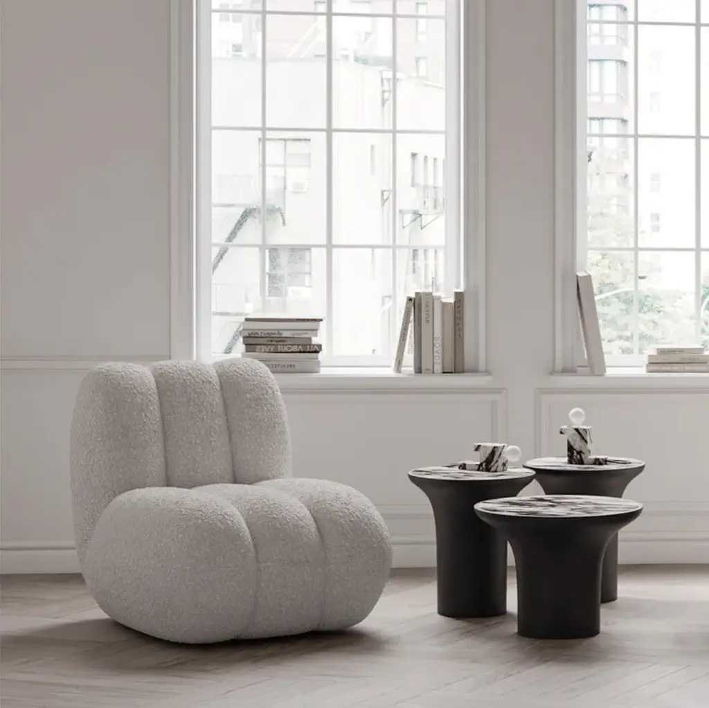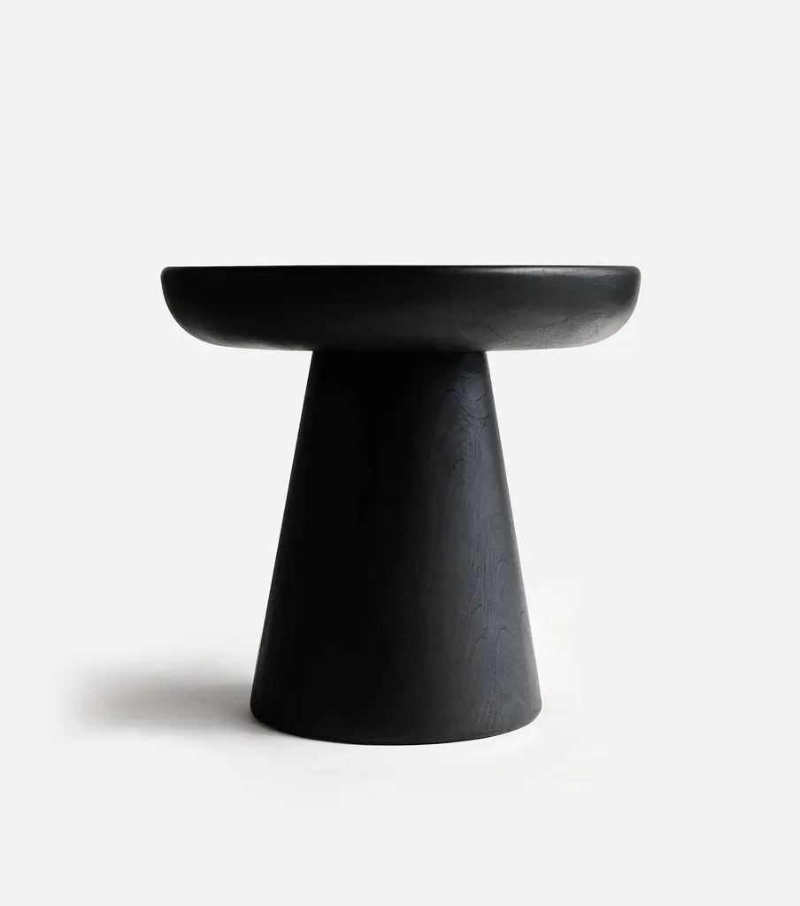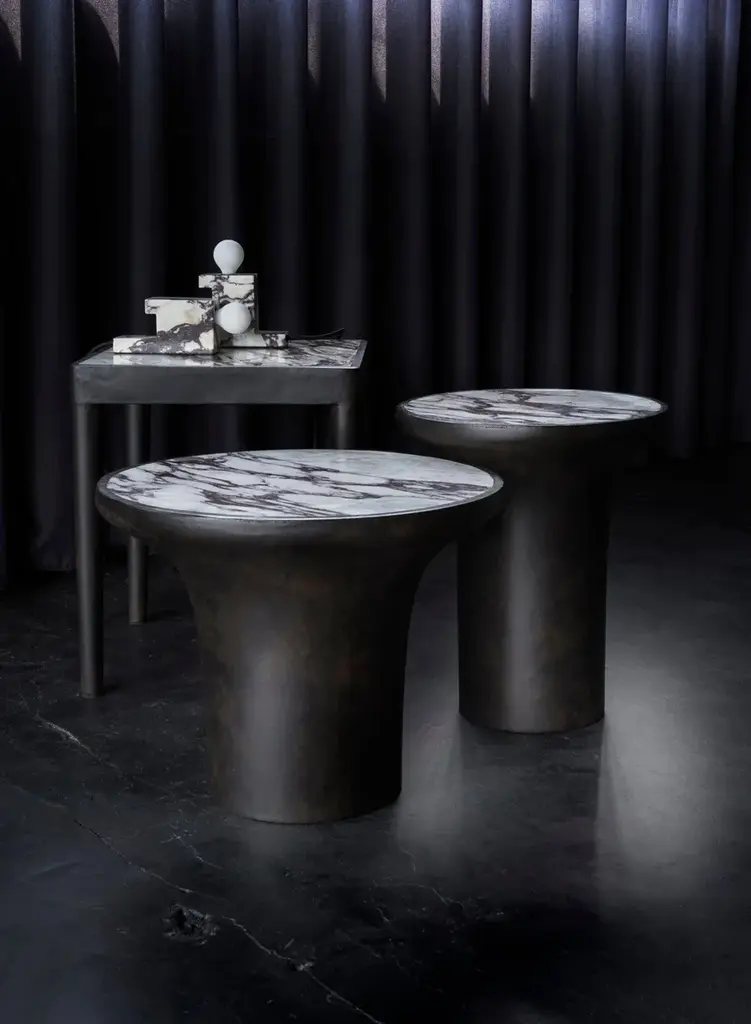 Trumpet Table is a round table made of fiberglass concrete and marble.