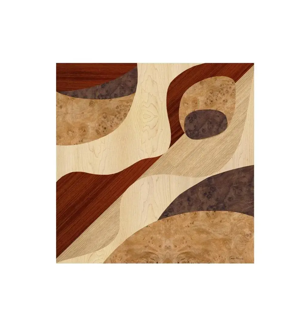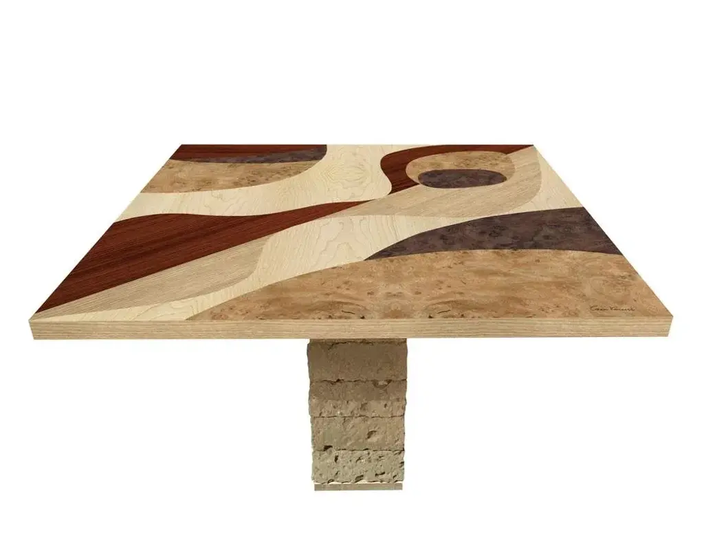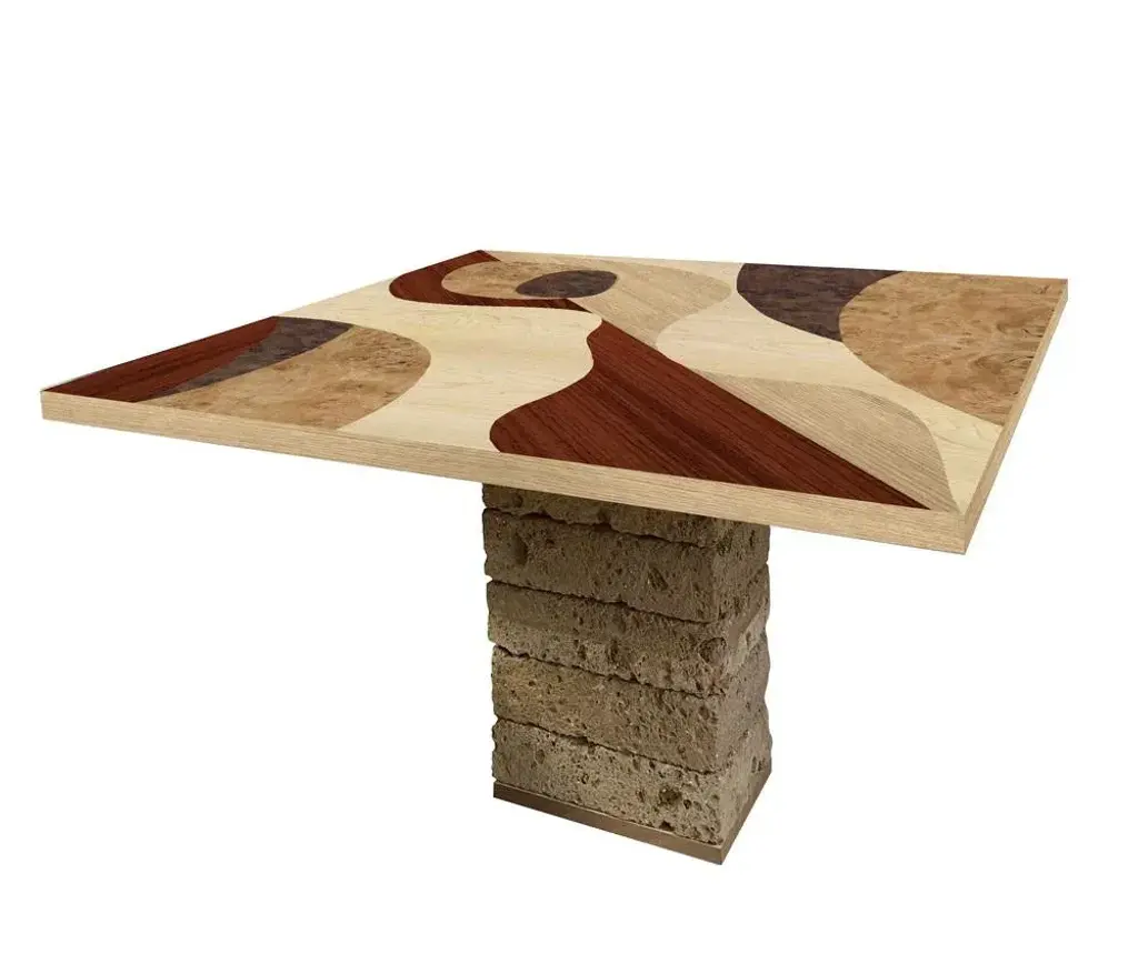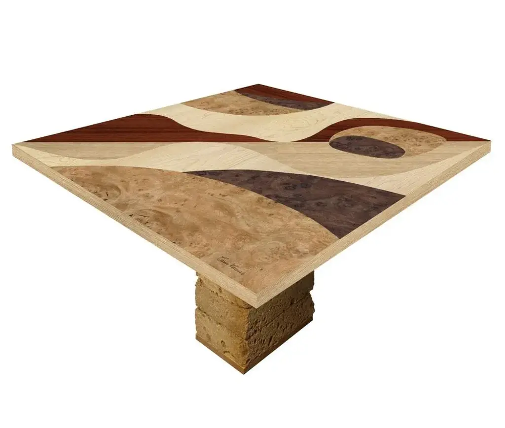 The "TT4" table is part of the "Tarsia Tables" collection. The collection is inspired by the painstaking work of the medieval monastic furnishings. Each table is manually made with artisan techniques handed down over time, each piece is unique. The abstract design refers to the twentieth century cubism. The square top of the table is made of wood with manual inlays of various essences, the base is made up of tuff blocks. Autograph signature and label of the company with date. Labeled by Maker