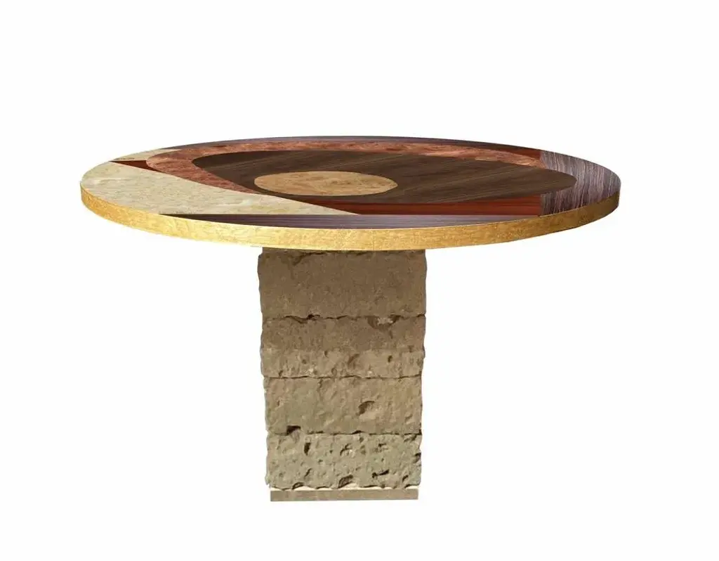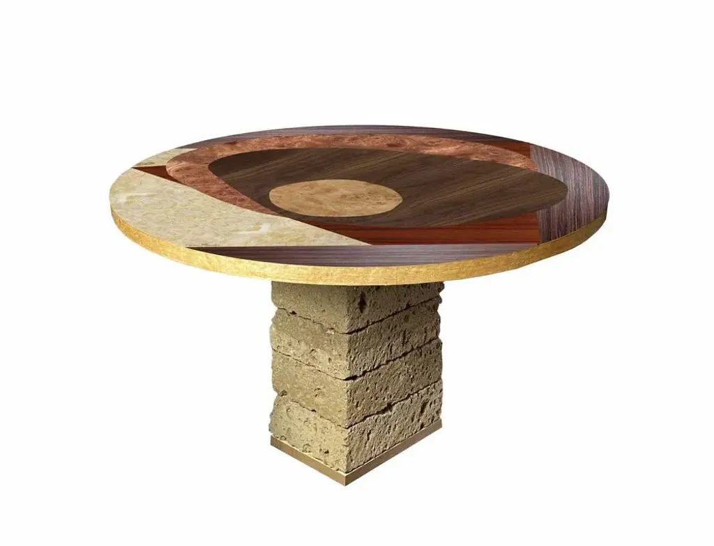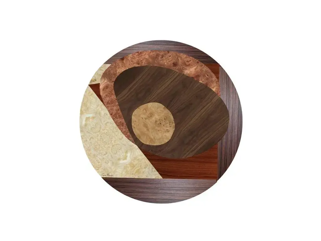 The "TT5" table is part of the "Tarsia Tables" collection. The collection is inspired by the painstaking work of the medieval monastic furnishings. Each table is manually made with artisan techniques handed down over time, each piece is unique. The abstract design refers to the twentieth century cubism. The circular top of the table is made of wood with manual inlays of various essences, the base is made up of blocks of tuff. Autograph signature and label of the company with date. Labeled by Maker