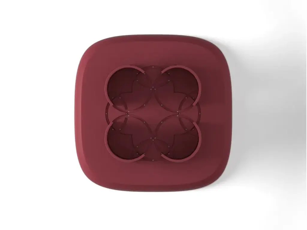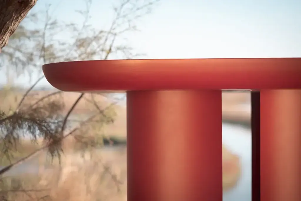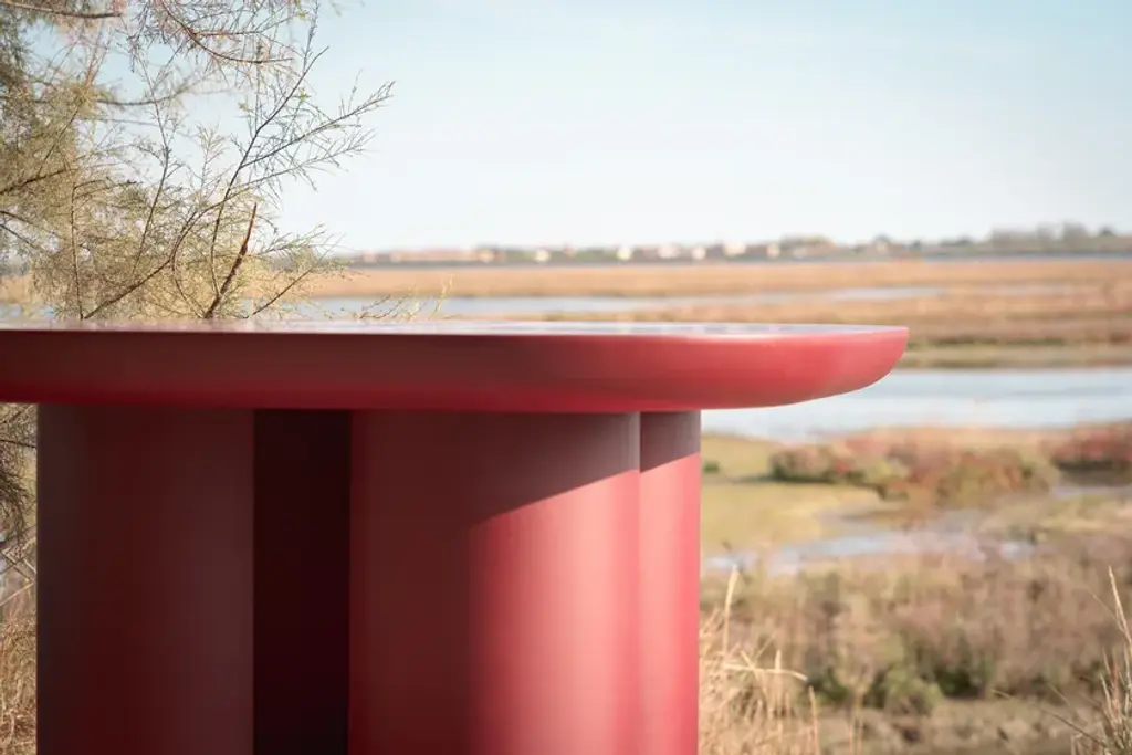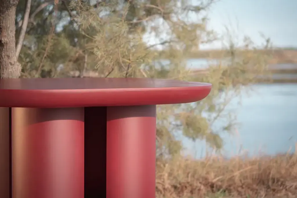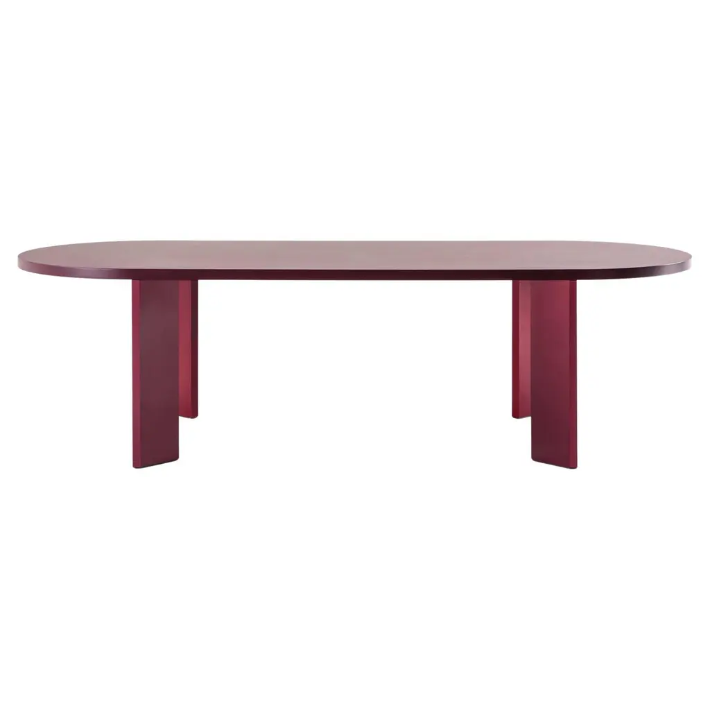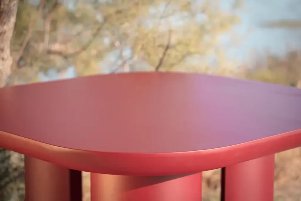 Turno is a square wooden table.“Exquisite melting silken tints, veined roses and pale violets, like the draperies of Veronese, golden orange, yellows, vinous and intense, like Titian’s simarres … undulate, conflict, and lose themselves under the innumerable flaming darts descending from above at every discharge of the sun’s rays.”Hippolyte Taine, Italy Turning identity. An object and its infinite possibilities; unique and unmistakeable, while at the same time constantly different. Like the lagoon landscape, in its infinite nuances of luminous reflections, glare and iridescent colours, the table designed by frattinifrilli – Milanese designer Davide Frattini Frilli – reveals itself to be a piece of furniture with an unmistakeable identity, which simultaneously expresses numerous aspects of its identity.In TURNO, a tabletop with an imposing personality – solid, and at the same time lightweight, entirely similar to a solid sculpture, at the same time refined by the gently rounded forms – houses four supporting elements with semi-circular base, equally compact and decisive in their plastic linearity. The various components of the furniture piece together express an ingenious and surprising mechanism: the legs, rotating on themselves and positioning themselves differently in relation to the surface, indeed going so far as defining numerous different configurations.TURNO is a table which becomes infinite tables: it contains within it the concept of customisation and tailor-made design, and centres on interaction with the space and the relationship with the person choosing it for their own domestic landscape.