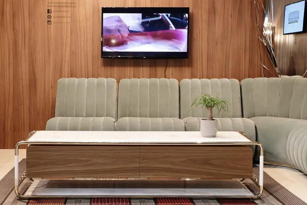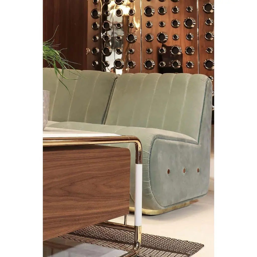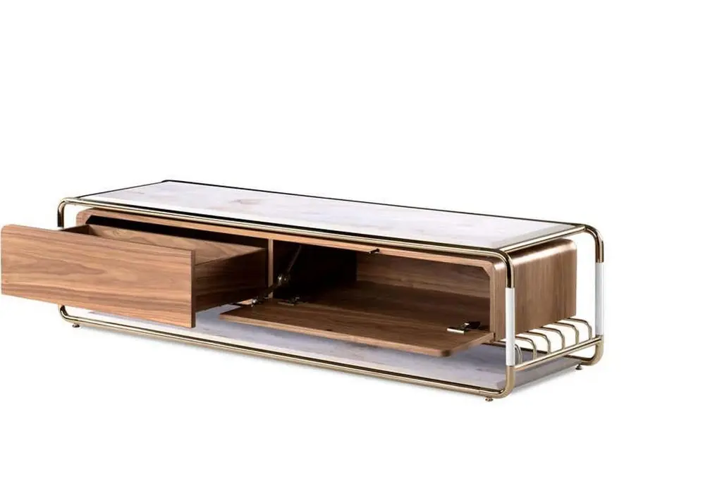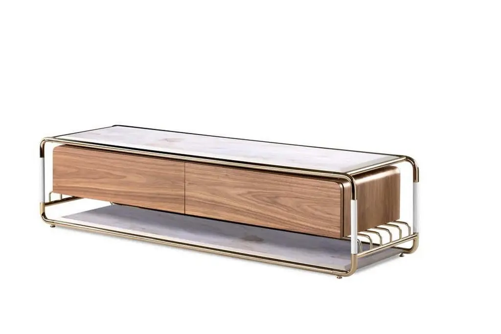 TV table in brass, marble and woodMaterials: polished brass, estremoz marble, glossy white and varnished walnutMeasures: Height 17.41 in. (44.2 cm)Width 19.69 in. (50 cm)Depth 71.26 in. (181 cm). Estimated Production Time:8-9 weeks