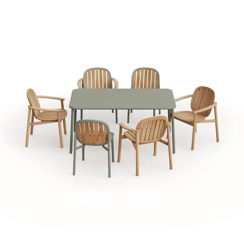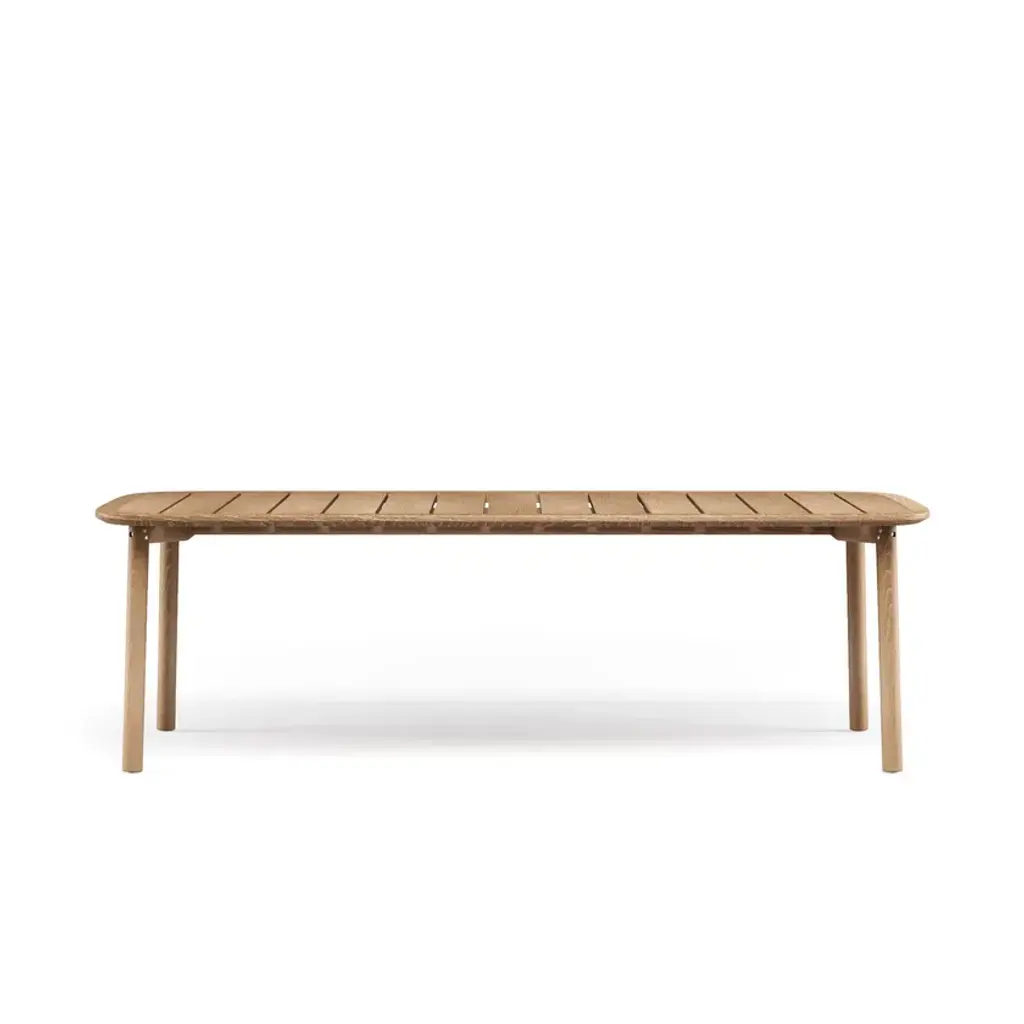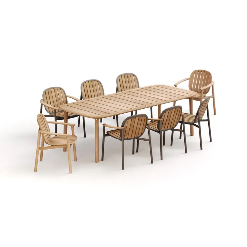 Twins is a 100% FSC teak garden table.Twins is a collection with a strong identity and the result of the perfect blend between the Emu know-how and the designer Sebastian Herkner’s skills. It embodies two twin versions: one is totally in 100% FSC teak, while the other one is an interesting material-mix between pure wood and one of the main components of EMU products: the aluminum.Twins Benefits - FSC 100% Teak, known for its resistance to outdoor use - Products without protective oils, natural finish - Cushions with fixing to the structure to guarantee the correct position of the set - The cushions have a completely removable cover and are made with a water-repellent lining - All structures have adjustable feet - Possibility for different mixing and matching between the 2 versions or with other EMU collections - Even the teak version is suitable for marine environments - The armrest in teak is perfect for hot areas and more comfortable than metal armrests