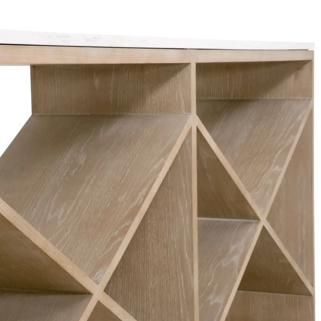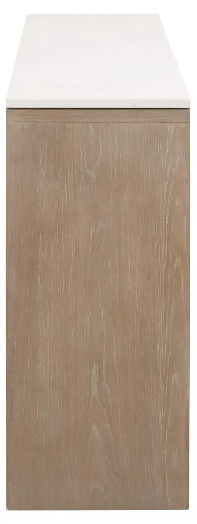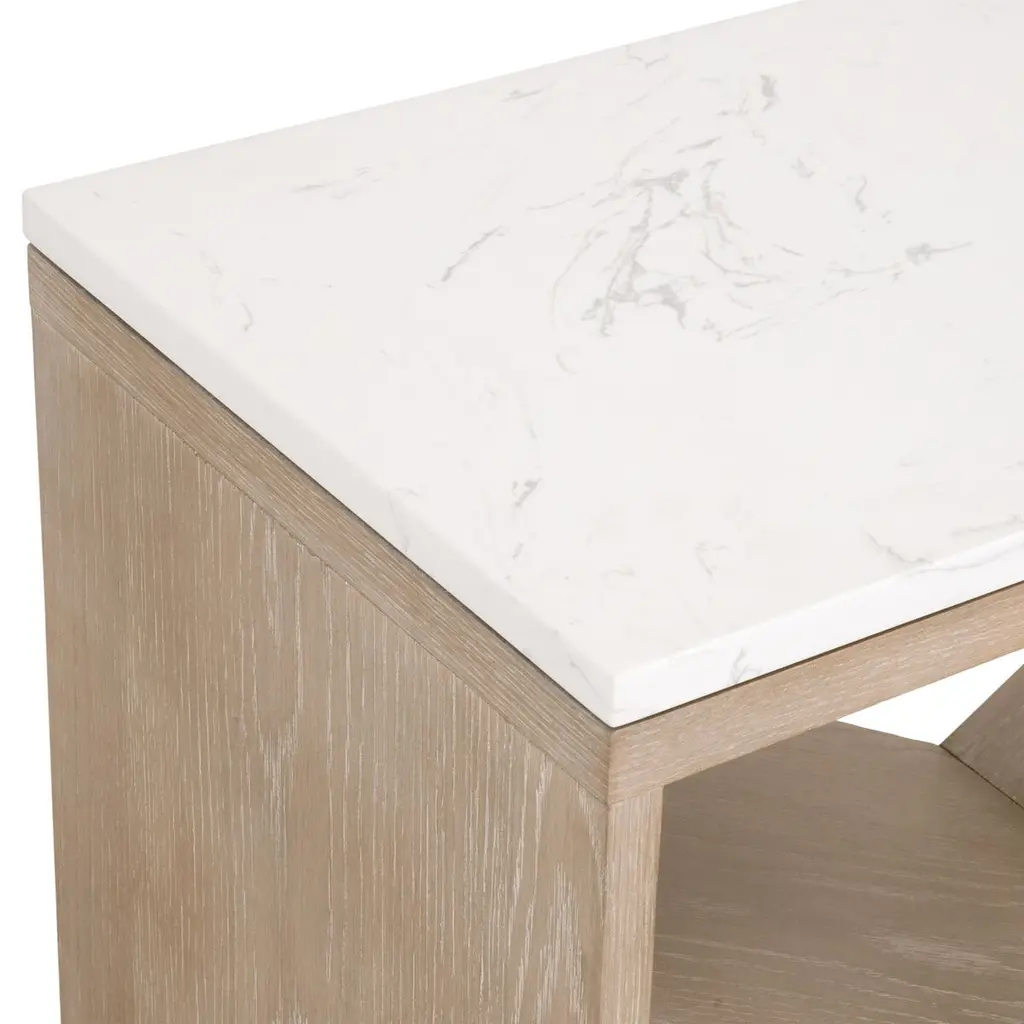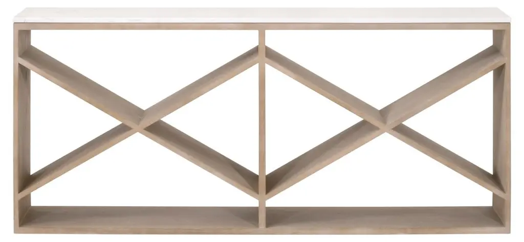 An ideal mix of the rustic and the refined, this console table pairs a quartz top with marblelike veining with a streamlined base crafted of durable, richly figured oak. The open X design of the base allows for storing and displaying items in a striking fashion.
