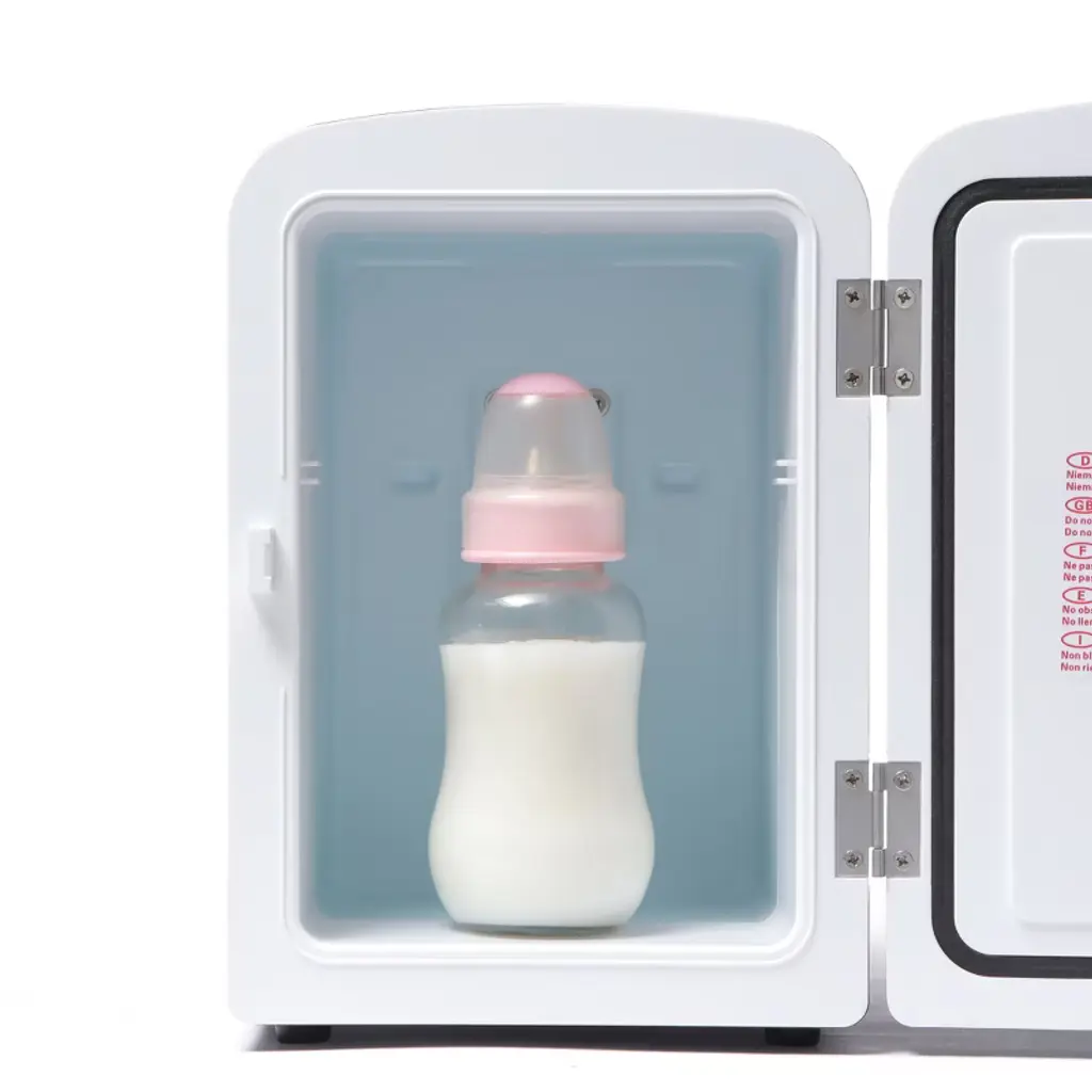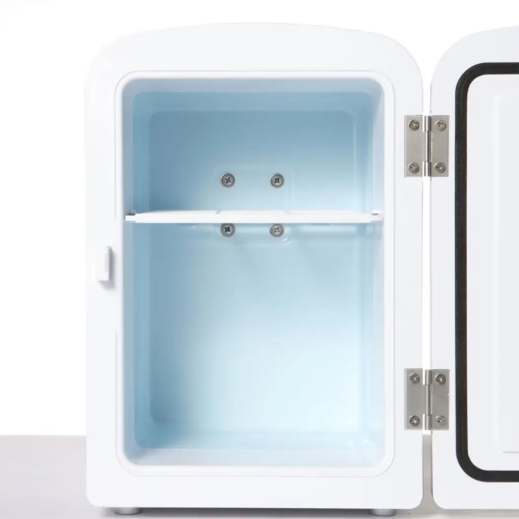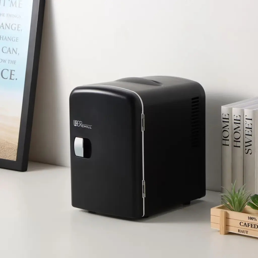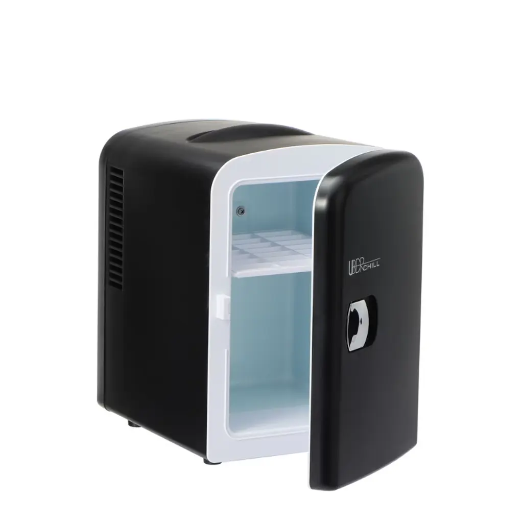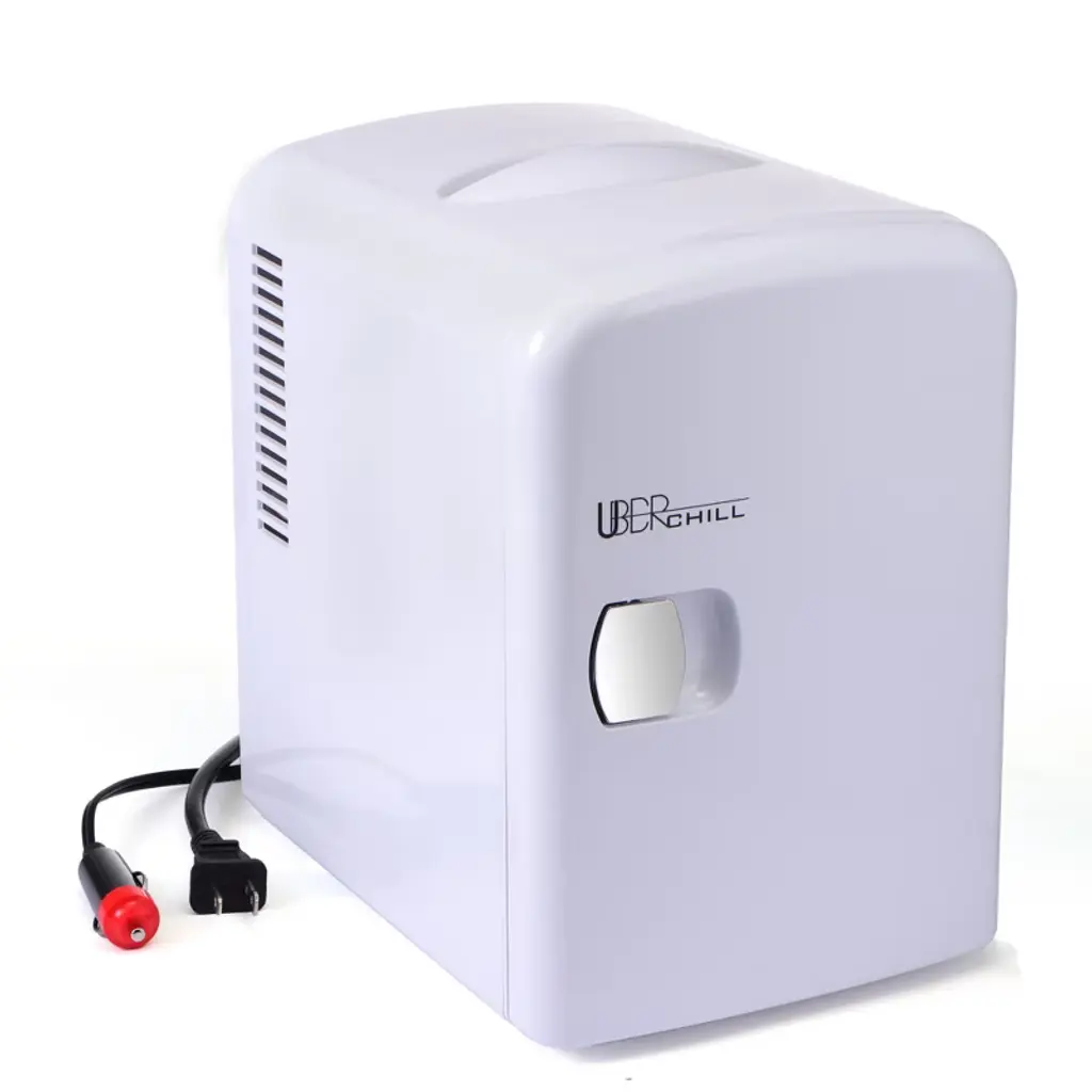 The Uber Appliance personal mini fridge (cooler&warmer) is capable of housing up to 6 cans (12 oz) or 4 bottles (16.9 oz) of your favorite beverage. Cold food and drinks where and when you want them! The sleek retro modenr design works with any decor from modern to traditional. Utilizing state of the art and environmentally friendly thermo-electric peltier technology, this mini fridge is capable of cooling (32 degrees below ambient) or warming (up to 150F) the contents within a few hours, making it convenient in almost any occasion. In addition to this, the portable unit comes with both standard home and car power cables for ultimate portability. Coming in at just 4 lbs, you can literally take it anywhere life takes you! Try it in the bedroom, basement, bathroom dorm room, or your office. With the Uber Appliance mini fridge, you will never find yourself searching past arms length for your favorite drinks and snacks.