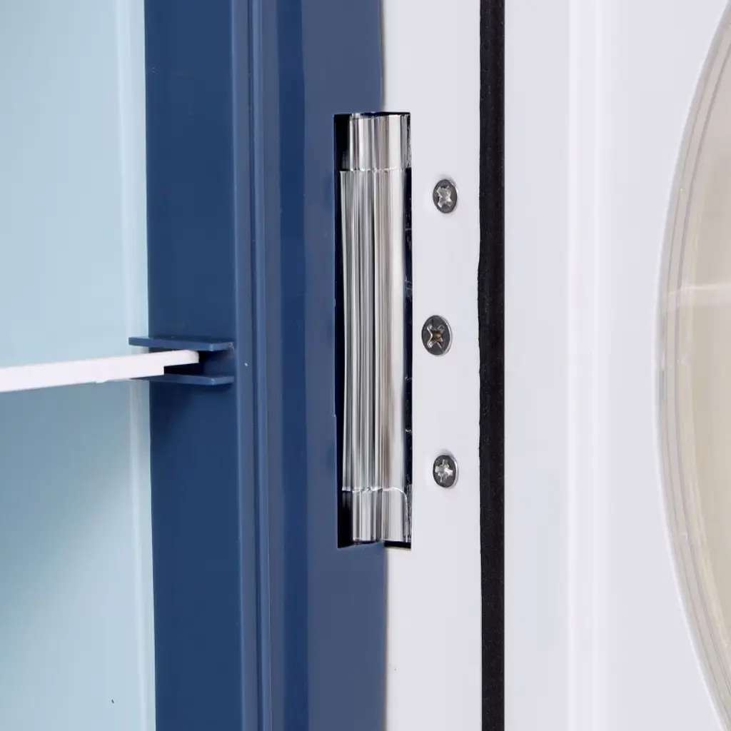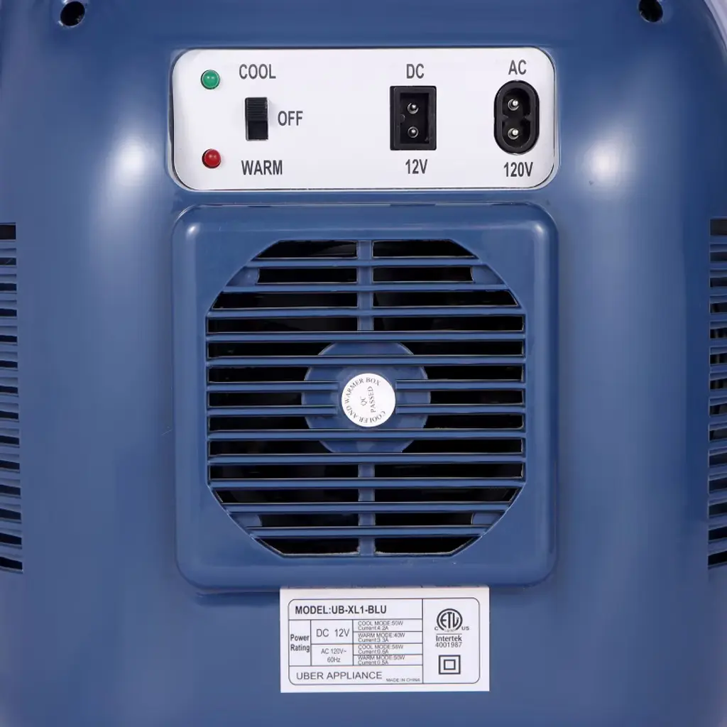 The Uber Appliance Uber Chill XL personal mini fridge (cooler&warmer) is capable of housing up to 12 cans (12 oz) or 9 bottles (16.9 oz) of your favorite beverage. Cold food and drinks where and when you want them! The sleek retro modern design works with any decor from modern to traditional. Utilizing state of the art and environmentally friendly thermo-electric peltier technology, this mini fridge is capable of cooling (32 degrees below ambient) or warming (up to 150F) the contents within a few hours, making it convenient in almost any occasion. In addition to this, the portable unit comes with both standard home and car power cables for ultimate portability. Coming in at just 4 lbs, you can literally take it anywhere life takes you! Try it in the bedroom, basement, bathroom dorm room, or your office. With the Uber Appliance mini fridge, you will never find yourself searching past arms length for your favorite drinks and snacks.