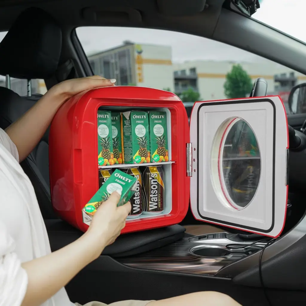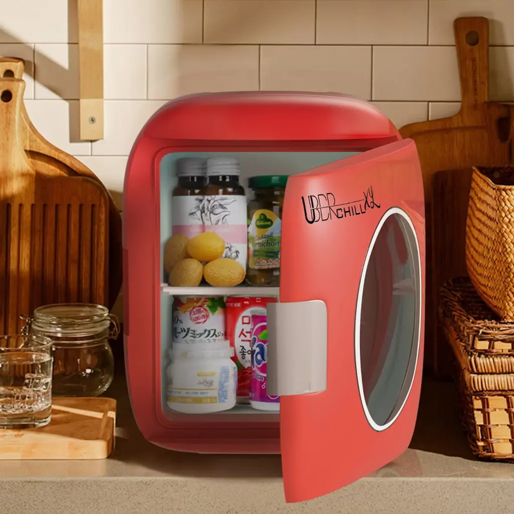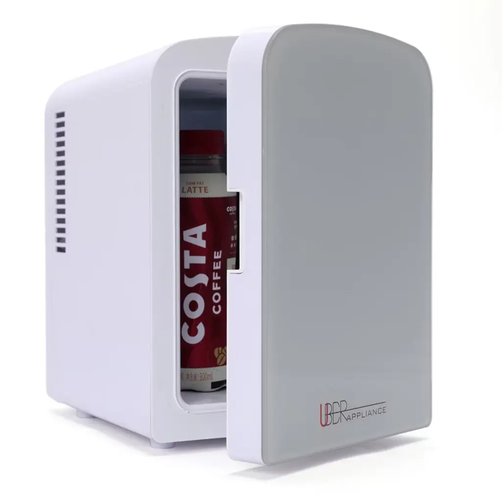 The Uber Appliance Uber Chill XL personal mini fridge (cooler&warmer) is capable of housing up to 12 cans (12 oz) or 9 bottles (16.9 oz) of your favorite beverage. Cold food and drinks where and when you want them! The sleek retro modern design works with any decor from modern to traditional. Utilizing state of the art and environmentally friendly thermo-electric peltier technology, this mini fridge is capable of cooling (32 degrees below ambient) or warming (up to 150F) the contents within a few hours, making it convenient in almost any occasion. In addition to this, the portable unit comes with both standard home and car power cables for ultimate portability. Coming in at just 4 lbs, you can literally take it anywhere life takes you! Try it in the bedroom, basement, bathroom dorm room, or your office. With the Uber Appliance mini fridge, you will never find yourself searching past arms length for your favorite drinks and snacks.